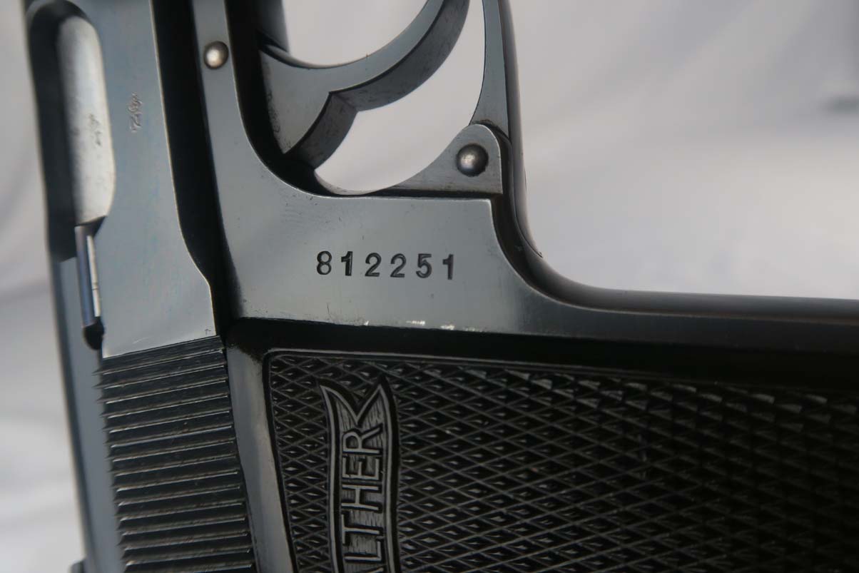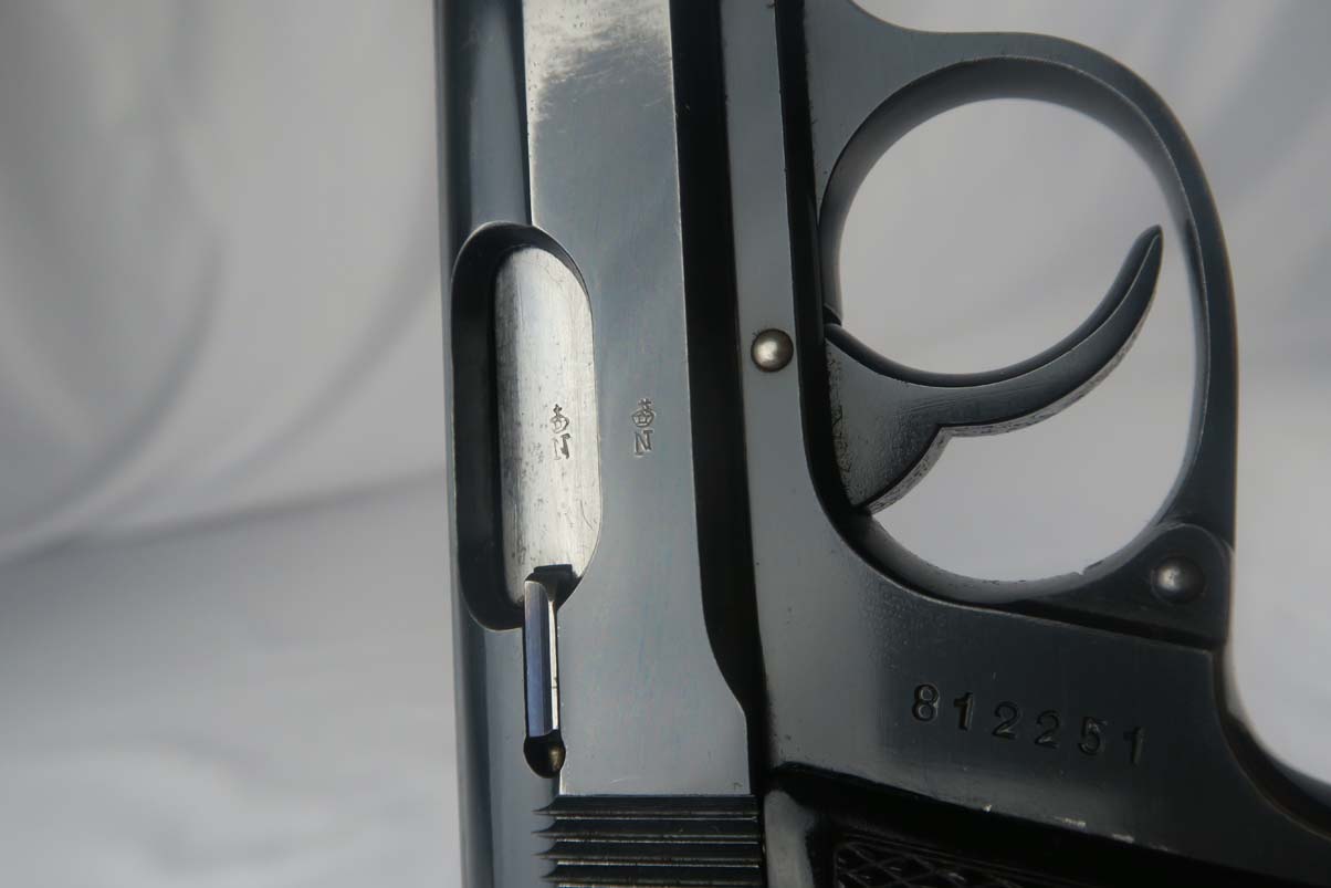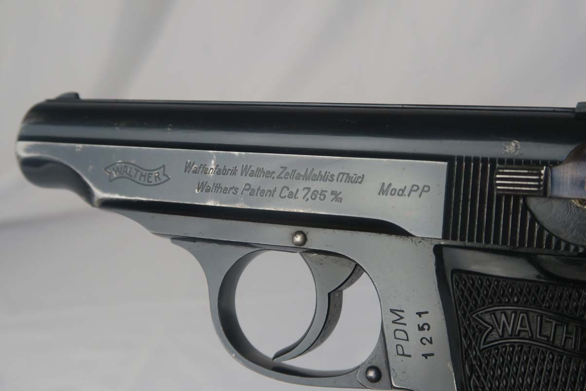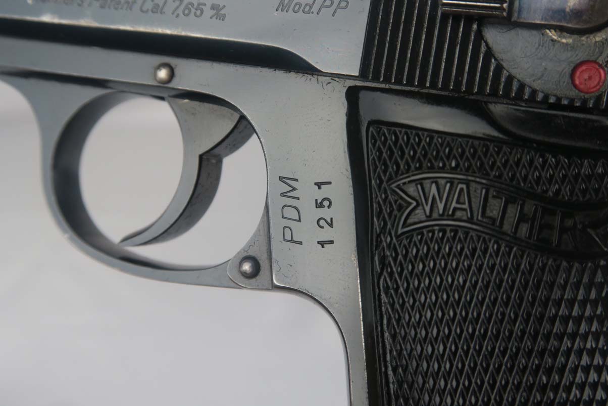 1/26/21 – This is a scarce PDM-marked Walther PP, manufactured in 1935.  The pistol is all correct and original, and the bluing rates at about 92-93% with wear on both sides of the slide and on the bottom of the back strap.   In 1935, Himmler ordered about 1800 PDM marked PP’s as head of all German Internal Security. PDM indicates issue to the Police Department of Munich, and the order was unique for the following reasons. These pistols came with a bottom release magazine, while all other 7.65mm PP’s had a push button mag release. The proper PDM magazine will have no notch for the push button release, which the magazine in this listing shows.  This pistol falls in the correct range and has proper features.  The last three digits of the serial match the last three of the marking next to the PDM proof, as they should.  It is an early banner mag with a nice black finger extension.  The bore shows some use but has no frosting or pitting.