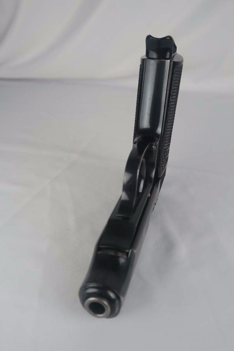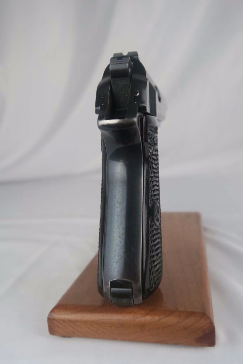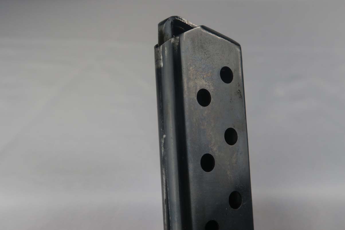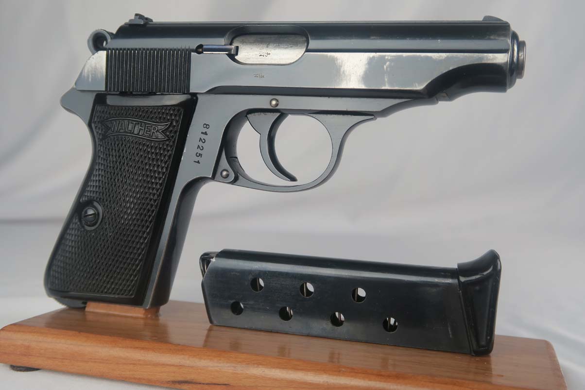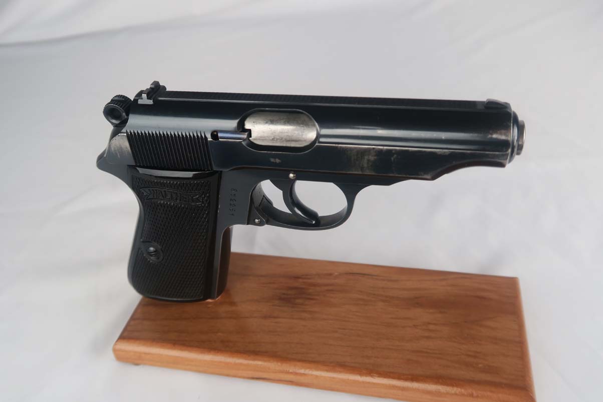 1/26/21 – This is a scarce PDM-marked Walther PP, manufactured in 1935.  The pistol is all correct and original, and the bluing rates at about 92-93% with wear on both sides of the slide and on the bottom of the back strap.   In 1935, Himmler ordered about 1800 PDM marked PP’s as head of all German Internal Security. PDM indicates issue to the Police Department of Munich, and the order was unique for the following reasons. These pistols came with a bottom release magazine, while all other 7.65mm PP’s had a push button mag release. The proper PDM magazine will have no notch for the push button release, which the magazine in this listing shows.  This pistol falls in the correct range and has proper features.  The last three digits of the serial match the last three of the marking next to the PDM proof, as they should.  It is an early banner mag with a nice black finger extension.  The bore shows some use but has no frosting or pitting.