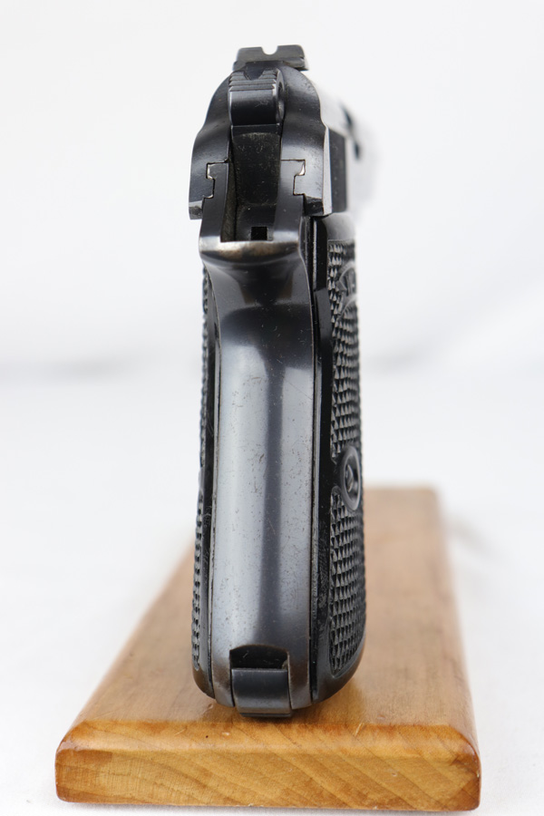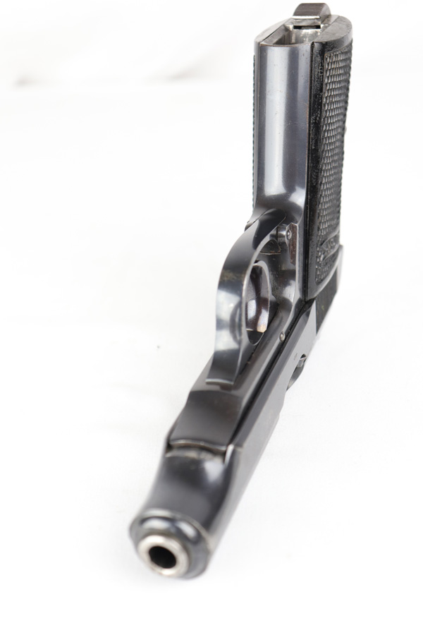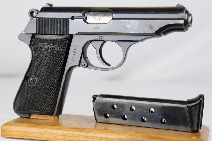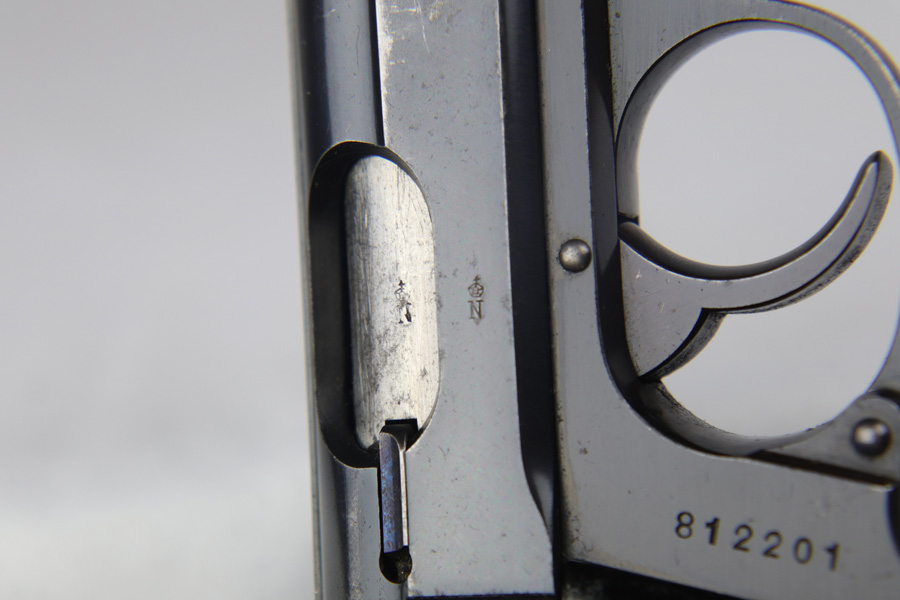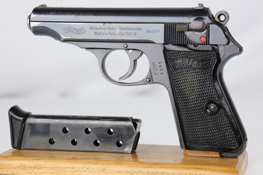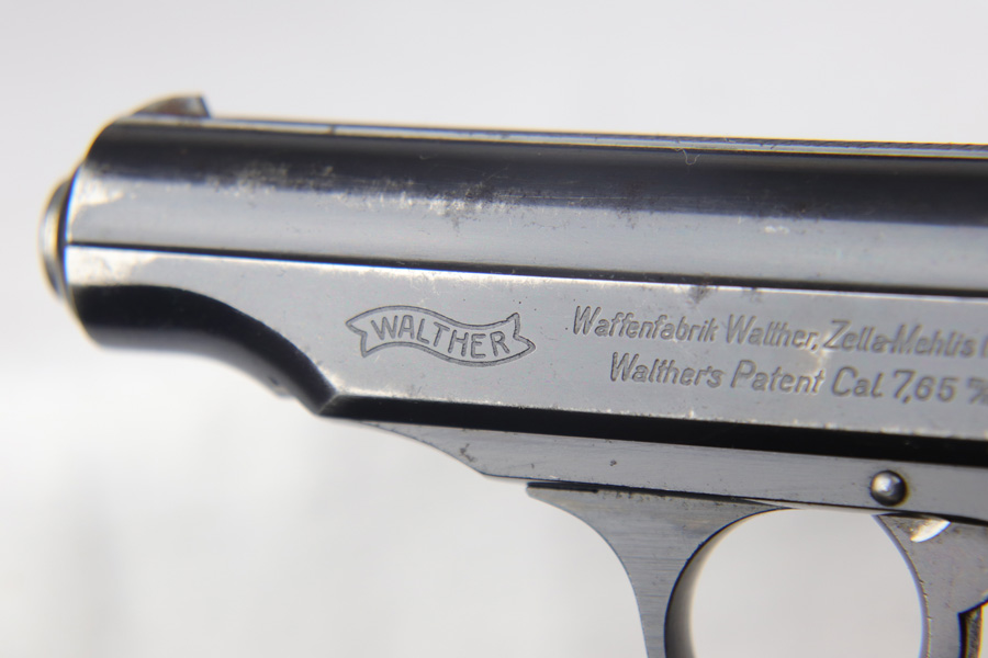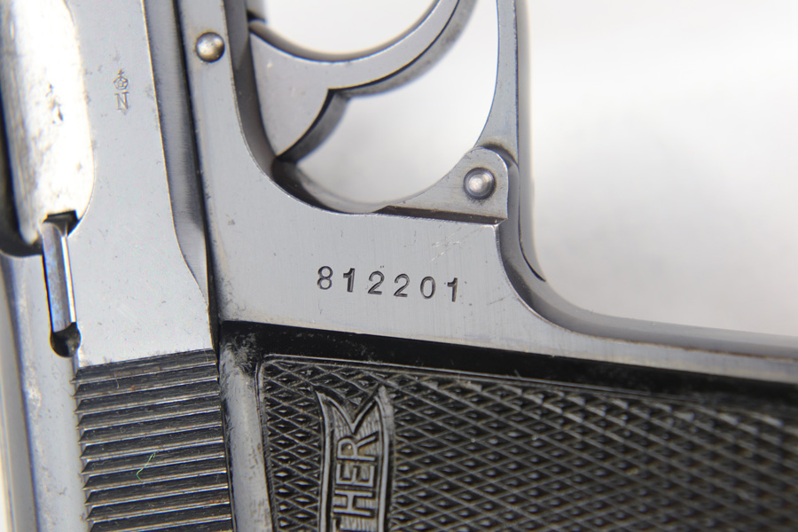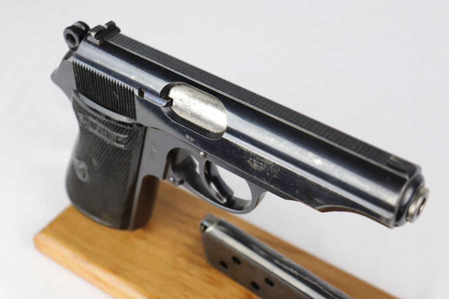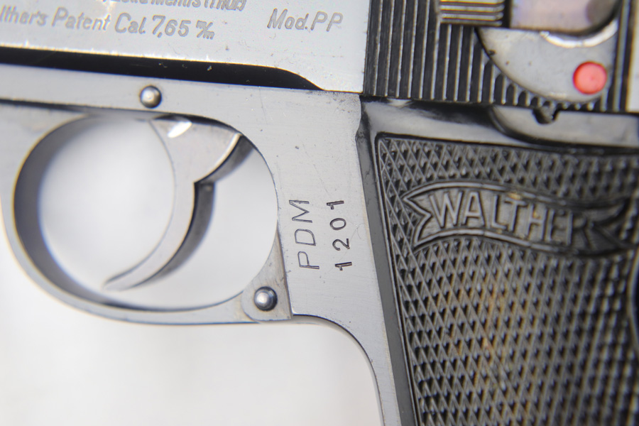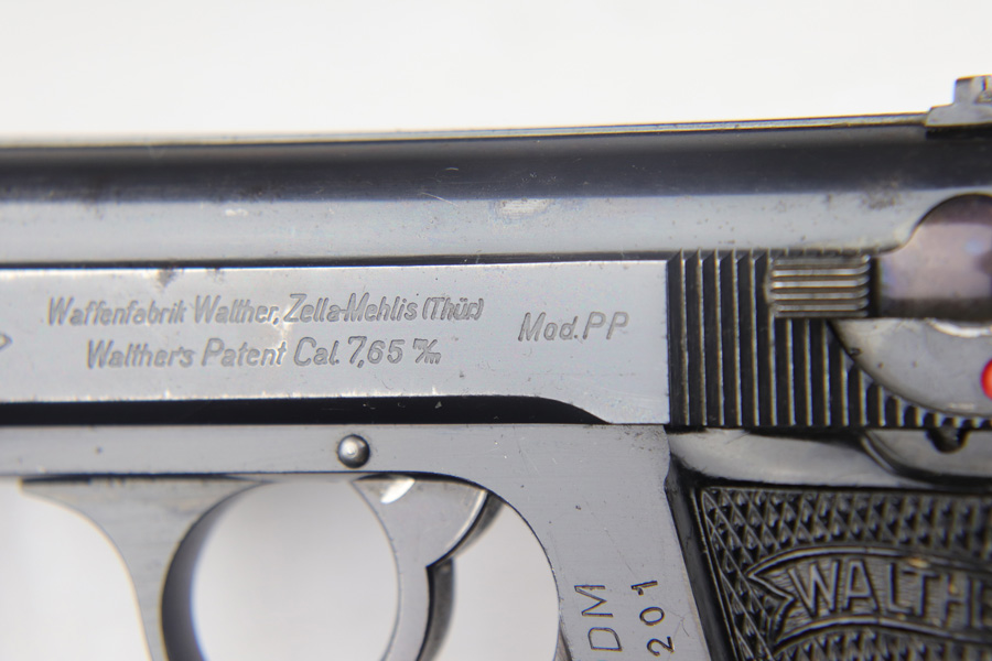 11/2/18 – This is a rare PDM Walther PP, manufactured around 1935. The pistol is all correct and original, and the bluing rates at about 85% with the majority of finish loss found on either side of the slide. There is also minor patination of the straps. In 1935, Himmler ordered about 1800 PDM marked PP’s as head of all German Internal Security. PDM stands for Police Department of Munich, and the order was unique for the following reasons. These pistols came with a bottom release magazine, while all other 7.65mm PP’s had a push button mag release. The proper PDM magazine will have no notch for the push button release, which the magazine in this listing shows. These pistols also have a strengthened ‘fluted’ barrel, visible on the muzzle end of the barrel, which a standard PP slide would not fit. This pistol falls in the correct serial range. Excellent bore.