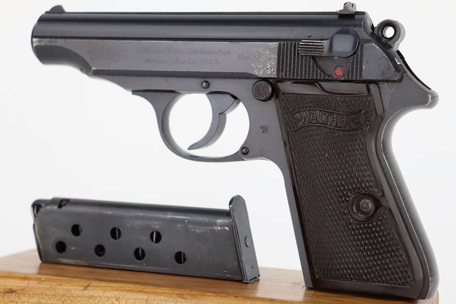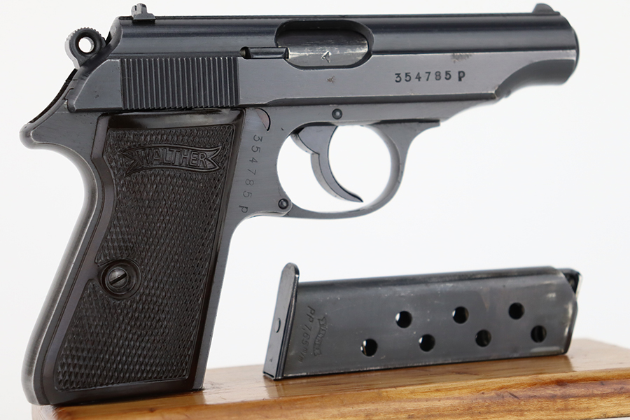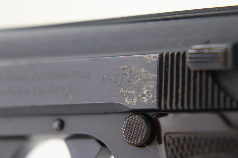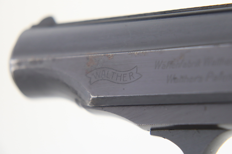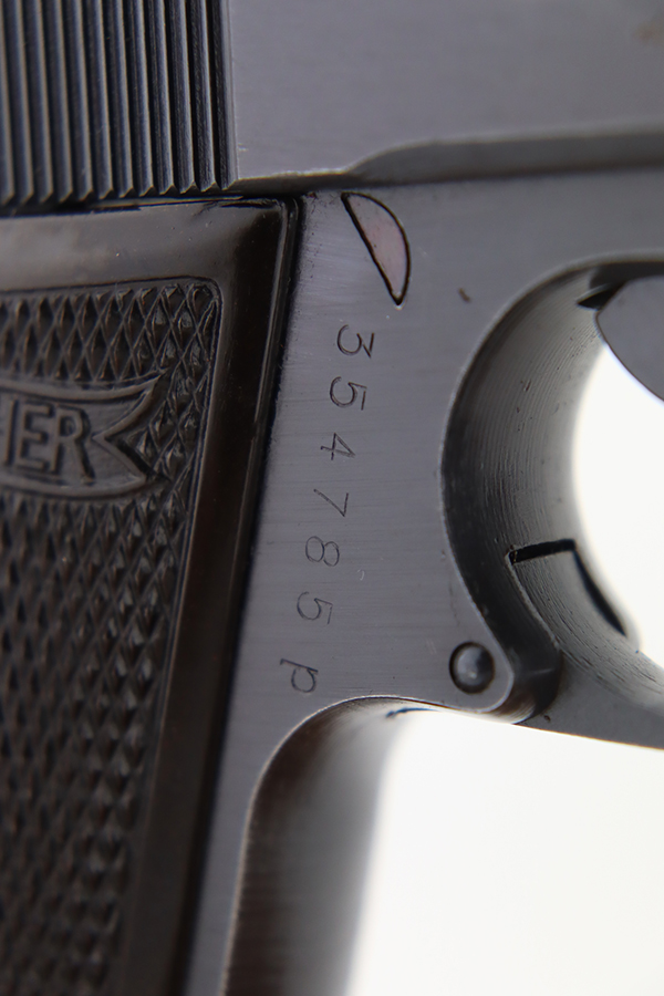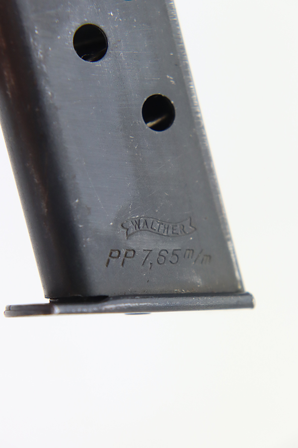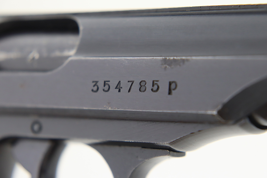 1/31/24 – This is an excellent example of a scarce late-war Walther PP rig issued to the Nazi police in 1944. It is all matching and has the proper police “Eagle F” proof. This police “Eagle F” variation is scarce as only about 5,000 were made. This gun also comes with scarce brownish bakelite grips. It has retained about 97% of its original finish with a couple of small spots of discoloration and pin-pricking on the left side of the slide. Besides these spots, the gun is virtually mint. Comes with a proper wartime magazine. Mint bore.