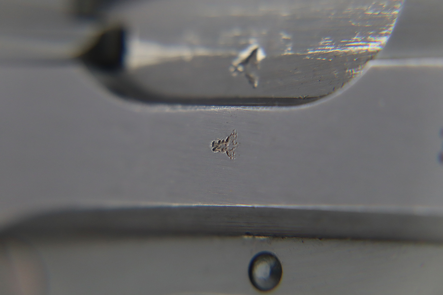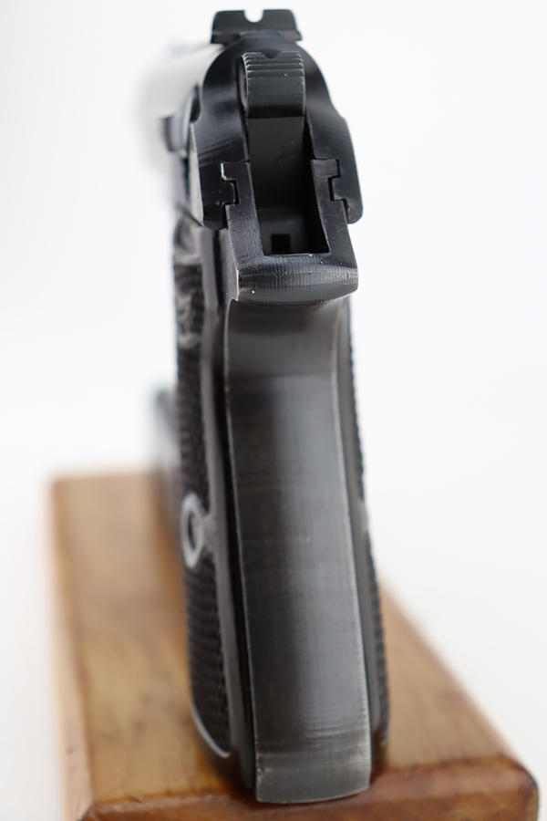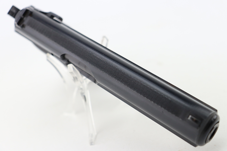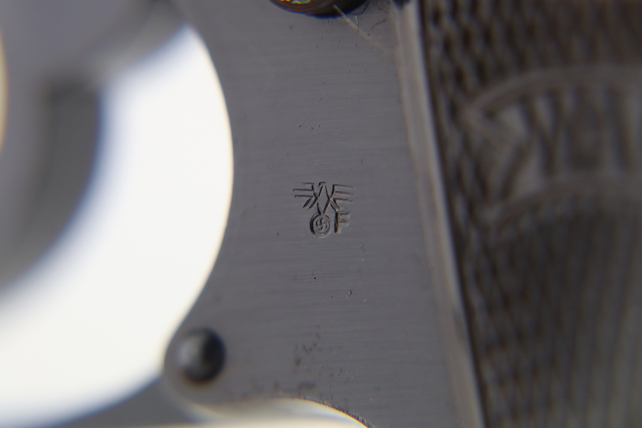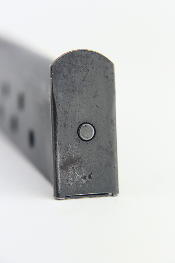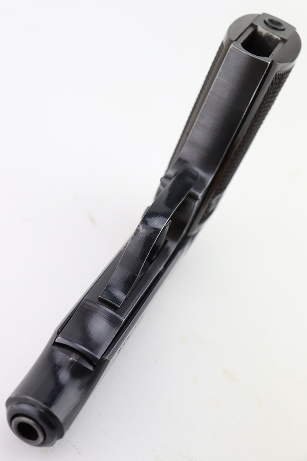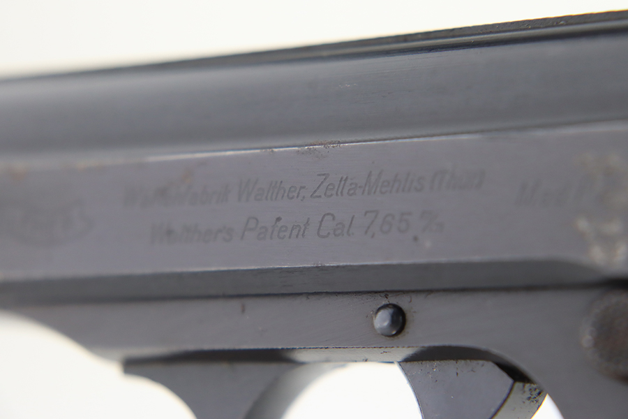 1/31/24 – This is an excellent example of a scarce late-war Walther PP rig issued to the Nazi police in 1944. It is all matching and has the proper police “Eagle F” proof. This police “Eagle F” variation is scarce as only about 5,000 were made. This gun also comes with scarce brownish bakelite grips. It has retained about 97% of its original finish with a couple of small spots of discoloration and pin-pricking on the left side of the slide. Besides these spots, the gun is virtually mint. Comes with a proper wartime magazine. Mint bore.
