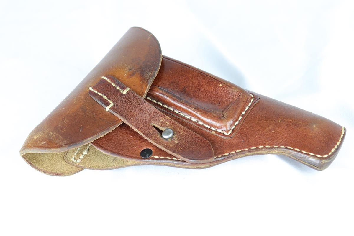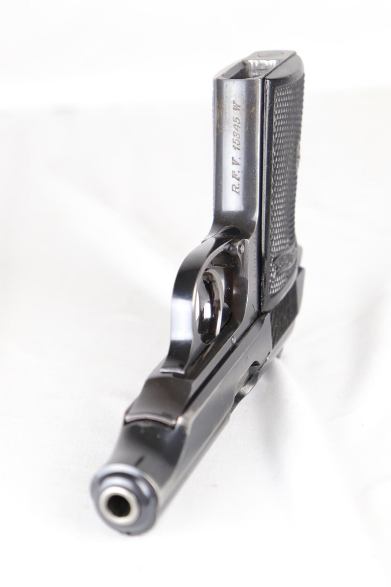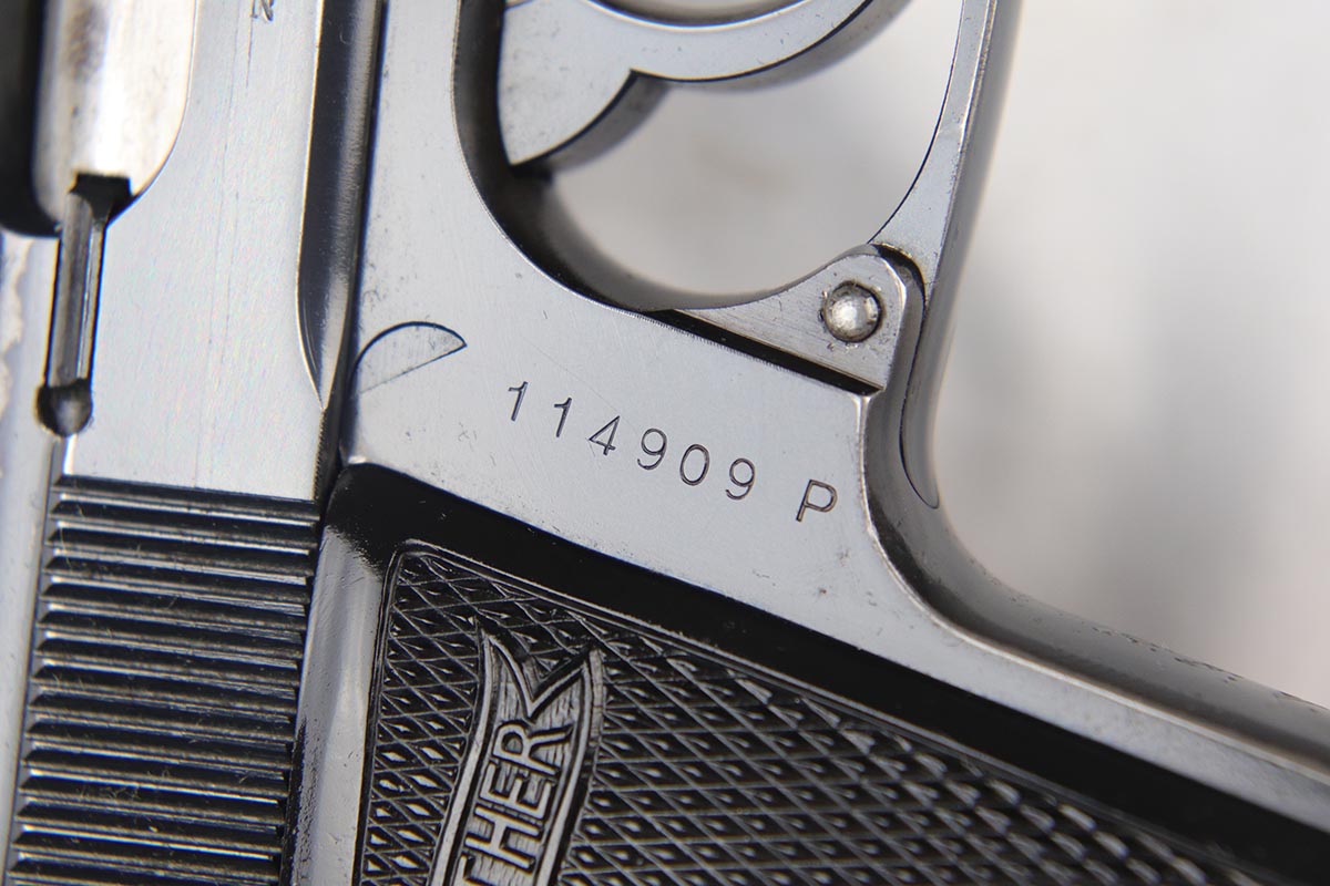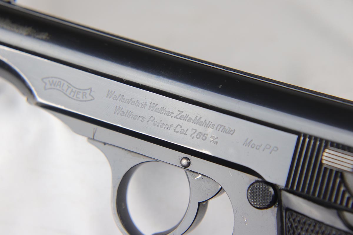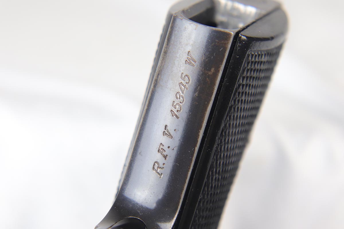 4/26/18 – This is a scarce Walther PP that is RFV marked on the front strap, denoting issue to the Reich’s Financial Administration.  The pistol is matching and original with about 85-90% high-polish blue remaining.  It has wear on the rounded portion of the slide, and thin straps.  Excellent grips and a strong bore.  Comes with a ’42 dated holster in excellent condition.