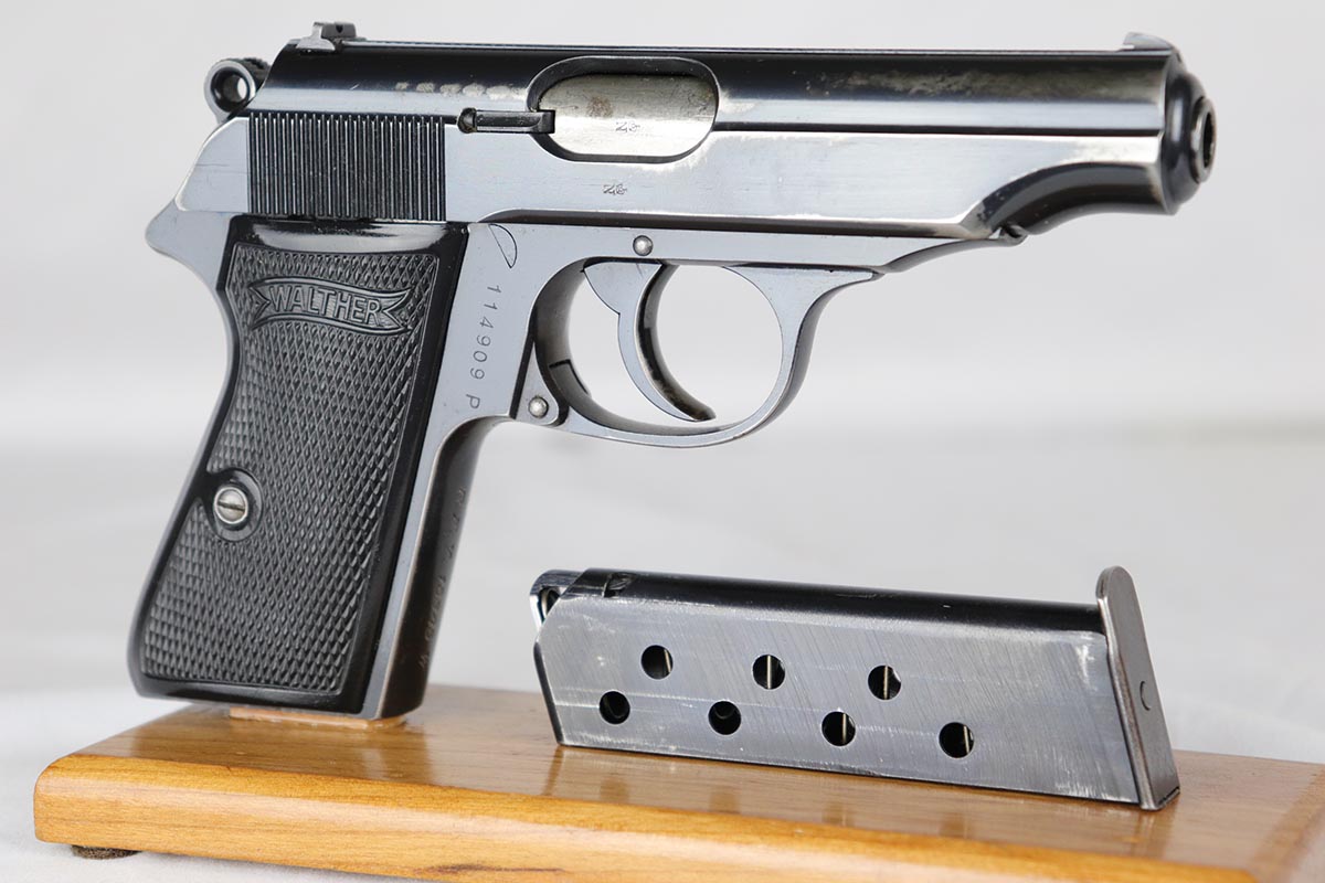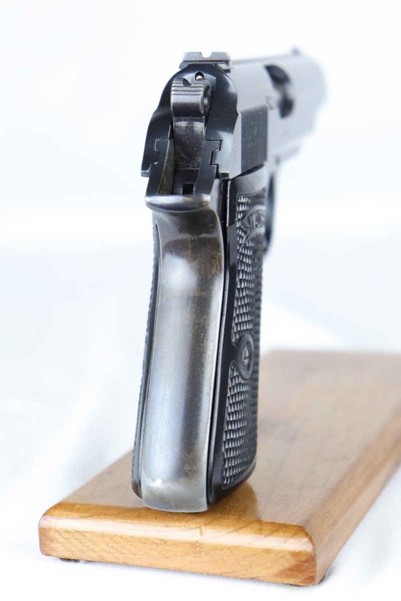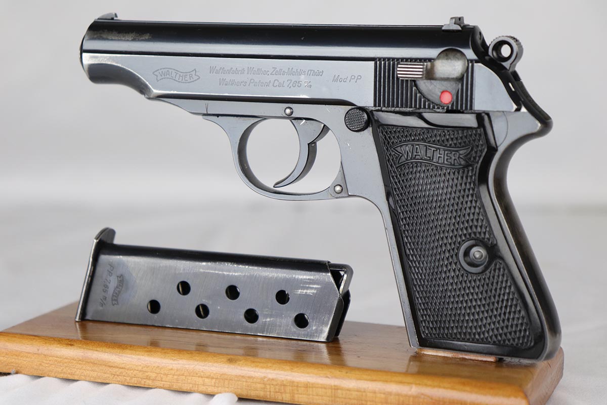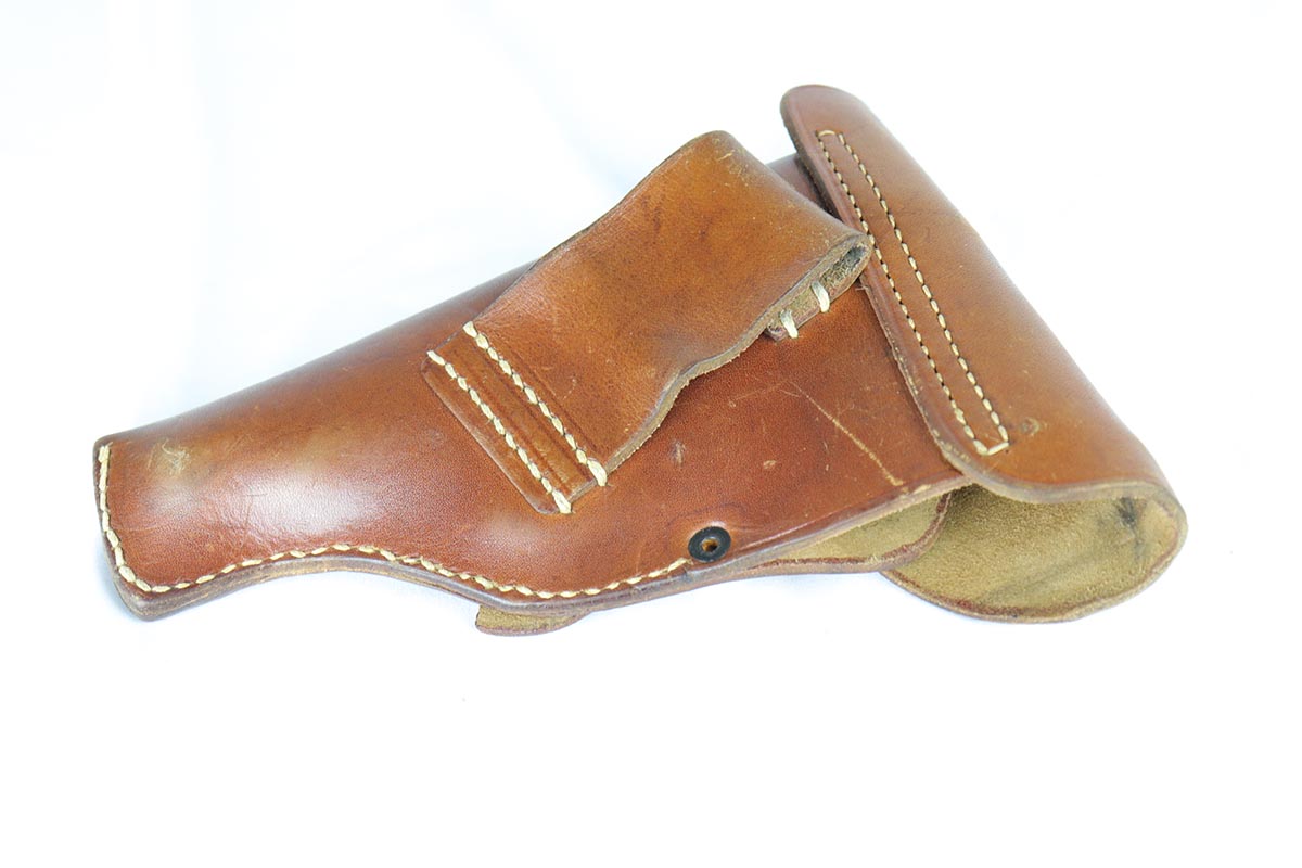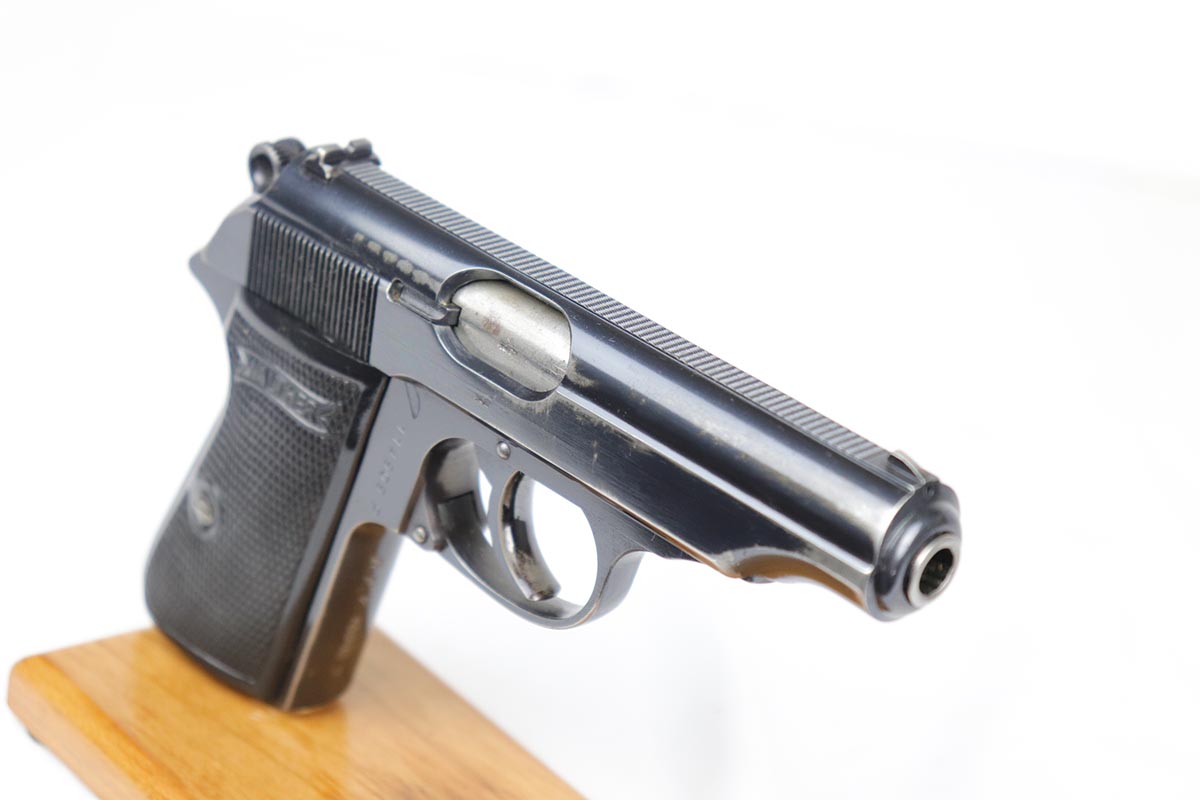4/26/18 – This is a scarce Walther PP that is RFV marked on the front strap, denoting issue to the Reich’s Financial Administration.  The pistol is matching and original with about 85-90% high-polish blue remaining.  It has wear on the rounded portion of the slide, and thin straps.  Excellent grips and a strong bore.  Comes with a ’42 dated holster in excellent condition.