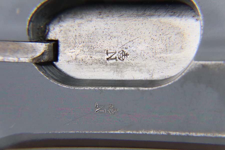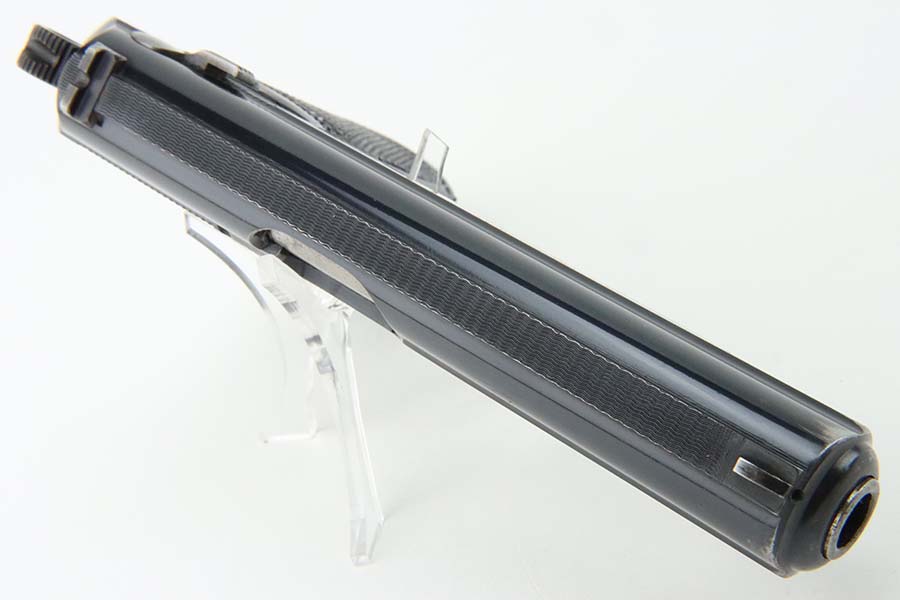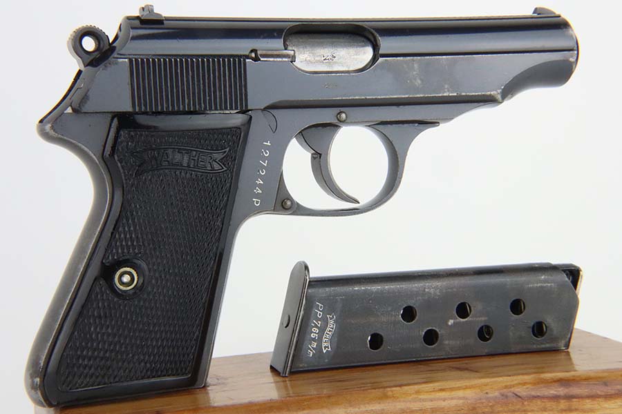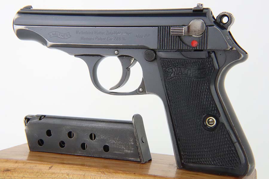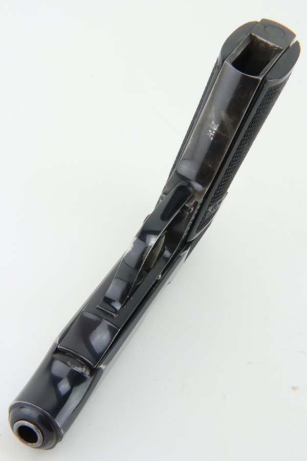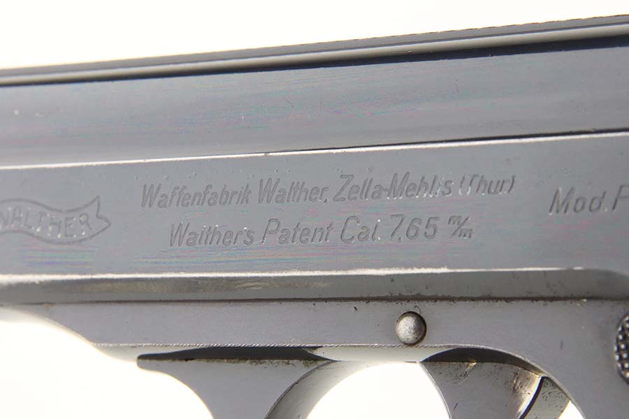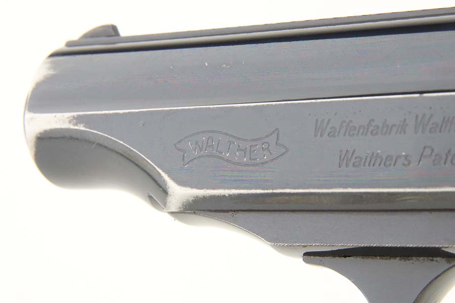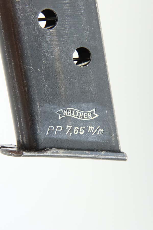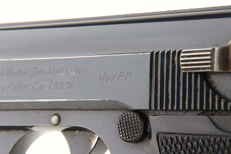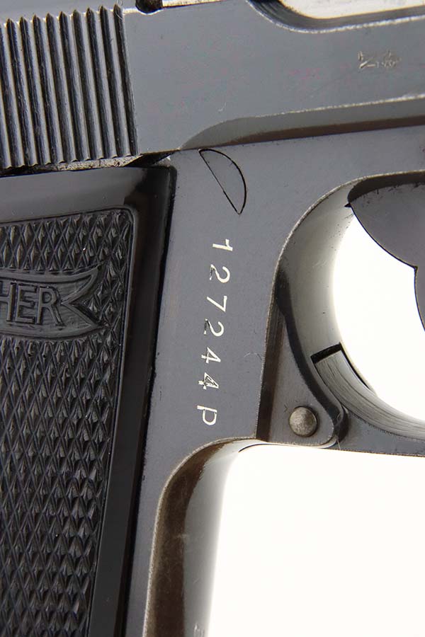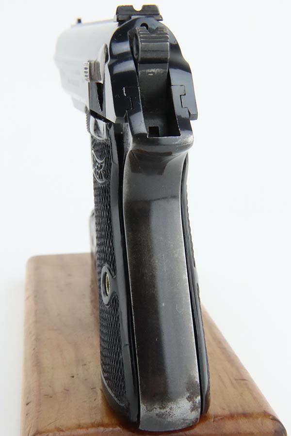 3/14/24 – This is a scarce Walther PP with RJ marking on front strap to denote issue to the Reich Justice Ministry. There were fewer than 5,000 of this variation produced, and this one has roughly 85% of the original, high-polish blue remaining. The majority of the finish loss is on the grip straps, but there is also some muzzle wear and an area of wear on the right side of the slide. Fitted with period-correct black bakelite grips – some cracking along the edge of the left panel. Comes with a wartime magazine. Minty bore.