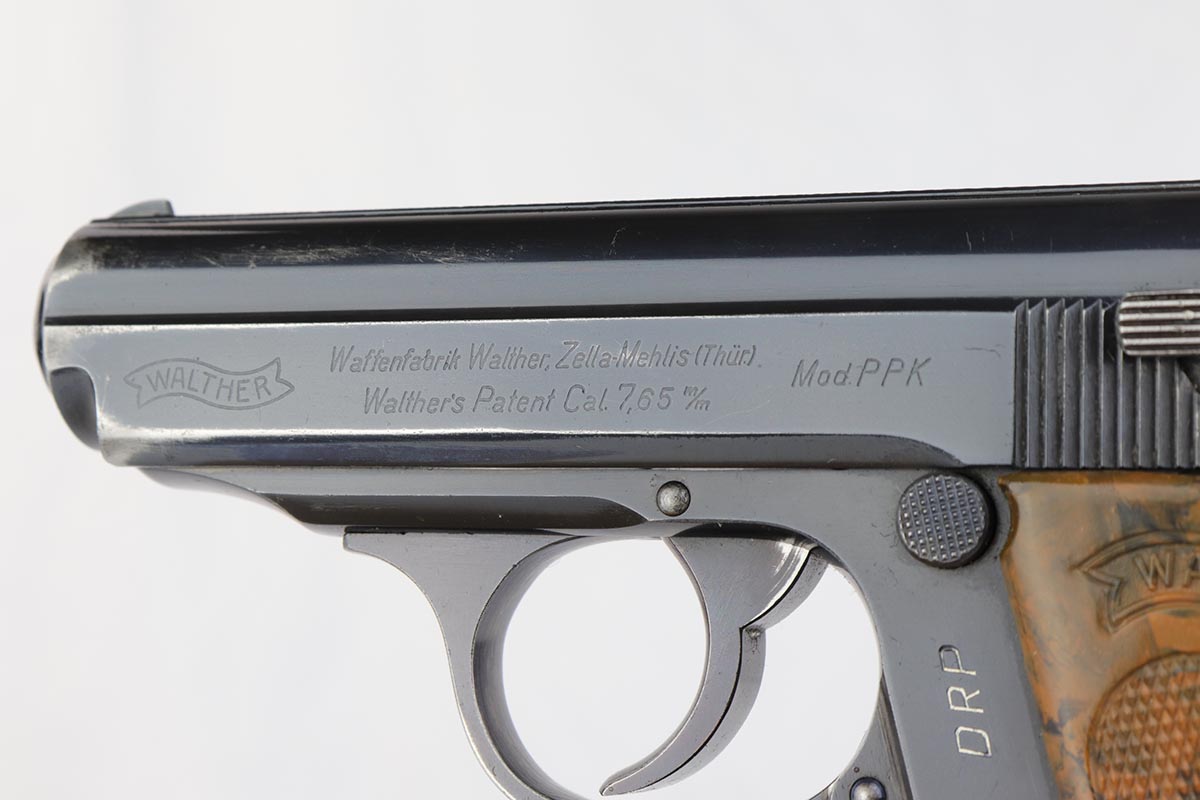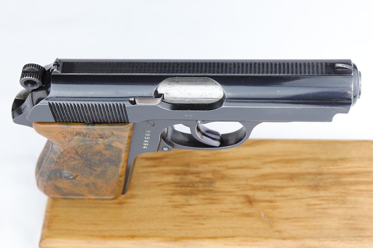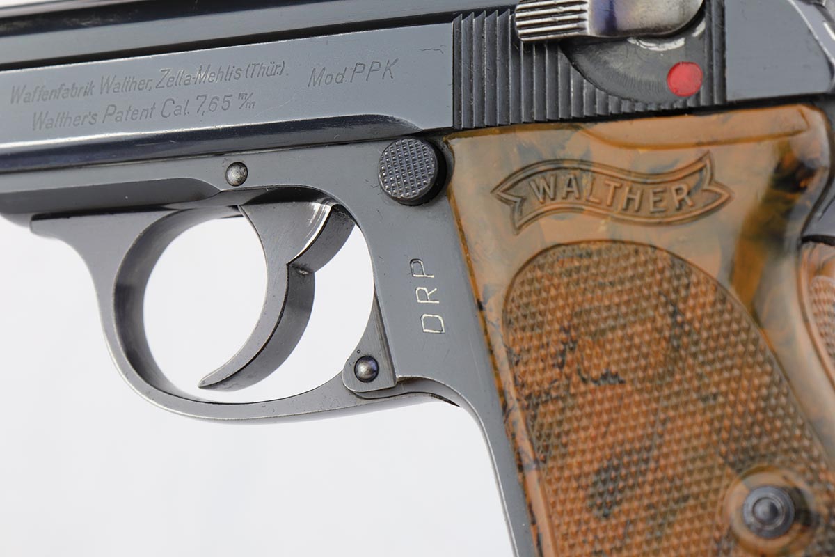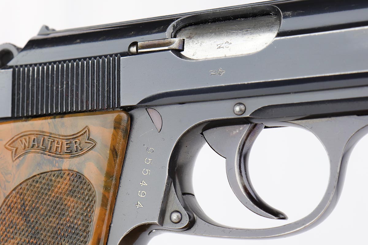3/27/19 – This is a rare Walther DRP marked PPK from the Nazi era. These pistols were issued to the German Post Office (Deutsche Reich Post). The original high-polish finish is about 95% with the majority of finish loss on the trigger guard and the left side slide. The pistol has crown/N proofs and a matching slide. Comes with a Walther Banner finger extension magazine. Mint bore and excellent grip without cracks. DRP variation falls in a narrow serial range and this one is correct for this variation – 955xxx. 90 degree safety.