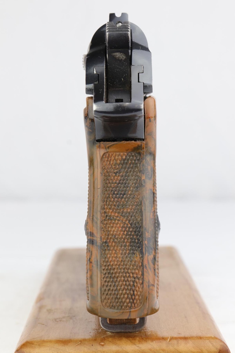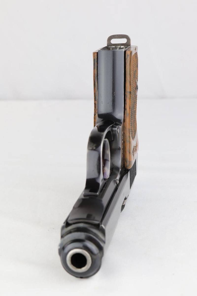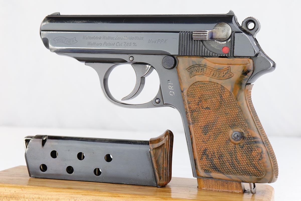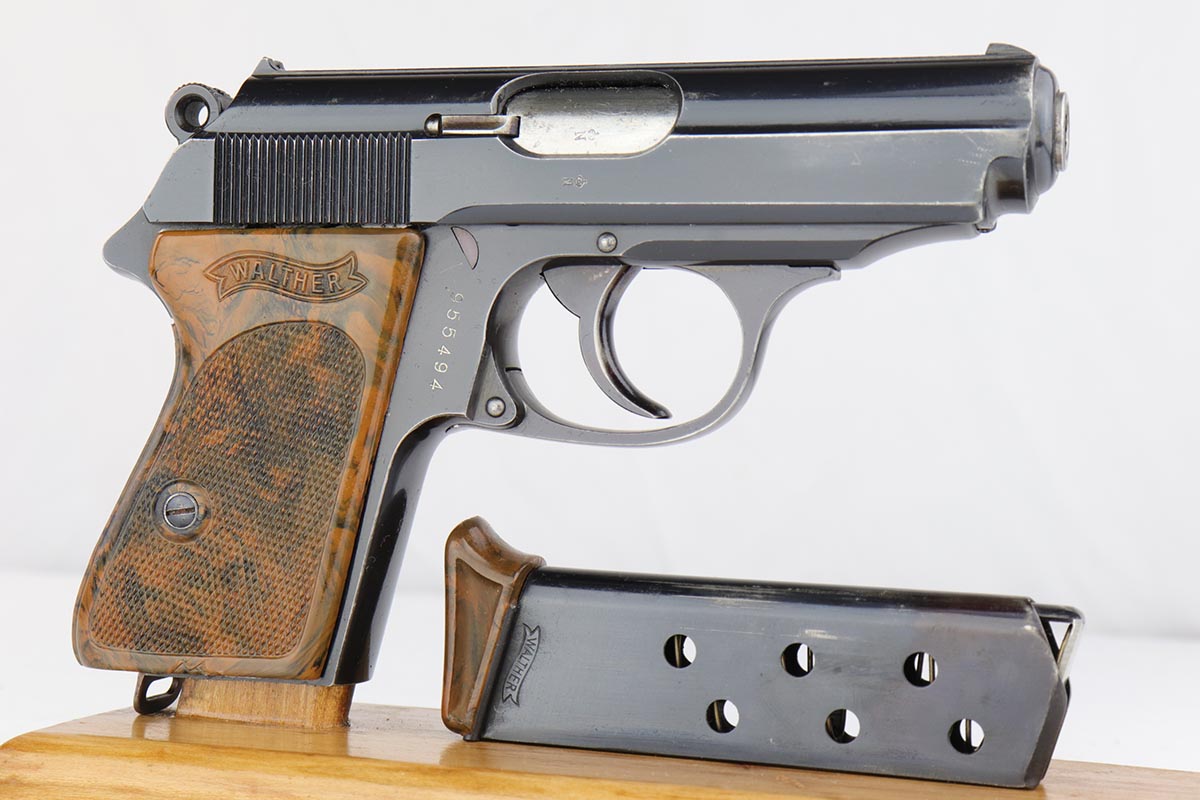 3/27/19 – This is a rare Walther DRP marked PPK from the Nazi era. These pistols were issued to the German Post Office (Deutsche Reich Post). The original high-polish finish is about 95% with the majority of finish loss on the trigger guard and the left side slide. The pistol has crown/N proofs and a matching slide. Comes with a Walther Banner finger extension magazine. Mint bore and excellent grip without cracks. DRP variation falls in a narrow serial range and this one is correct for this variation – 955xxx. 90 degree safety.