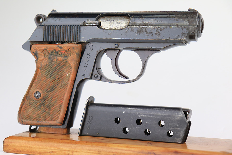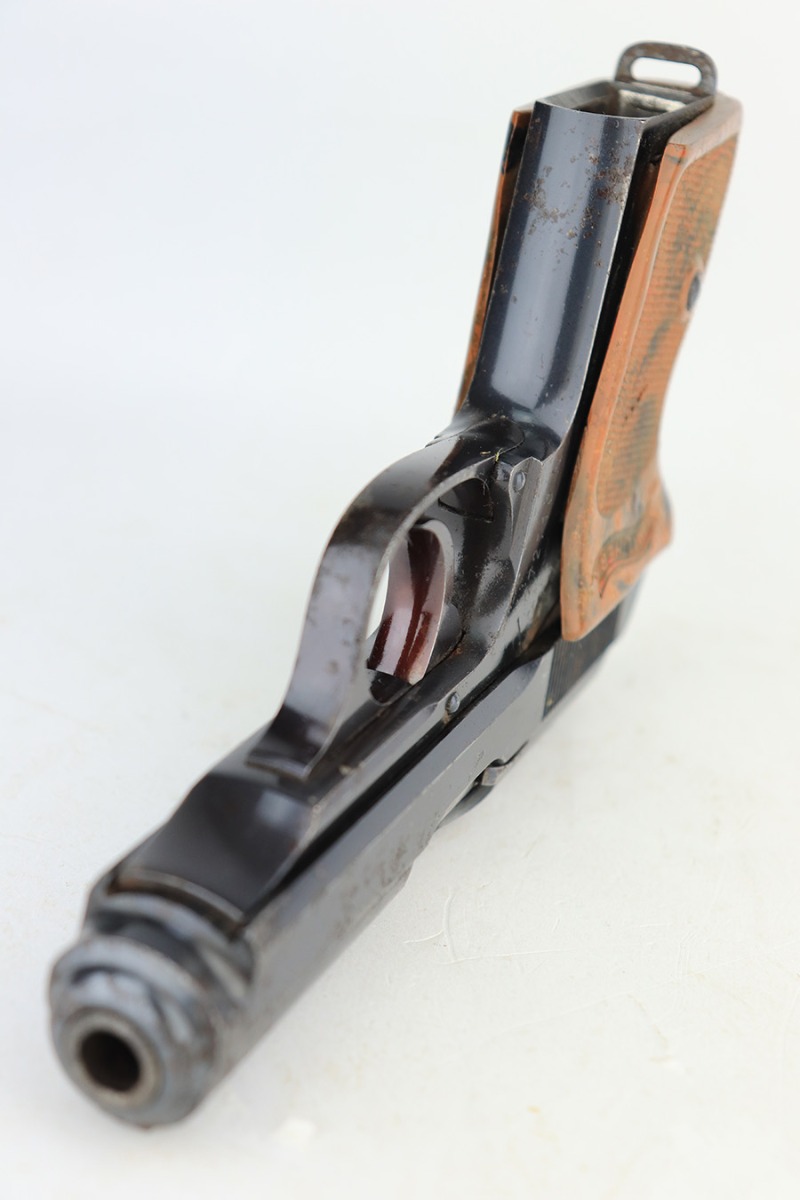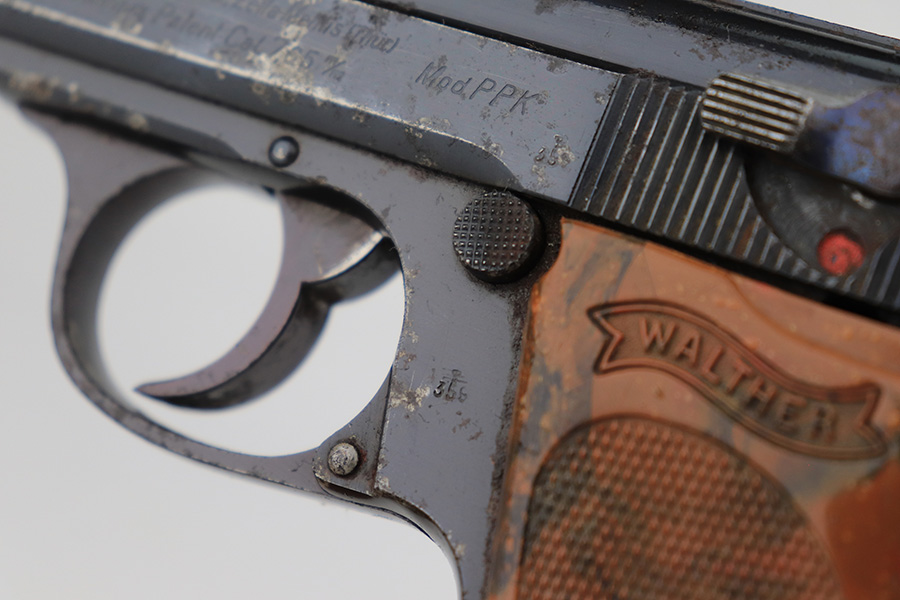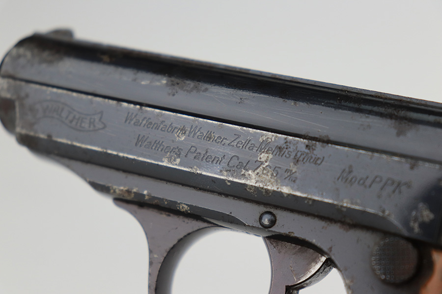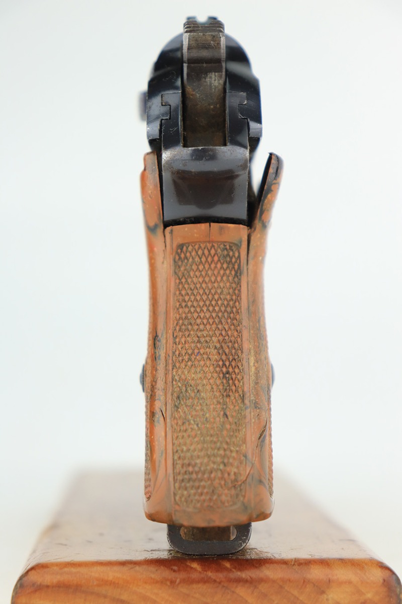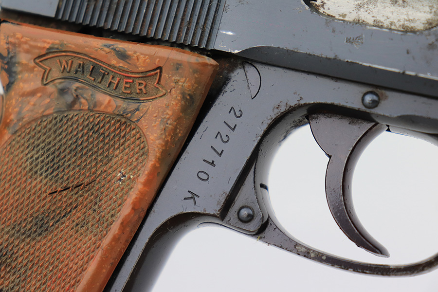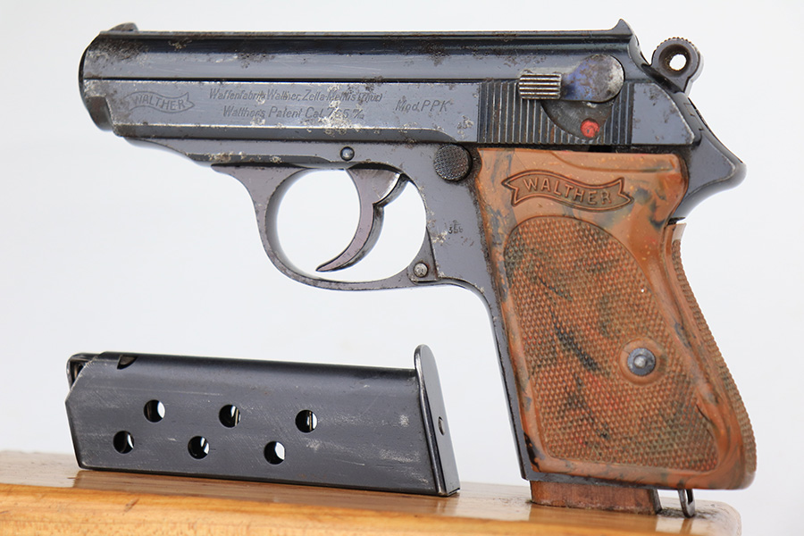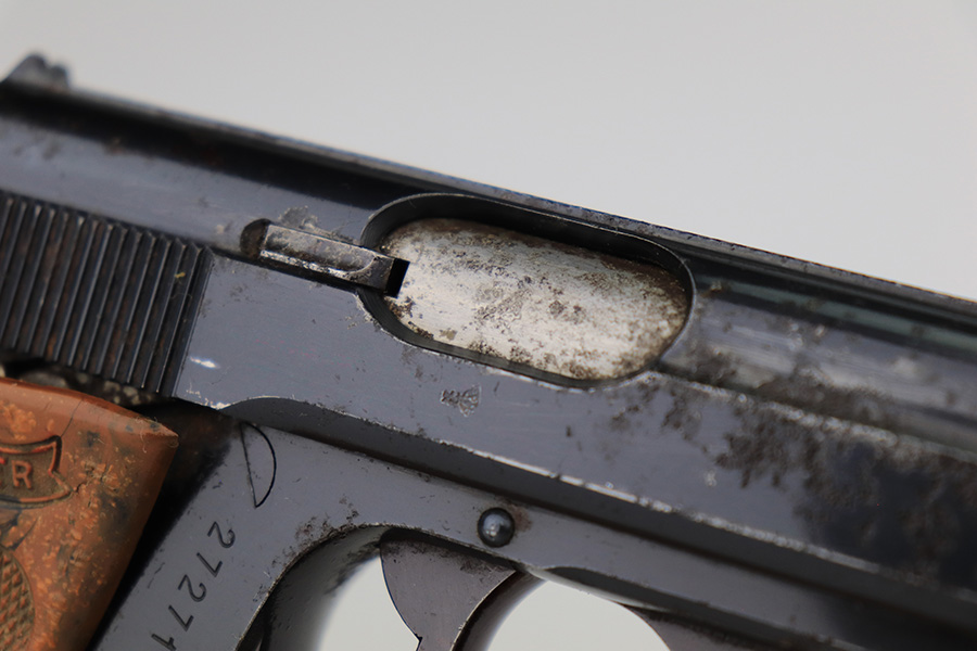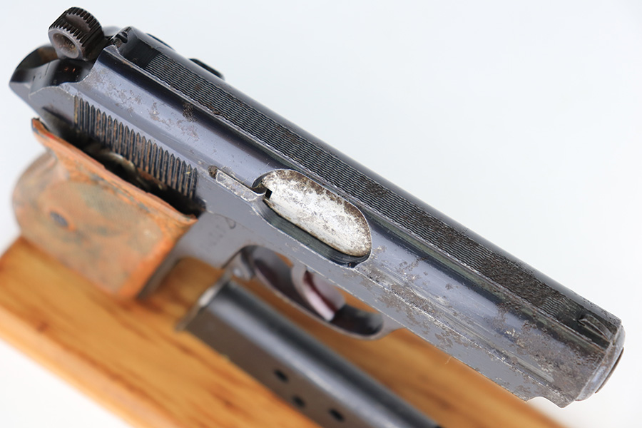 3/14/23 – This is a scarce Walther PPK issued to the Nazi military in 1940. It is all matching and has the earlier “Eagle 359” military acceptance proofs – only about 3,500 of this variation produced. It has retained about 92% of its original finish with spotty discoloration on the left side of the slide. While there isn’t a whole lot of actual finish loss, but there is spotty oxidation and some heavy pitting throughout. Brown Walther grip with heat blistering and warping on the right side and some cracks in the corners and on the spine. Comes with a Walther banner only magazine. Excellent shiny bore with strong rifling. The hold-open does not work with this magazine.