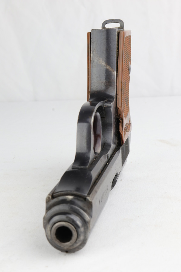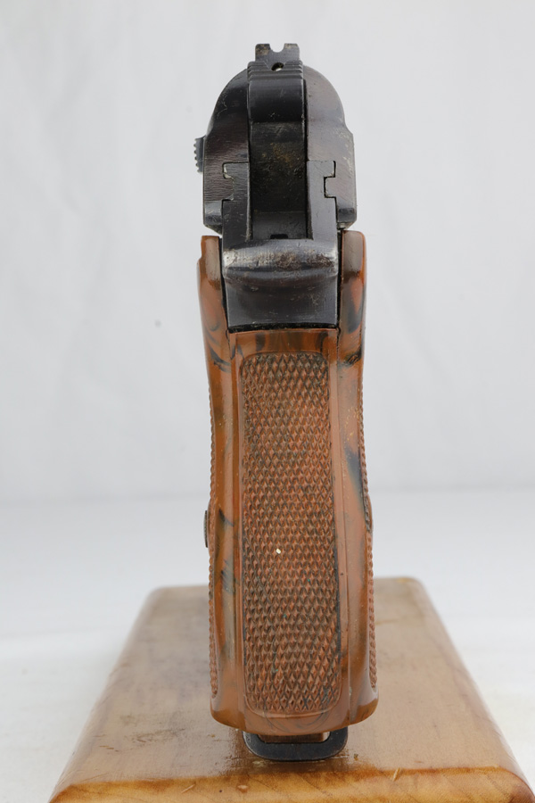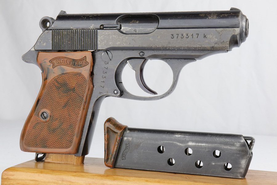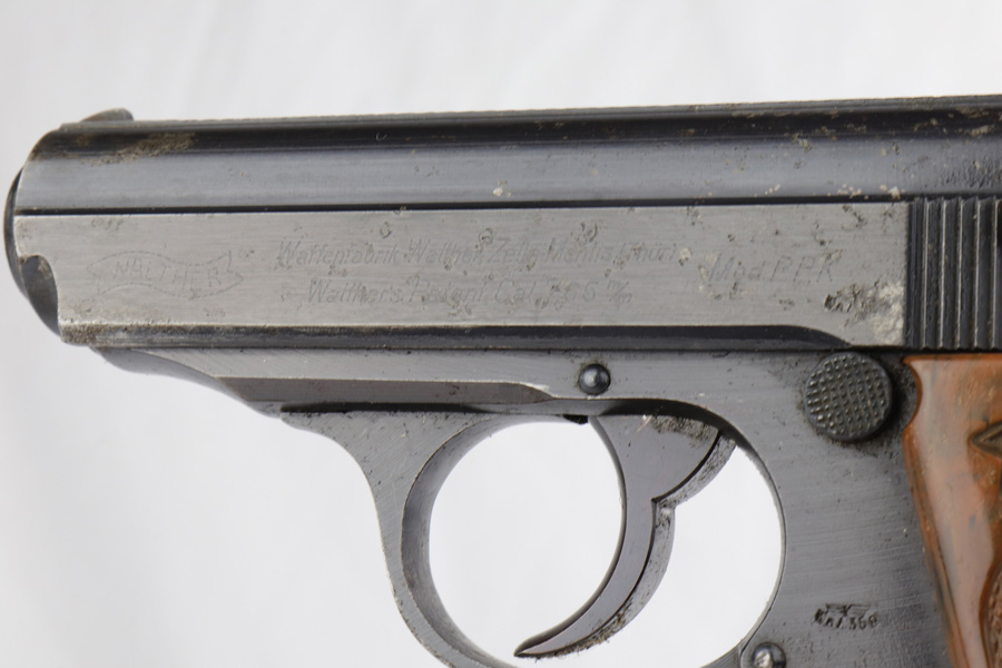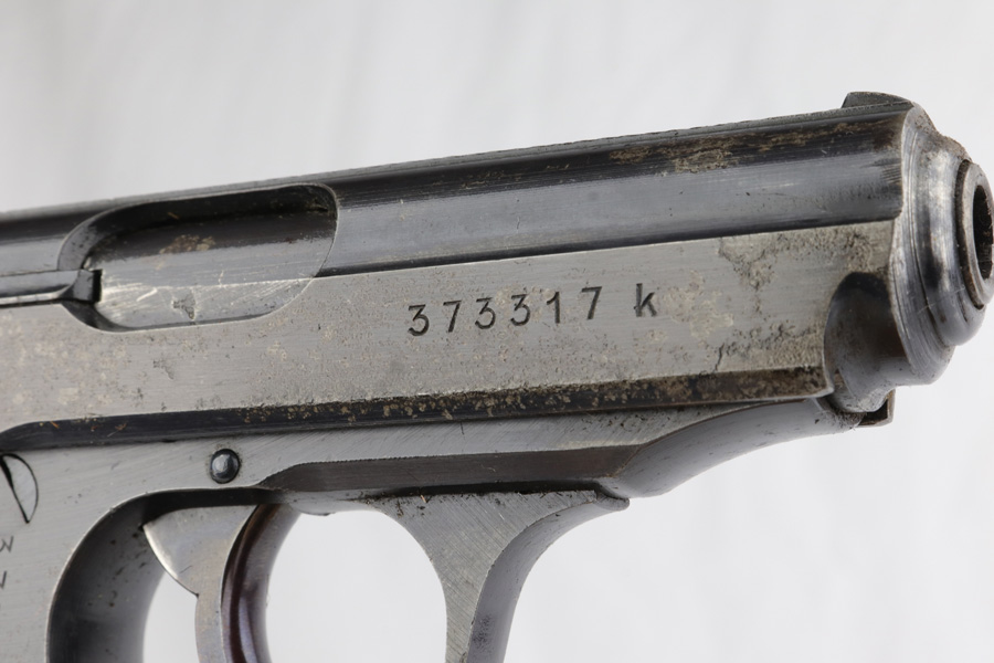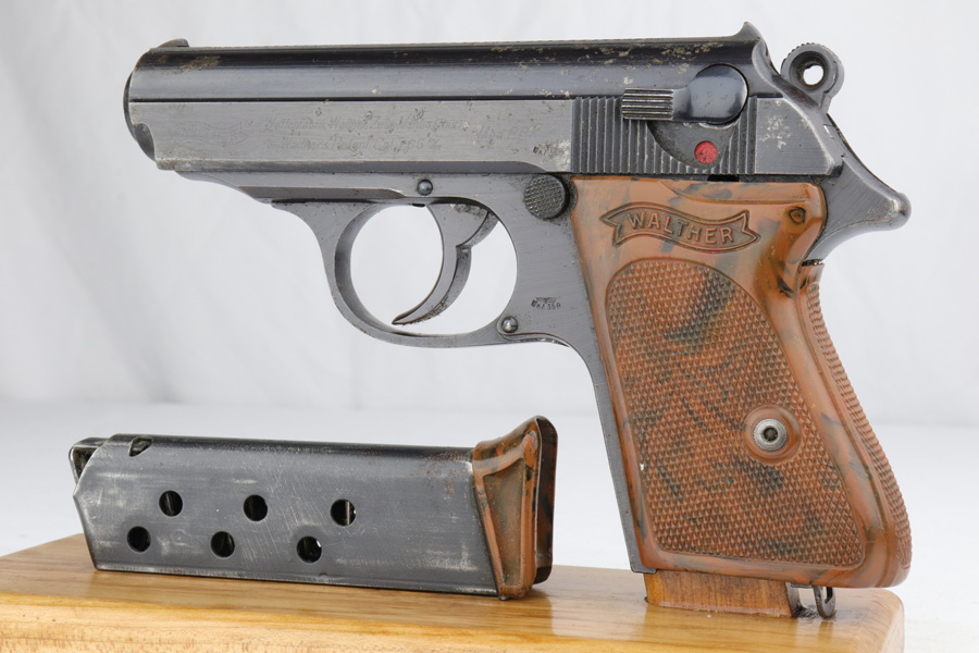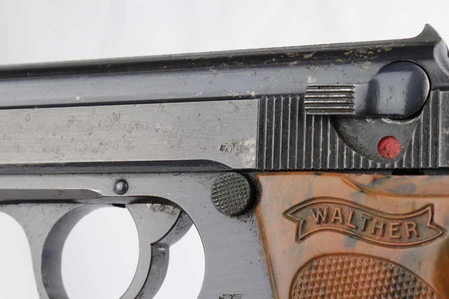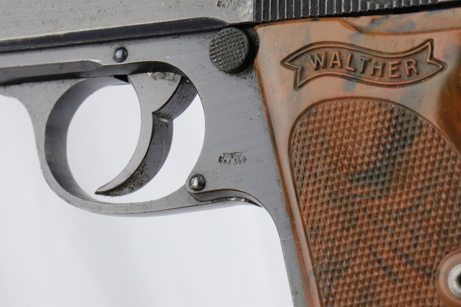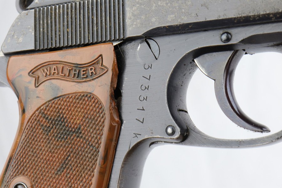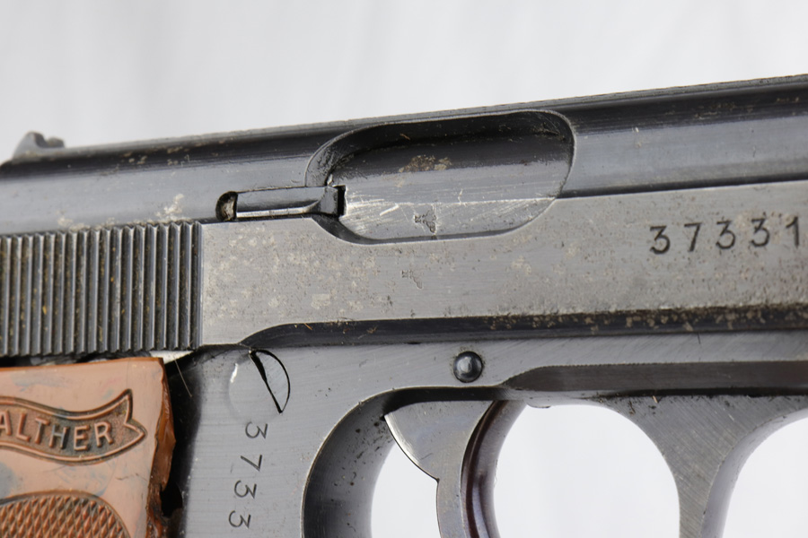 3/13/19 – This is a scarce Walther PPK that was issued to the German Army in 1942. It is all original and matching with freckling throughout both sides of the slide. The wear pattern resembles those commonly seen on Naval or Japanese arms, due to exposure to salt water air. Sharp waffenamts present on slide and frame. This is a third variation Army PPK, with 12,500 produced. Mint bore. Nice, original finger extension magazine with minor dings and a small chip but no cracks. The grip does have a large chip on the right side corner.