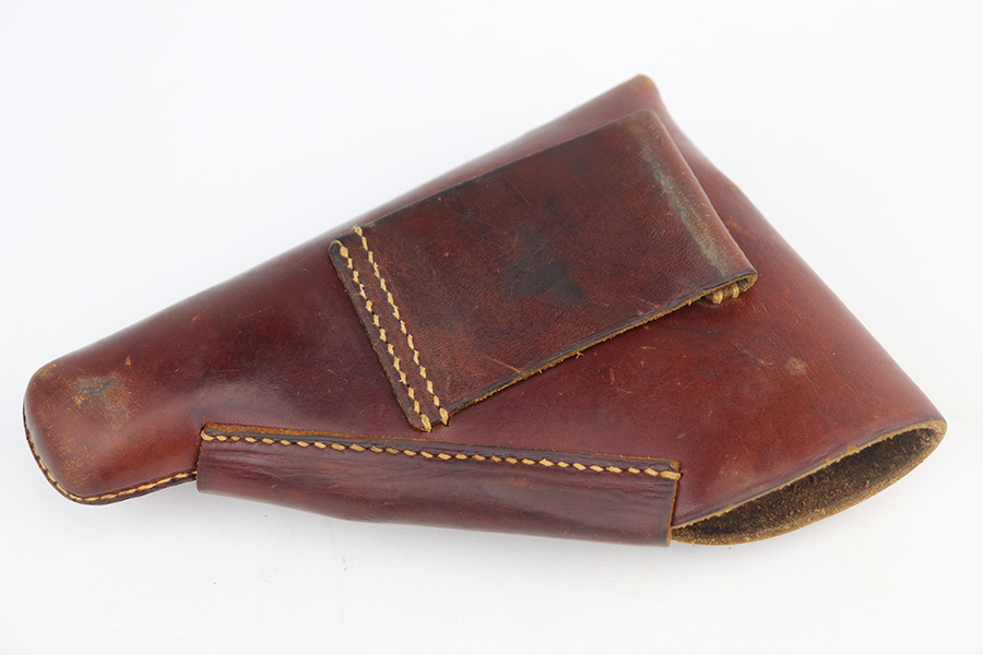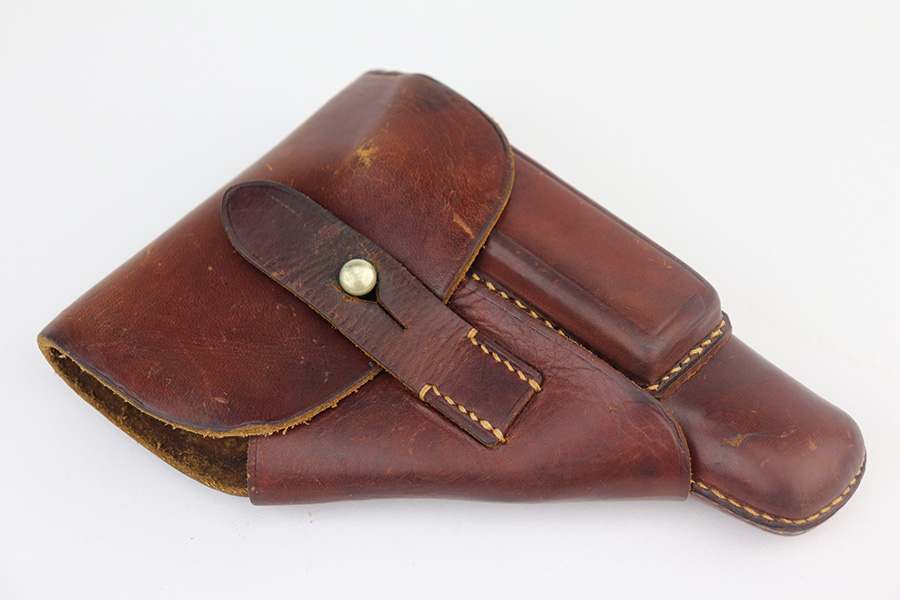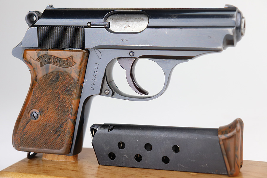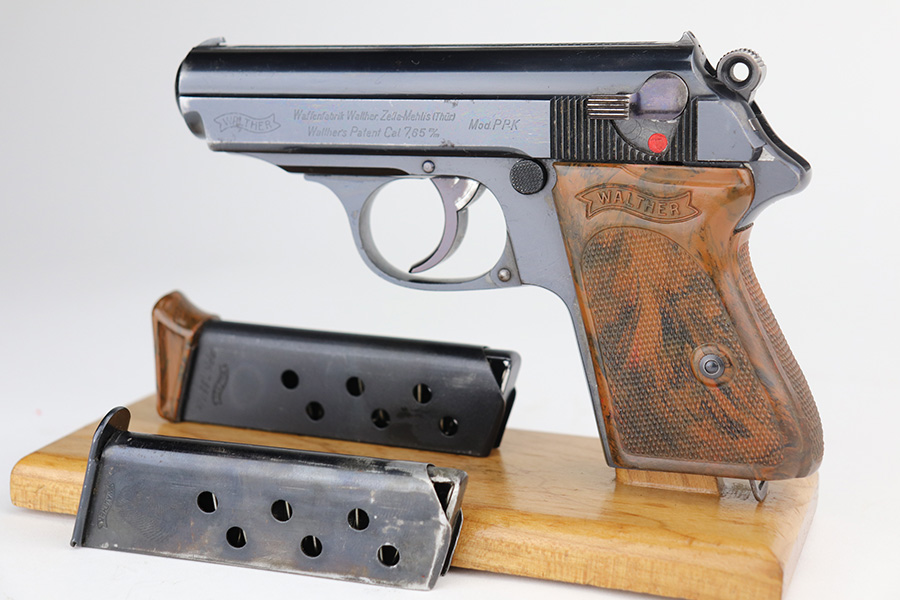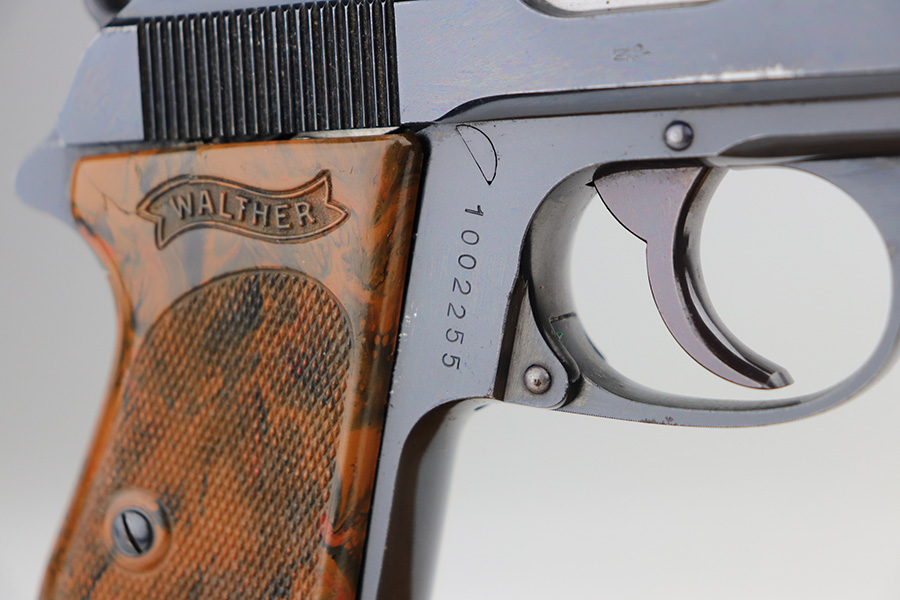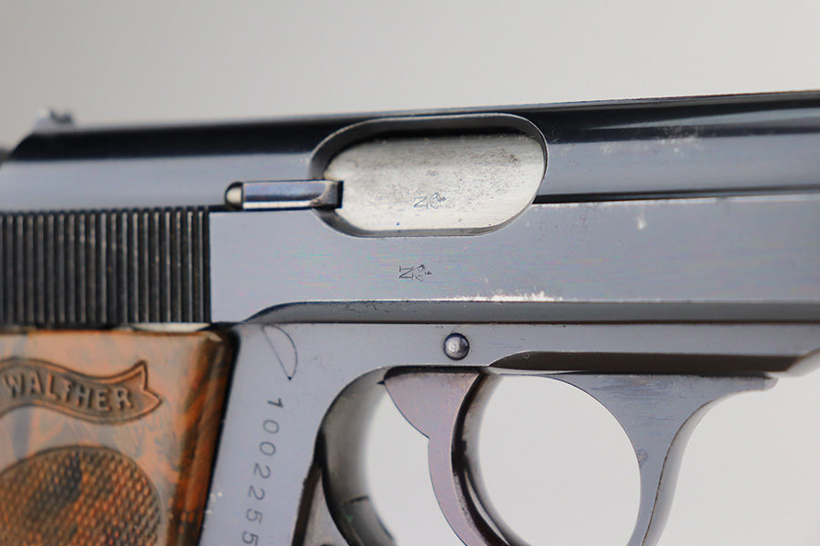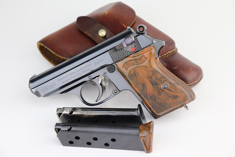 5/10/21 – This is a rare Walther PPK rig with million series serial number, one of only ~7,000 produced. It’s all original with about 95% of the high-polish blue remaining. Most of the bluing loss is on either side of the muzzle from rubbing against the inside of the holster. Also a few minor hints of edge wear on the slide and trigger guard, and a little bit of freckling on the left side of the slide. Minty bore. Grip is very nice aside from a crack on the right side. The rig includes one finger extension magazine which is in fantastic condition, and a spare flat bottom magazine. It’s completed by an excellent Akah marked holster.