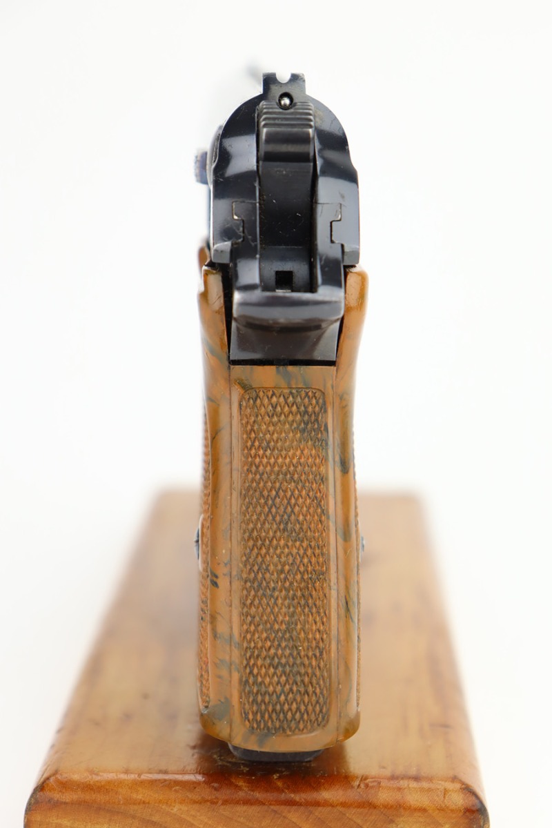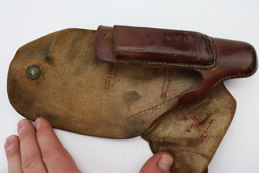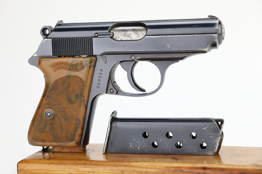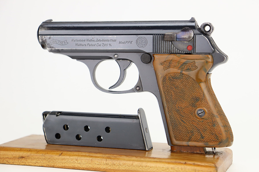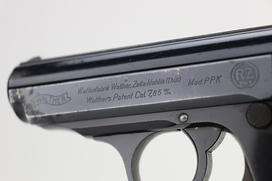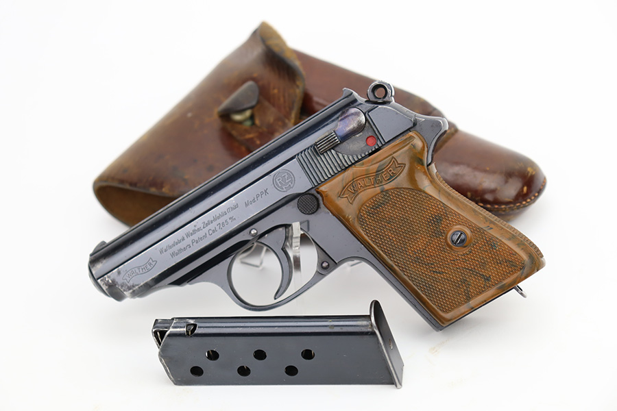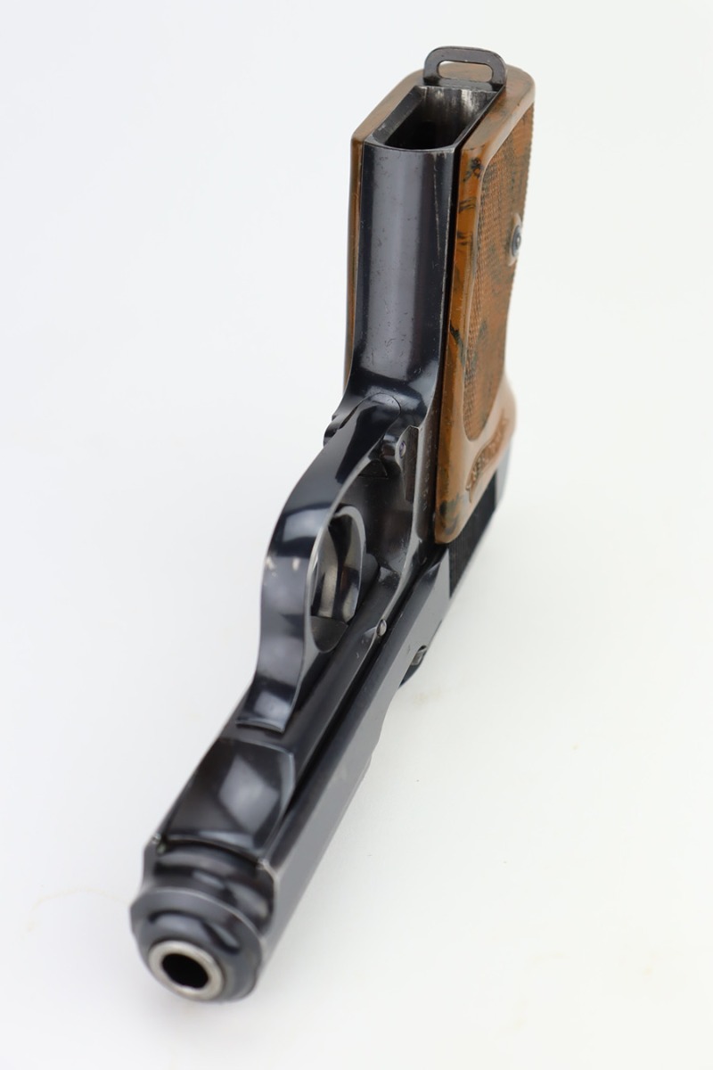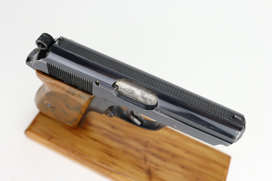 11/30/23 – This is a scarce Walther PPK from 1934 with RZM marked slide. The RZM (Reichs Zeug Meisterei) was the equipment office of the NSDAP and was established to contract for equipment. These pistols were commonly thought to be issued to the German political leaders of the time. This one is all matching and has retained about 94-95% of its original high polish finish. There isn’t much wear on this pistol aside from a patch of pitting and finish loss on the left side of the muzzle. Early 90 degree safety still shows about half of the original fire blue. Nice brown bakelite grip with no notable cracks or chips. Excellent bore. Comes with an original Akah holster that has the faint Walther inkstamp inside. The holster is in decent condition as there are no holes or major defects, but some of the leather is curled up or “squashed” on the inner and outer flaps.
