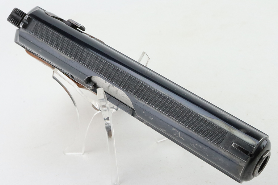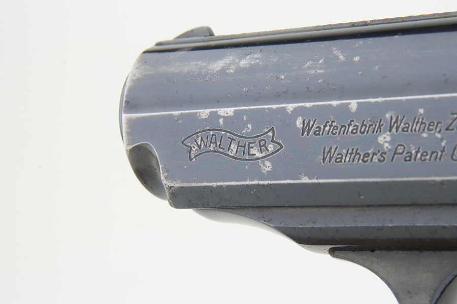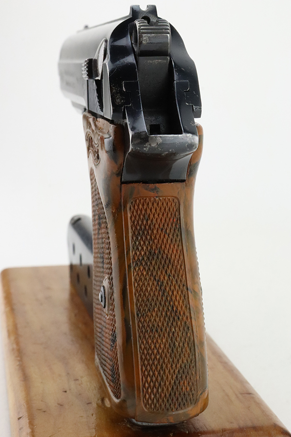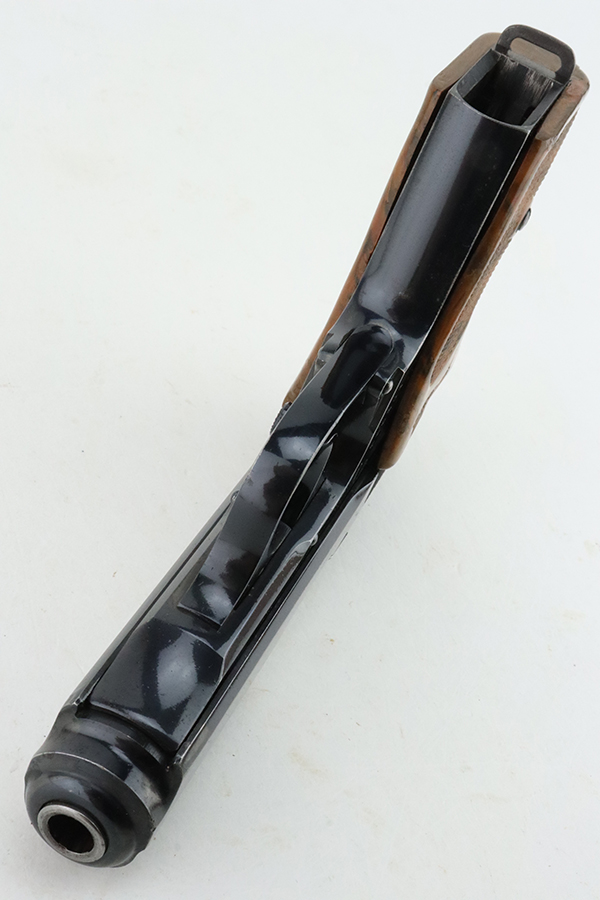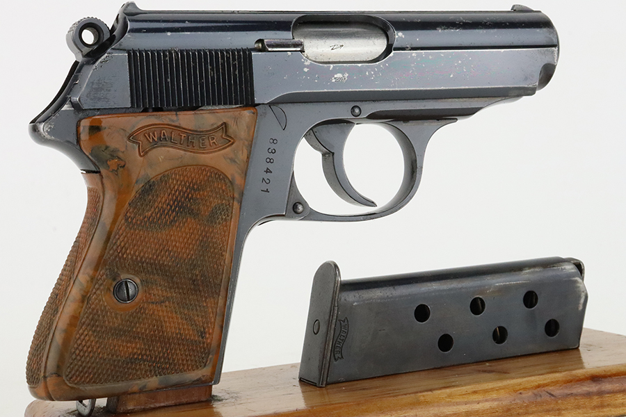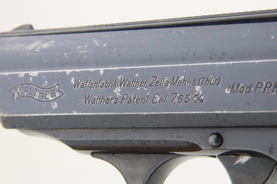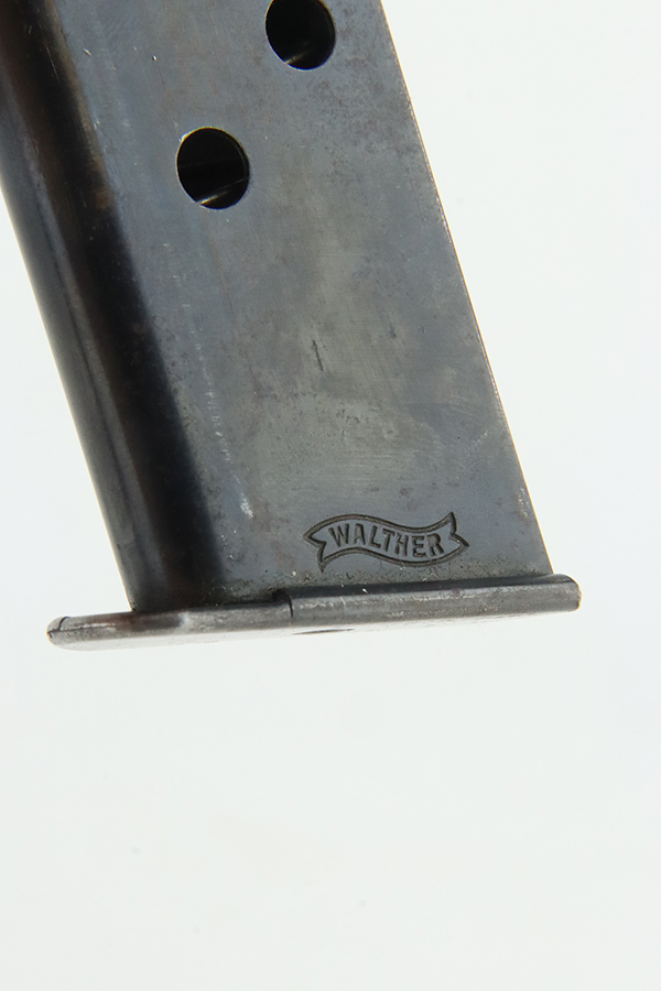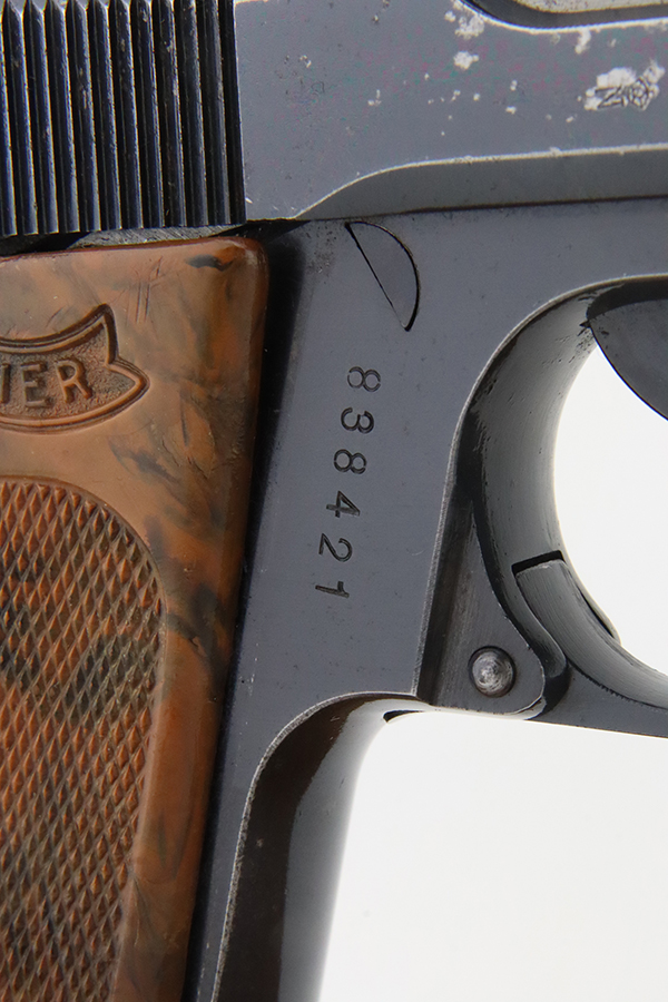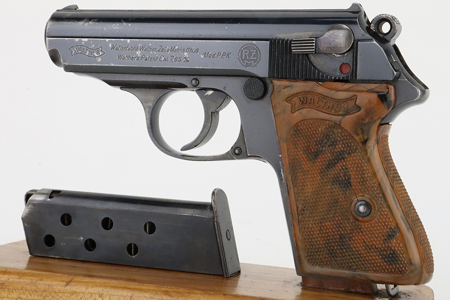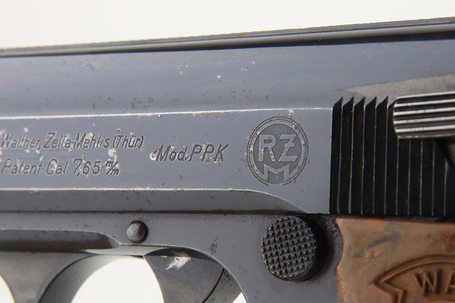 1/26/24 – This is a scarce Walther PPK from 1935 with RZM marked slide. The RZM (Reichs Zeug Meisterei) was the equipment office of the NSDAP and was established to contract for equipment. These pistols were commonly thought to be issued to the German political leaders of the time. This one is all matching and has retained about 93% of its original high polish finish. There is not much actual finish loss, but there is spotty discoloration along both sides of the slide. Fitted with a nice brown grip and comes with a proper Walther banner only magazine. The bore is mostly shiny with great rifling, but there is some light freckling in the grooves.