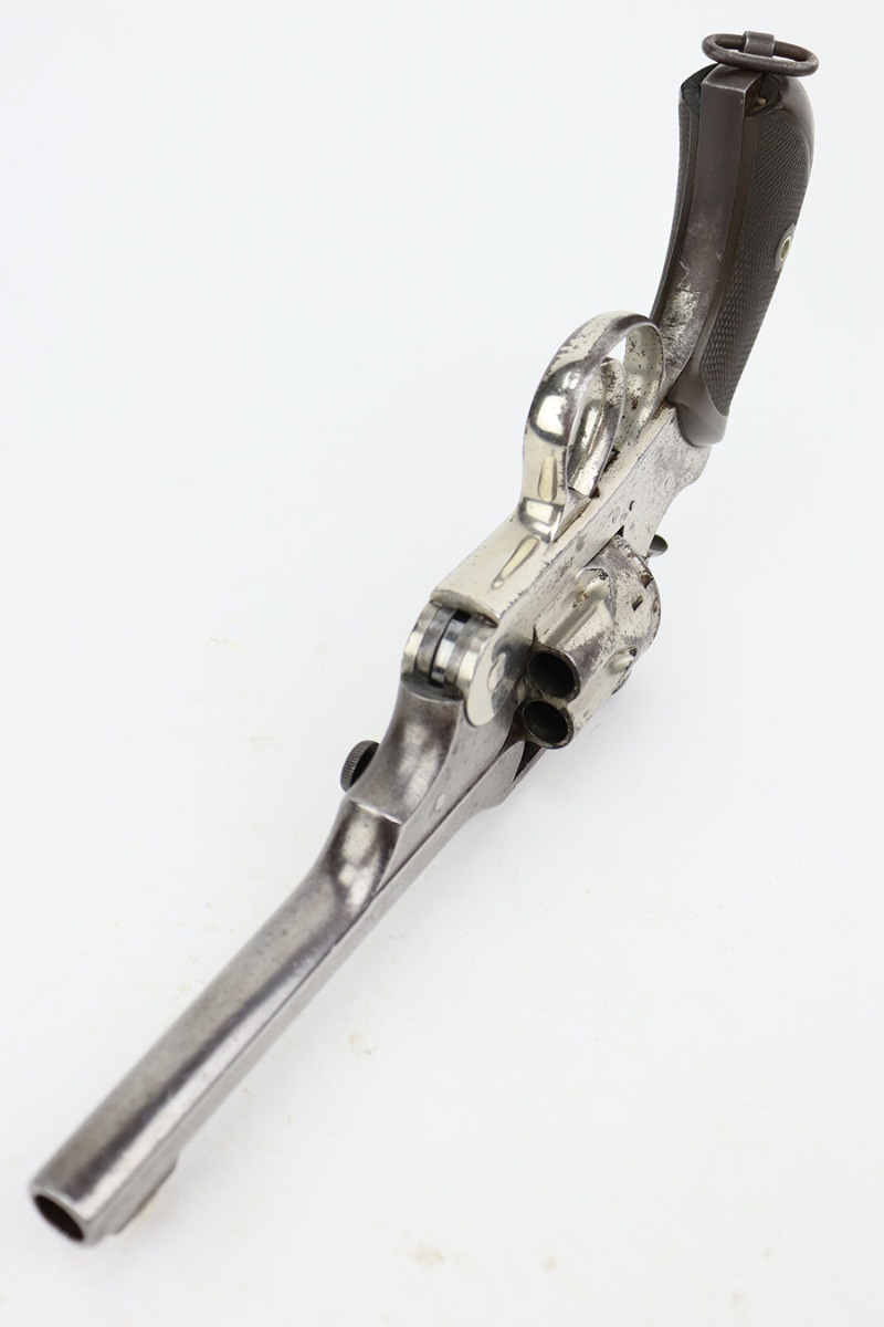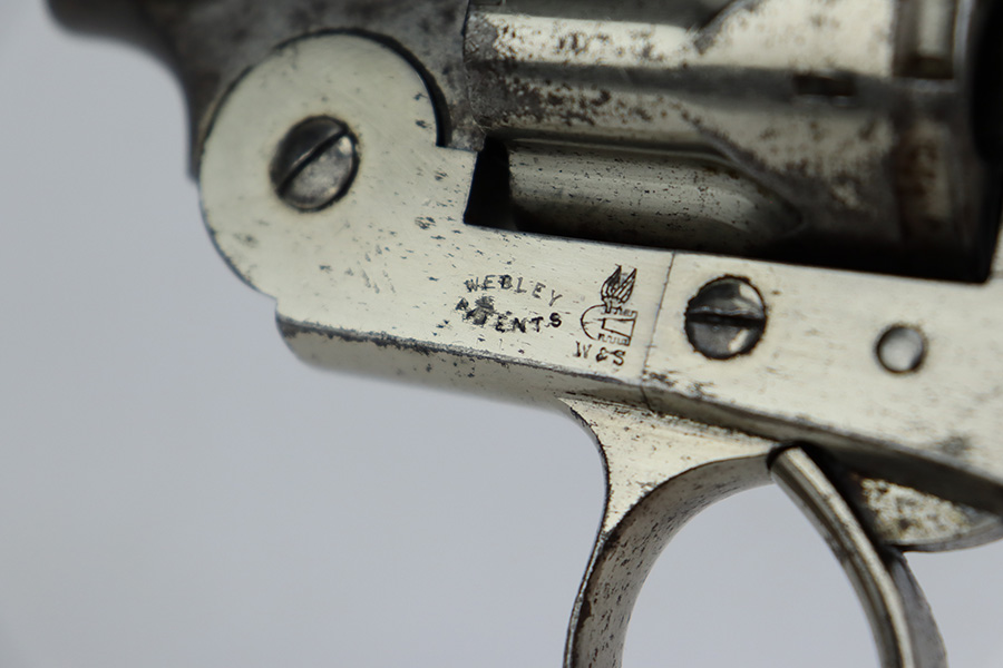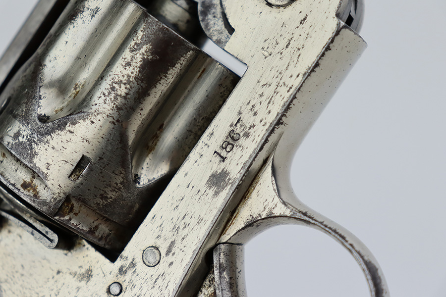 The Webley WG 1885/1886 was only produced for a brief period from 1886-1889, after which it was replaced by the WG 1889. Fewer than 2000 models were made; this example serialed 1867 is one of the highest recorded. For instance, Bruce & Reinhart’s Webley Revolvers records serial number 1876 as the highest known Webley Model WG 1886.