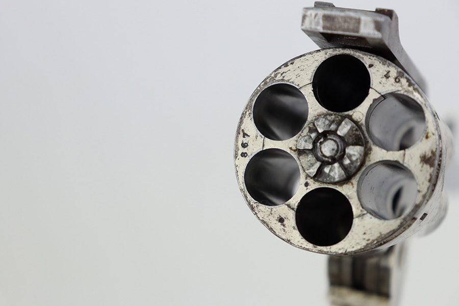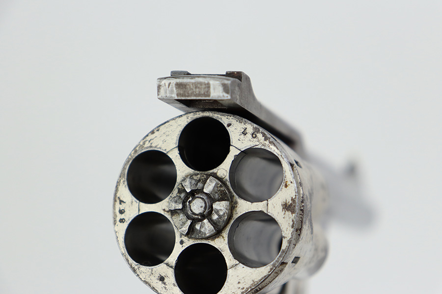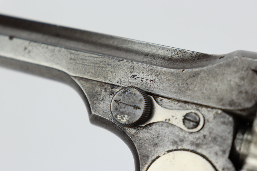 The cylinder also features distinctive church-steeple fluting, which was present on early Webley WG revolvers before being discontinued in 1893.