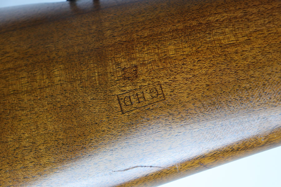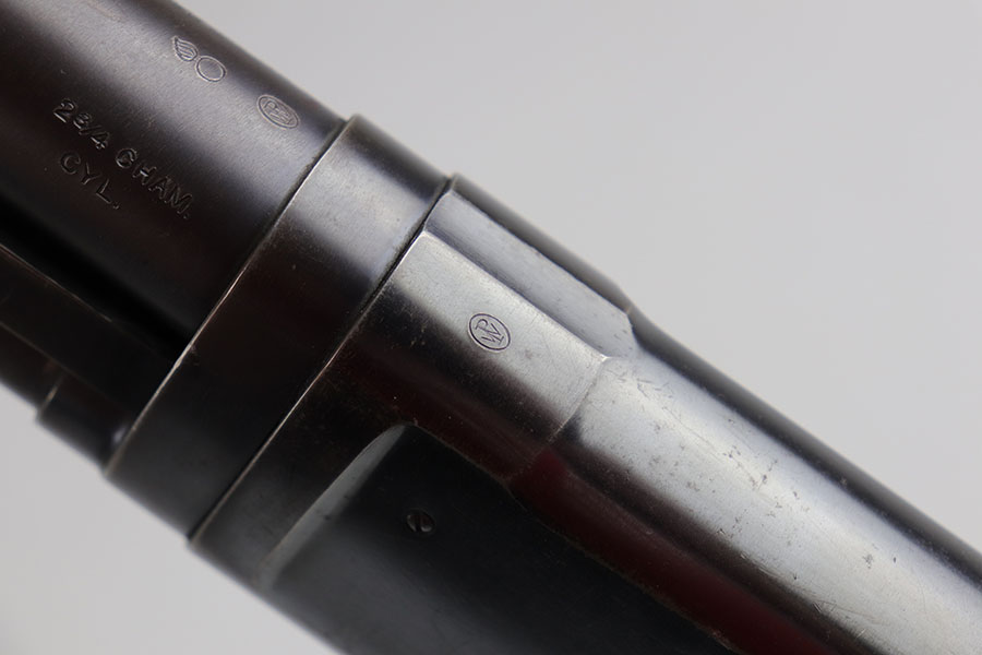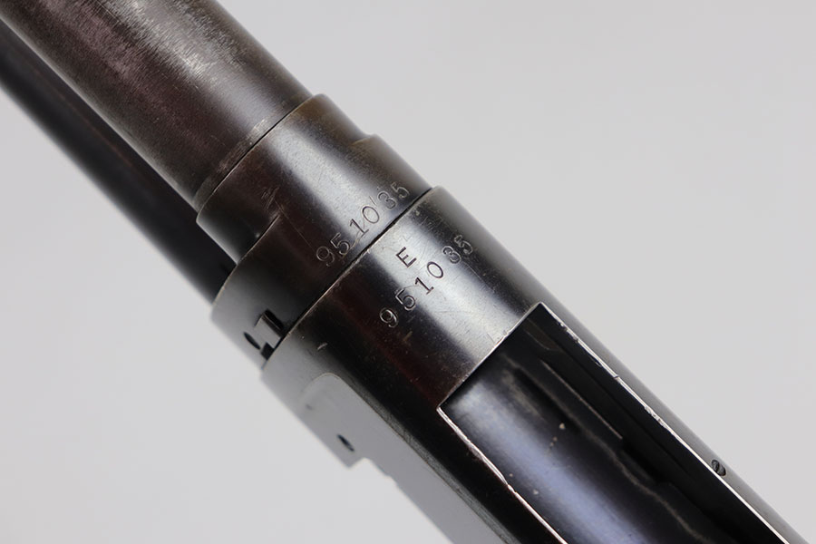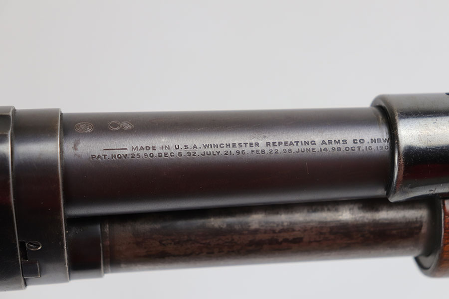 7/10/20 – This is an original Winchester model 1897 Trench Shotgun made during WW2. This shotgun was produced in ~1944 and comes with the original factory shroud and bayonet lug. The shotgun is original and rates at about 85-90% blue, with an excellent receiver, but some thinning/patina on the barrel and trigger group. There are also some scratches on the underside of the barrel. Correct 4-row handguard/heat shield The receiver has the U.S. and flaming bomb ordnance proof on one side of the receiver. The wood stock is excellent and properly cartouche stamped with a G.H.D inspector proof. Excellent gun with just honest wear to the overall condition of the gun. Minty bore and smooth action.