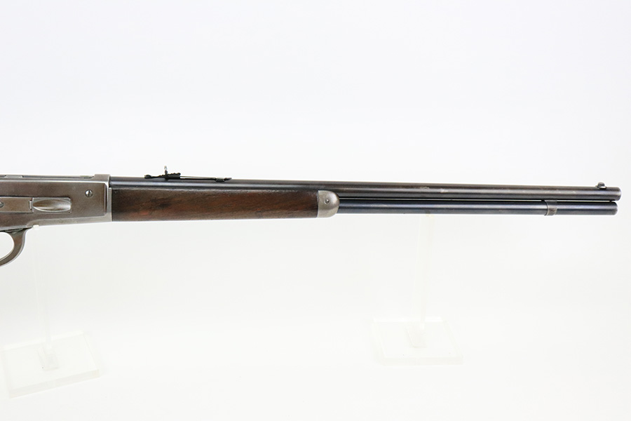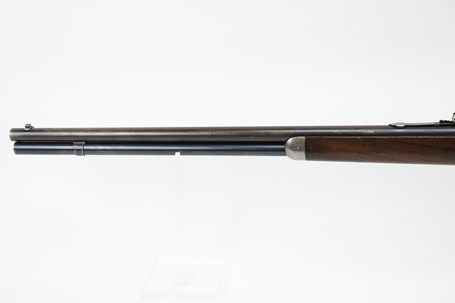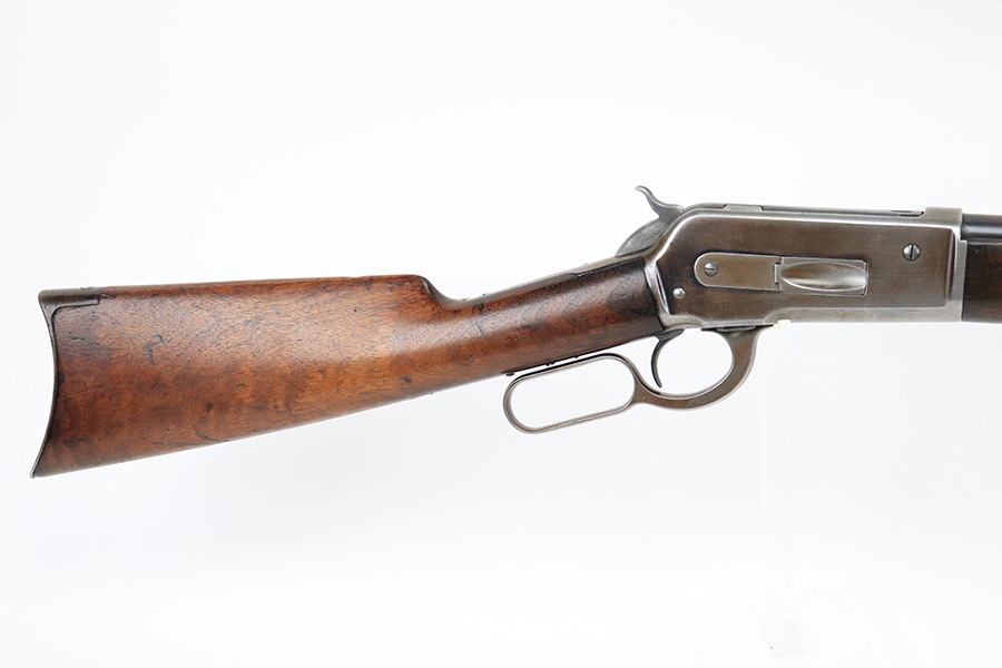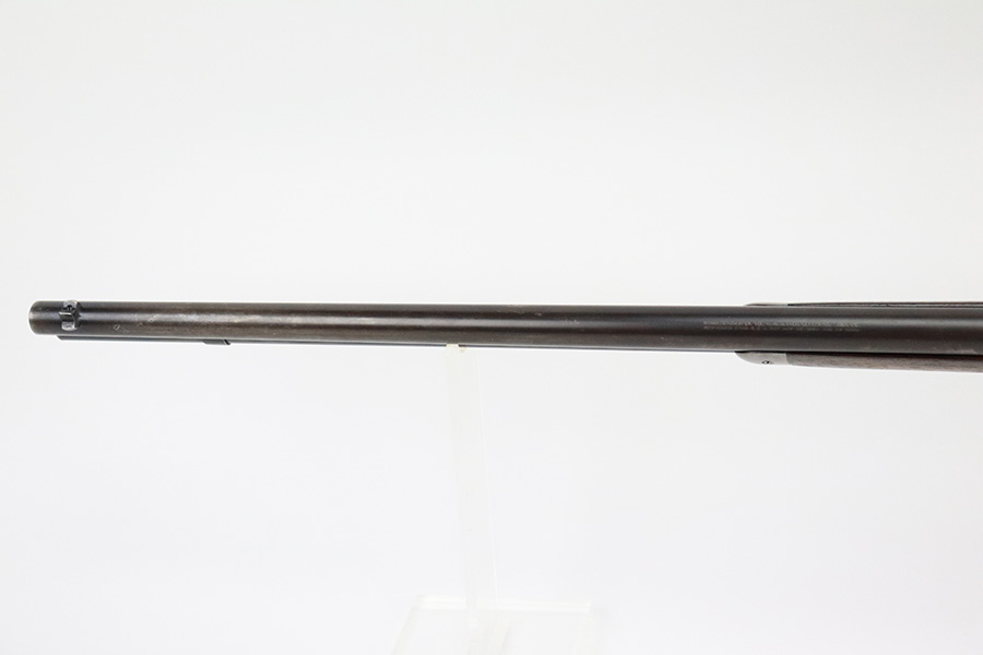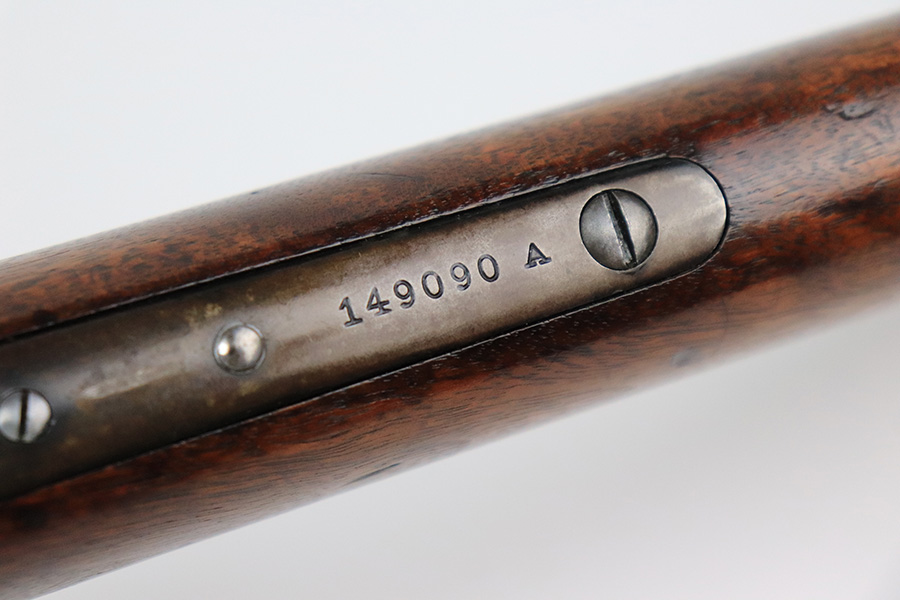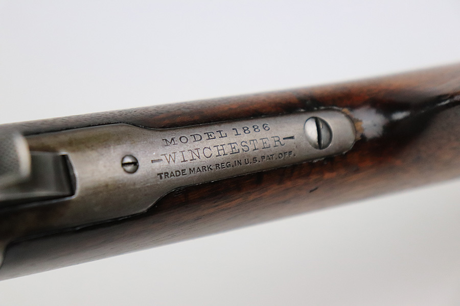 9/2/22 – This is a scarce Winchester Model 1886 standard rifle with 26in round barrel. Serial dates it to 1910, after the change to a blued finish on the frame and buttplate had been made. This one has nice bluing on the barrel and magazine tube but the receiver and lever bluing have worn off. The bore has strong rifling but some frost and freckling throughout. Stock and forend are in good condition but the forend has two small repairs (likely was chipped). Lever action is smooth.