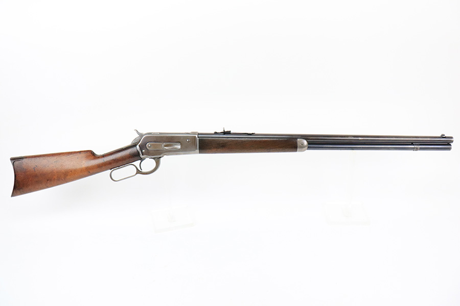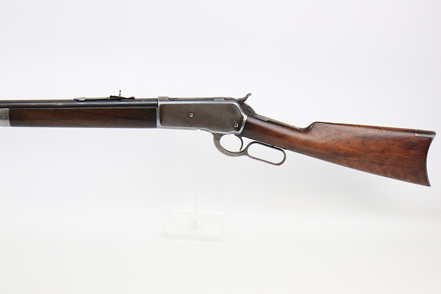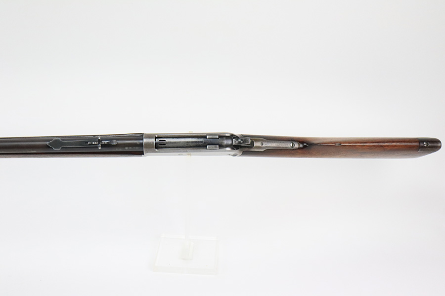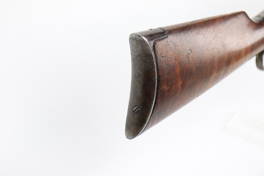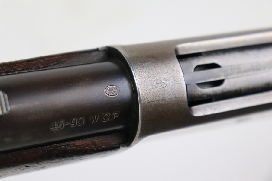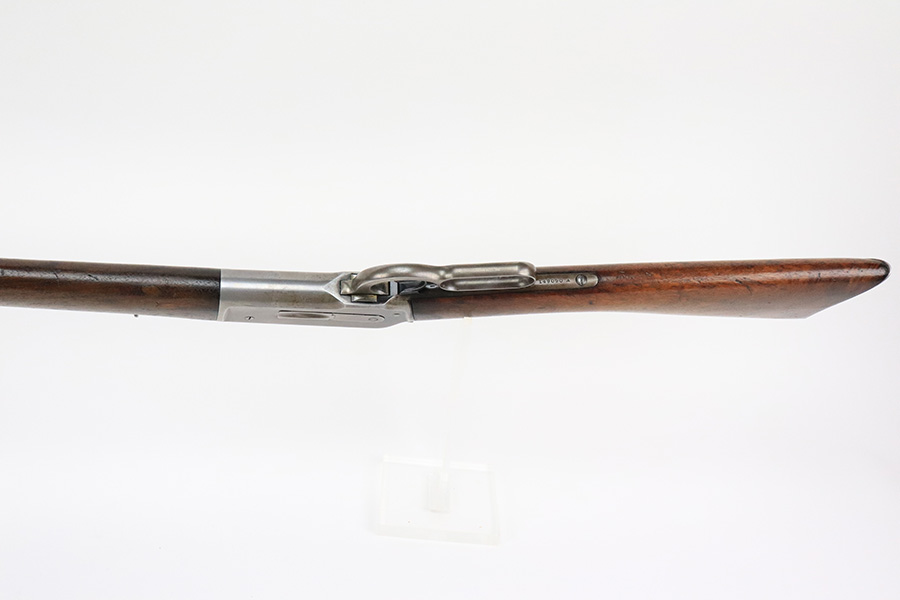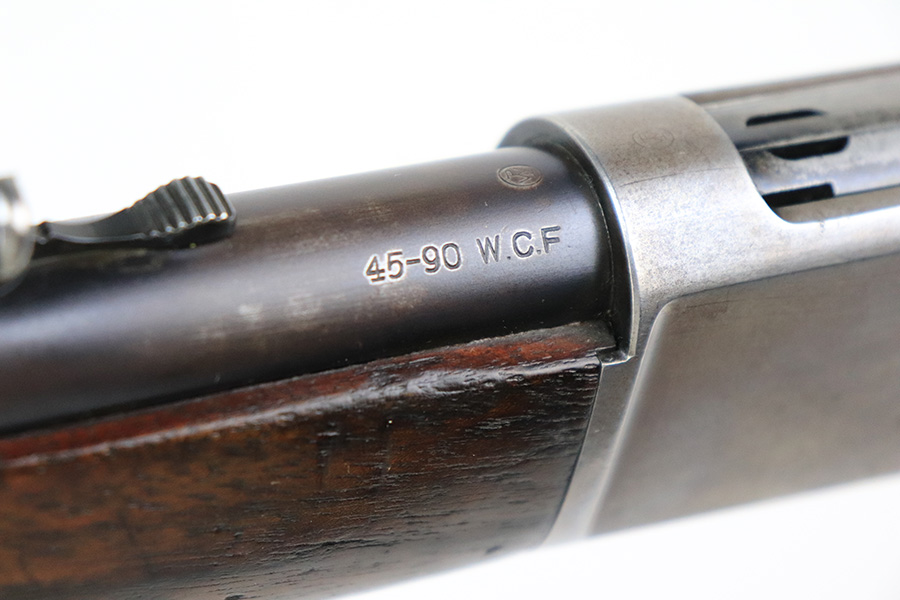 9/2/22 – This is a scarce Winchester Model 1886 standard rifle with 26in round barrel. Serial dates it to 1910, after the change to a blued finish on the frame and buttplate had been made. This one has nice bluing on the barrel and magazine tube but the receiver and lever bluing have worn off. The bore has strong rifling but some frost and freckling throughout. Stock and forend are in good condition but the forend has two small repairs (likely was chipped). Lever action is smooth.