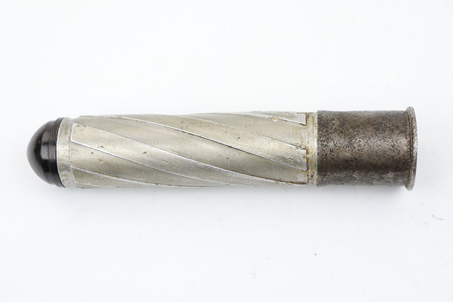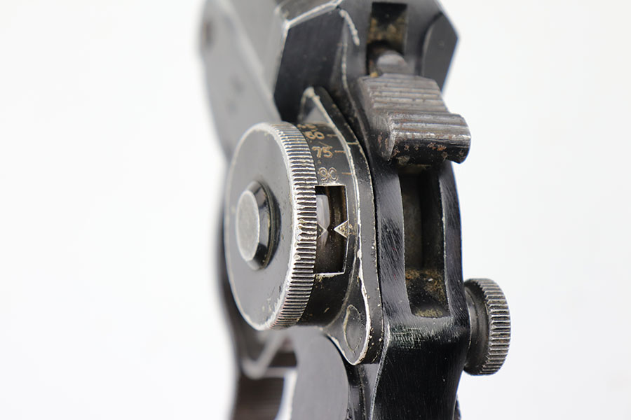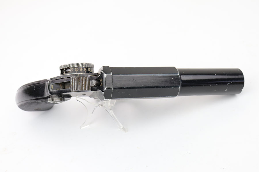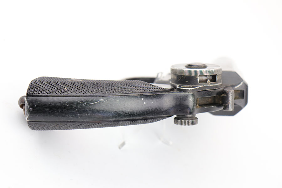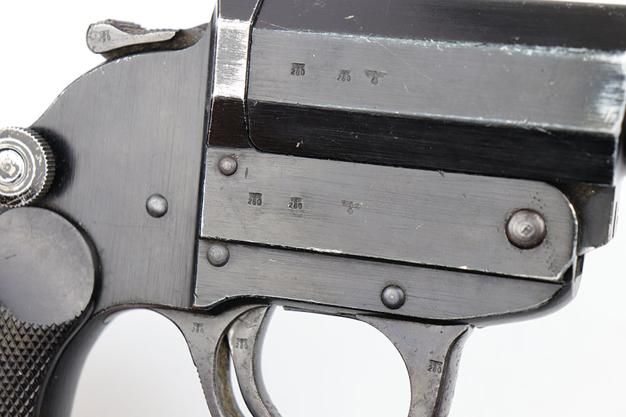 4/28/20 – This is a scarce example of an original WW2 Nazi Kampfpistole that was manufactured by the Erma factory. These early kampf-pistols were based on the original Leuchtpistole (flare pistols) design, only they were intended to be used as both a signaling and a “anti-personal” weapon, as they had a unique rifled barrel that could shoot a 25mm rifle grenade, which were the same type of round as used in the K98 service rifle grenade launchers. They are easily identified as the side of the barrel were stamped with a large capital letter “Z” that was filled with luminous paint. This gun is especially rare because it has an ultra-rare adjustable sight on it. It is hard to see in the photos, but it still has the original fluid inside and still shows the leveling bubble. It is also marked “ayf 40” on the left side of the frame. On the right side of the pistol, the hammer, barrel, frame, trigger guard, and trigger, are all “Eagle 280” marked. Overall, this example is in very nice condition. There is wear in the finish around the muzzle, one area of wear on the right side of the barrel, and general wear around the high edges. It is fully functional. It comes with one deactivated rifled round. The bore is excellent – strong rifling with a very minor amount of frosting. Because it can shoot explosive rounds, an FFL is required.