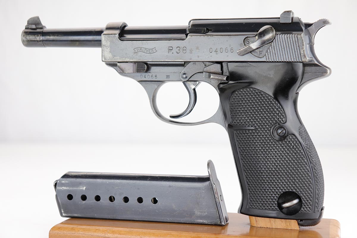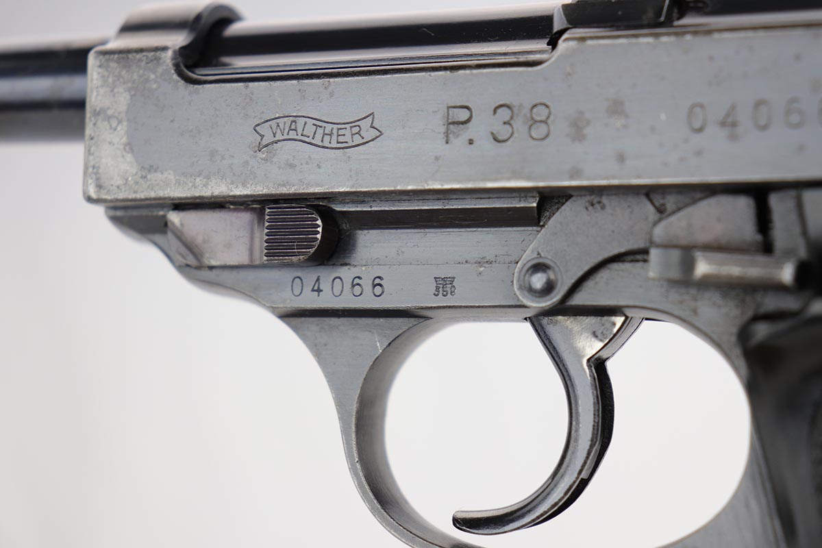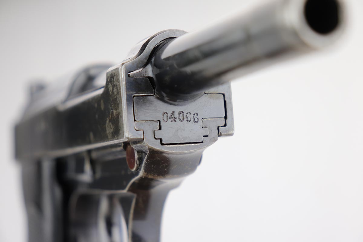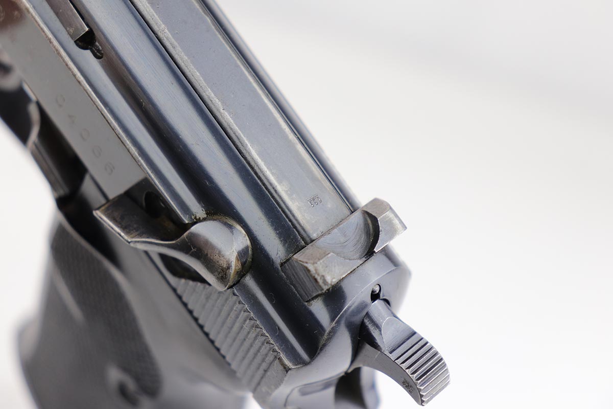 1/8/20 – This is a scarce Zero Series Walther P.38 from 1940. It’s a third variation example, one of about 10,000 produced. The pistol is all matching and original, including the grips. Magazine is not numbered. All small parts properly have Walther marking on them. The bluing is original and rates at about 75+% a smattering of finish loss on all major areas. There is also some pinpricking on both sides of the slide, mostly toward the front edge. Grips are in excellent condition. Bore is very nice too, with only minor frosting. Walther magazine. Safety/de-cocker does NOT work.
