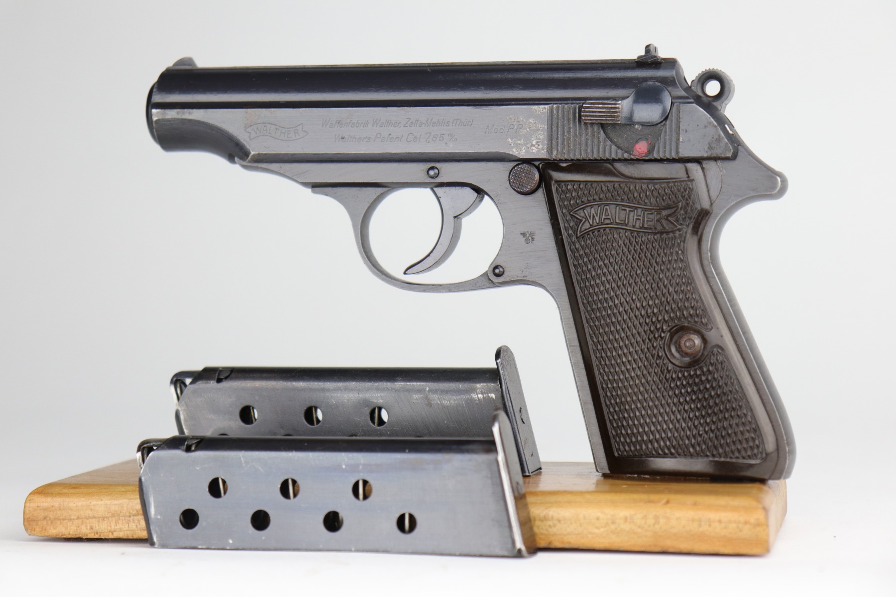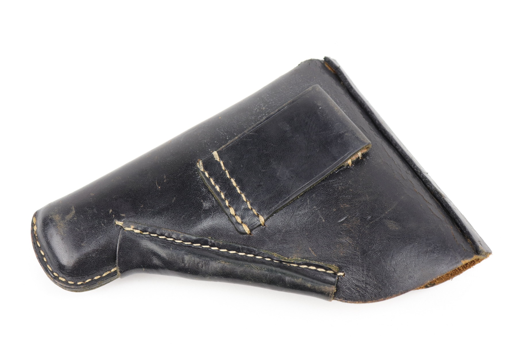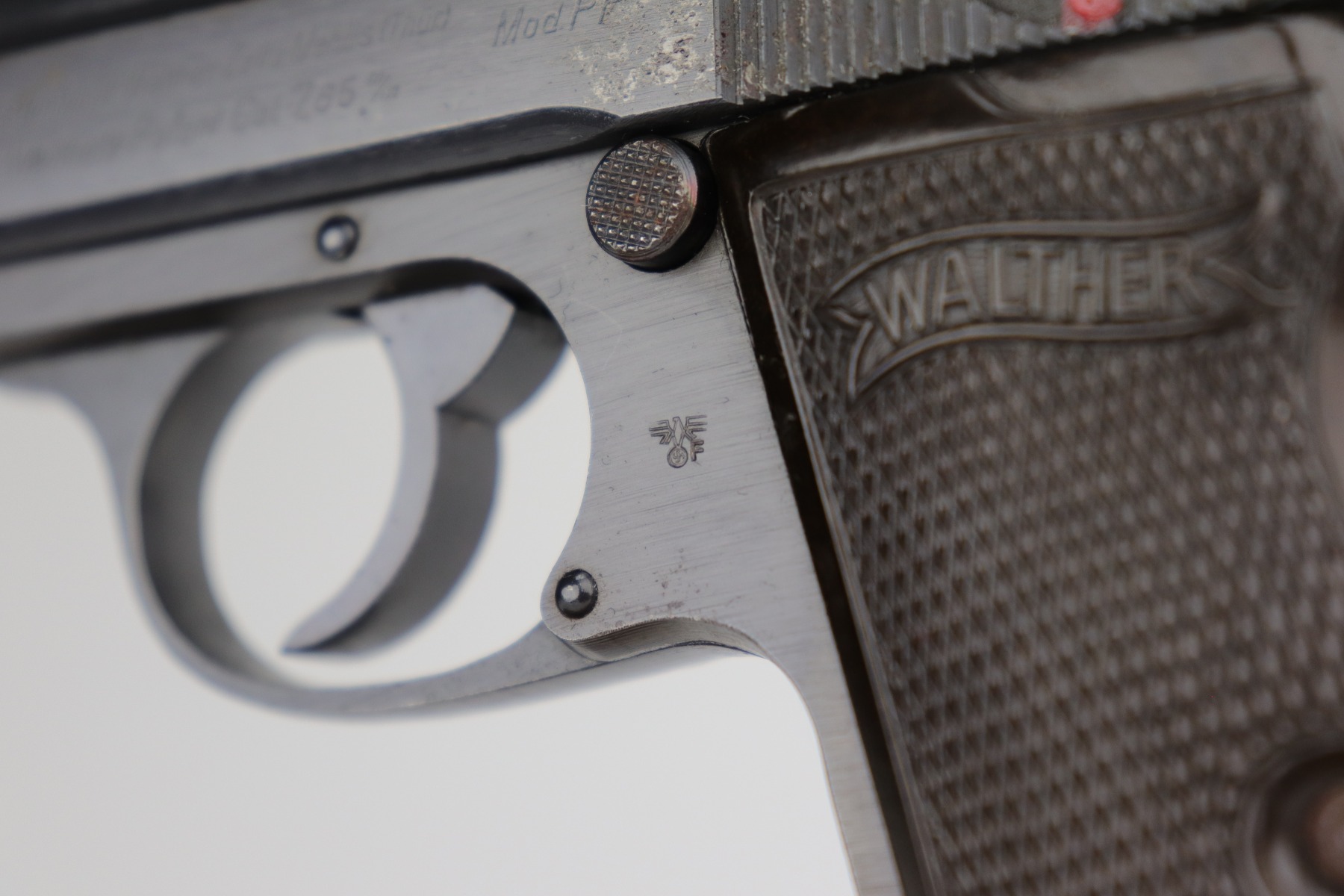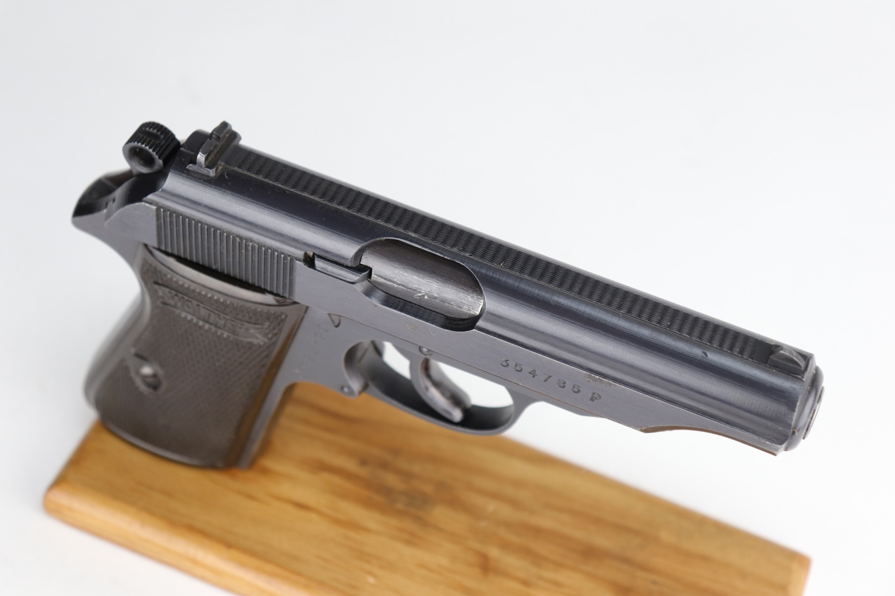 9/18/20 – This is an excellent example of a scarce E/F Walther PP issued to the Nazi police force in 1944. There is an “Eagle F” marking on the left side of the frame. Only about 5,000 of these guns were produced. This rig comes with a black leather holster and two magazines. The gun is in excellent condition, retaining about 97-98% of its original bluing. There is very minor thinning on the straps. There are also a few small areas of discoloration and minor pitting, most noticeable on the left side of the slide. The bore is minty – shiny with strong rifling. It has excellent dark brown bakelite grips. The holster is waffenamt and dated 1944. The top flap has been cut off and re-glued. One of the mags is wartime and the other is an early Walther banner-only magazine. It appears that a post-war legend was added.