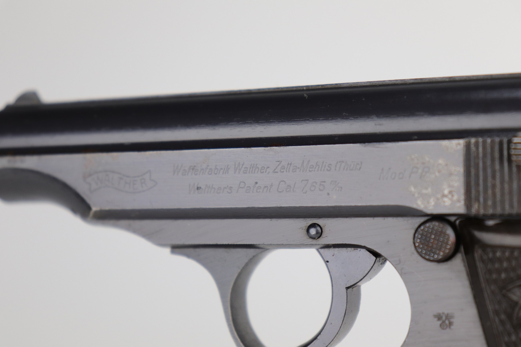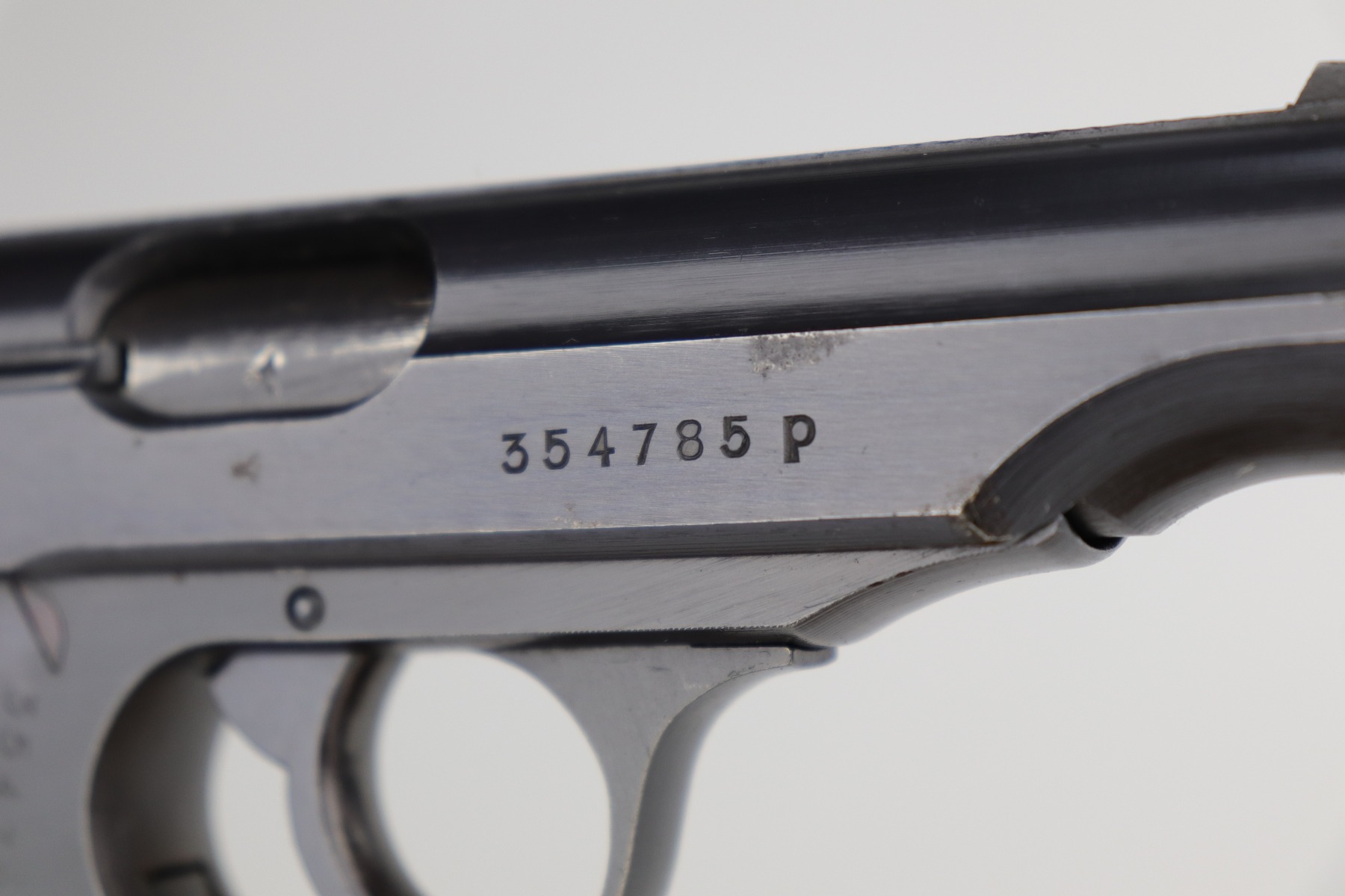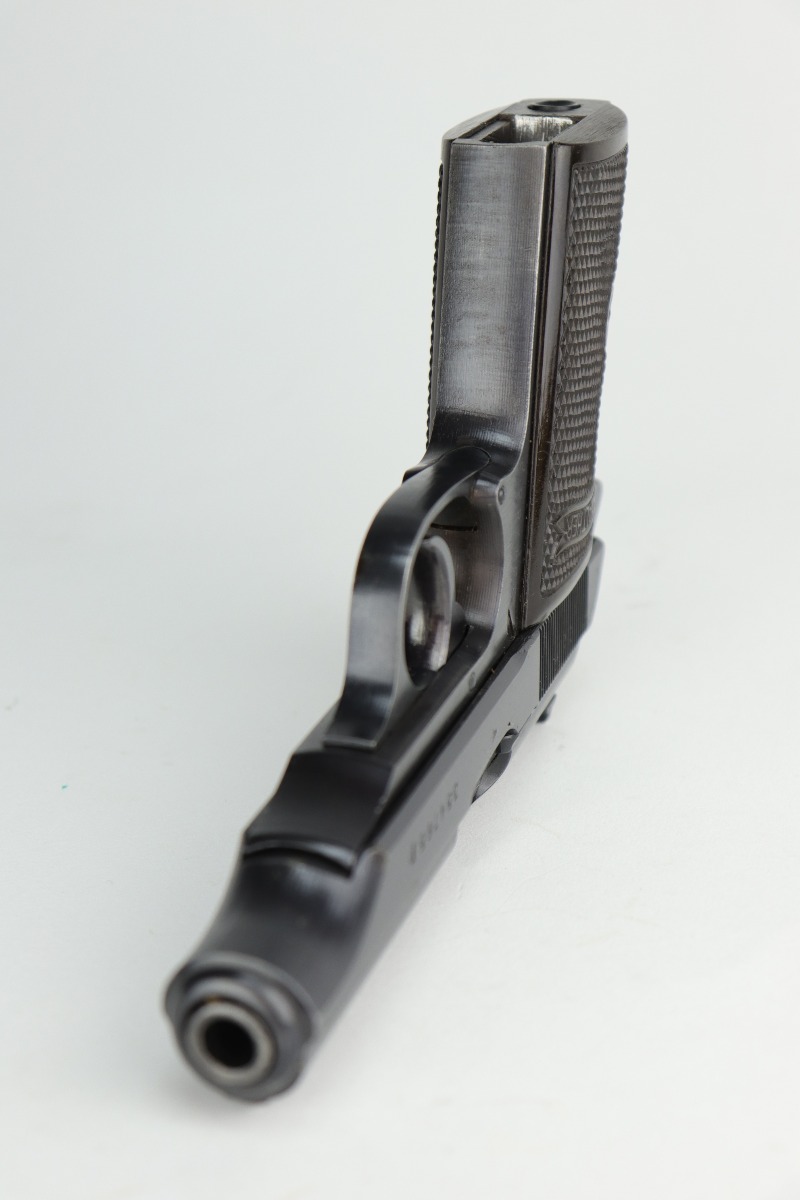 9/18/20 – This is an excellent example of a scarce E/F Walther PP issued to the Nazi police force in 1944. There is an “Eagle F” marking on the left side of the frame. Only about 5,000 of these guns were produced. This rig comes with a black leather holster and two magazines. The gun is in excellent condition, retaining about 97-98% of its original bluing. There is very minor thinning on the straps. There are also a few small areas of discoloration and minor pitting, most noticeable on the left side of the slide. The bore is minty – shiny with strong rifling. It has excellent dark brown bakelite grips. The holster is waffenamt and dated 1944. The top flap has been cut off and re-glued. One of the mags is wartime and the other is an early Walther banner-only magazine. It appears that a post-war legend was added.
