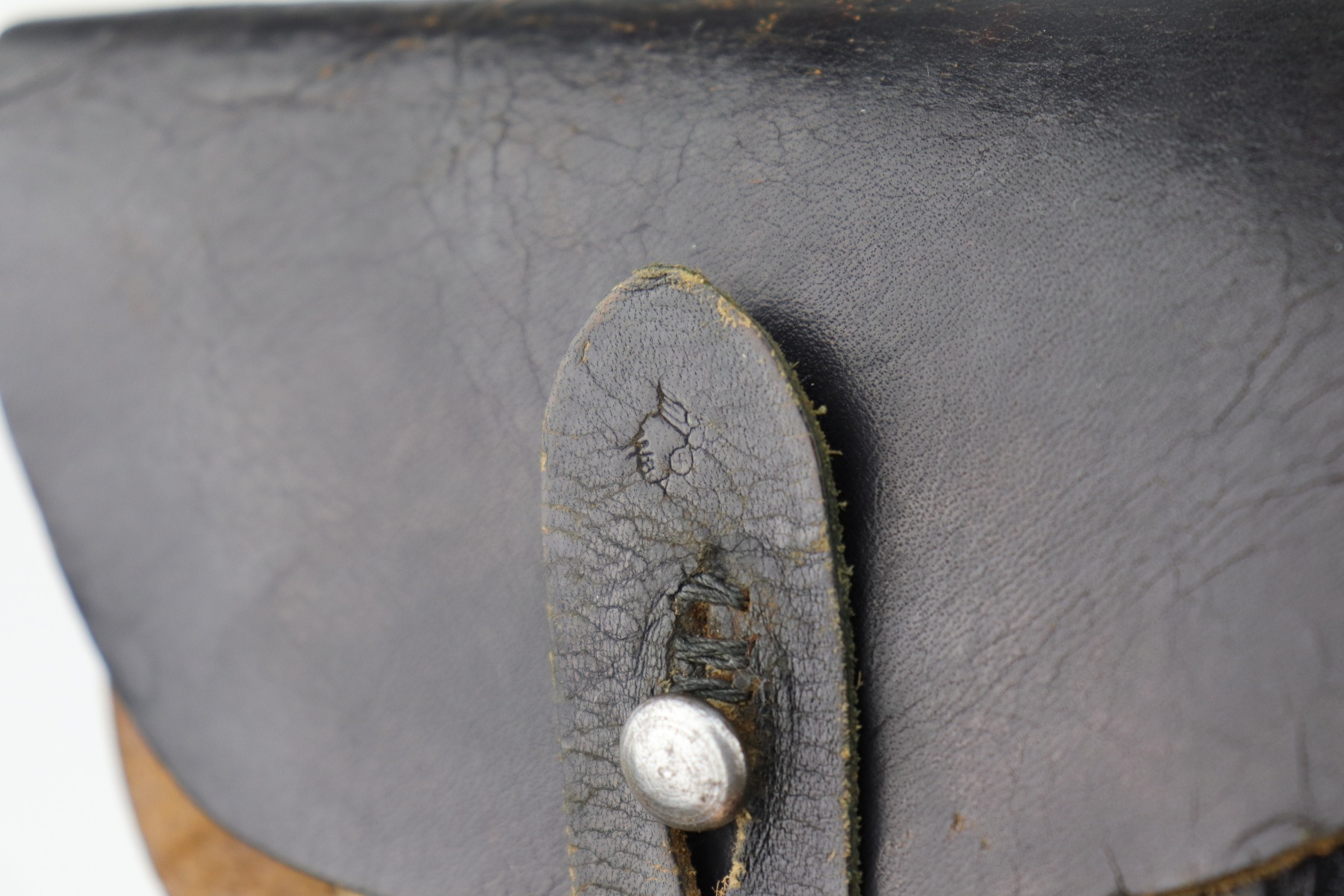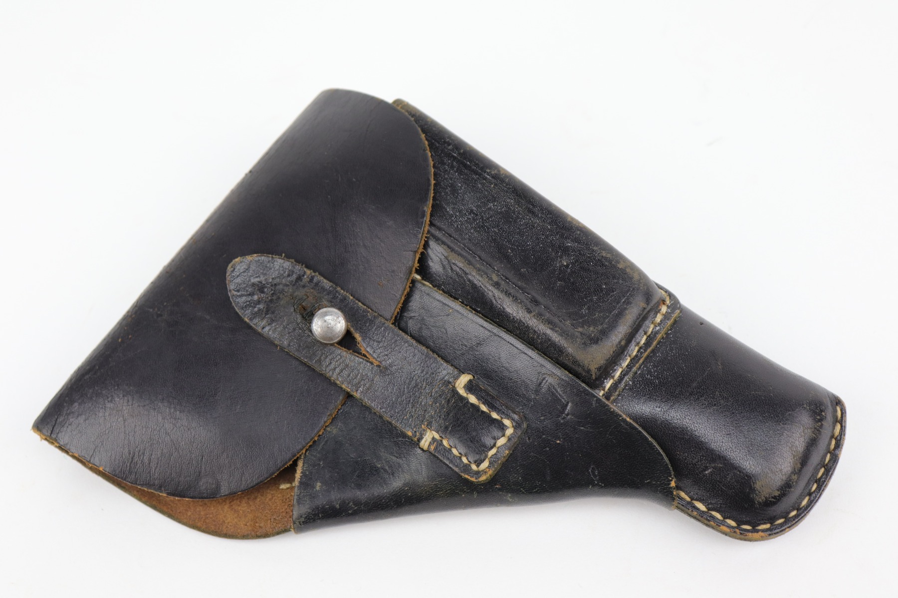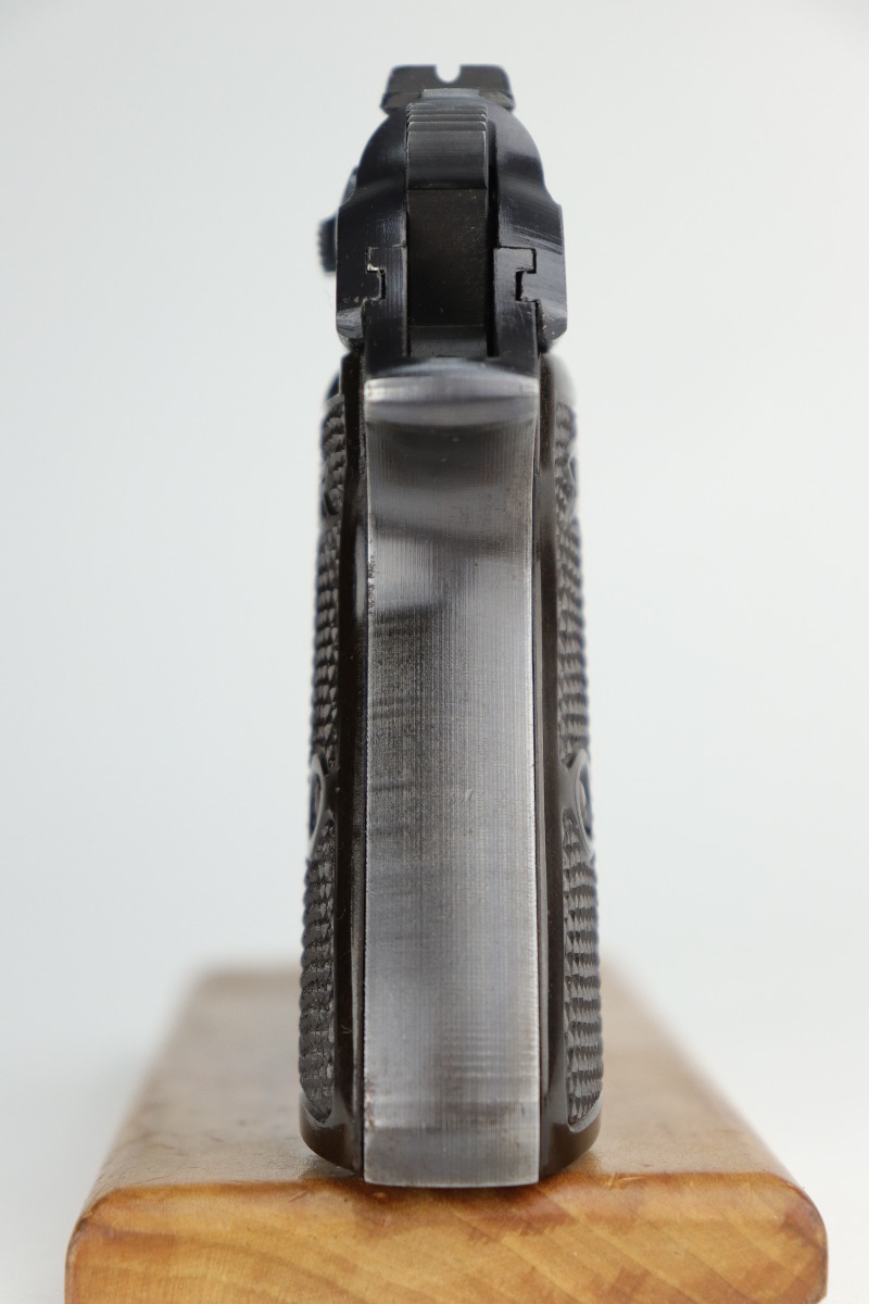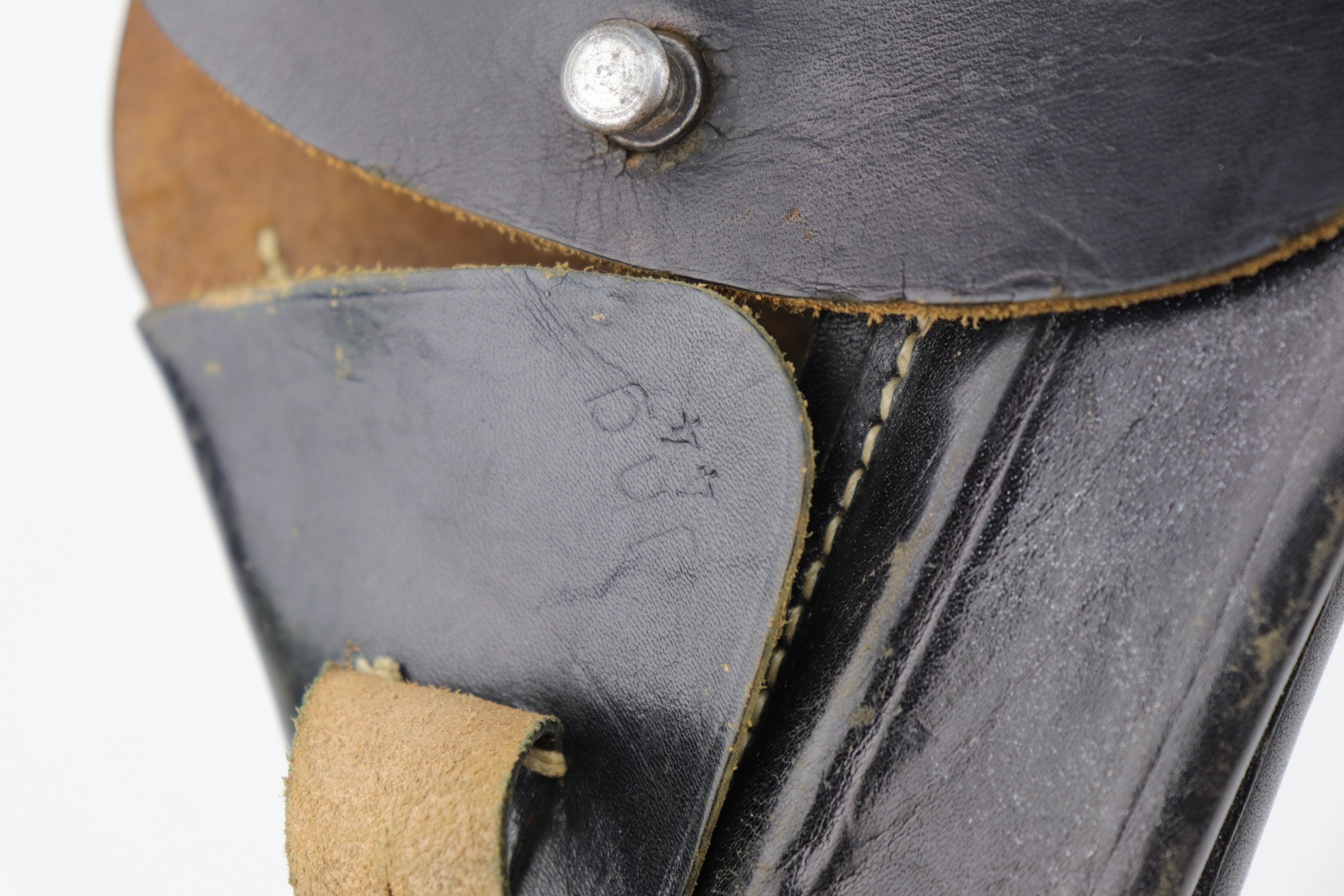 9/18/20 – This is an excellent example of a scarce E/F Walther PP issued to the Nazi police force in 1944. There is an “Eagle F” marking on the left side of the frame. Only about 5,000 of these guns were produced. This rig comes with a black leather holster and two magazines. The gun is in excellent condition, retaining about 97-98% of its original bluing. There is very minor thinning on the straps. There are also a few small areas of discoloration and minor pitting, most noticeable on the left side of the slide. The bore is minty – shiny with strong rifling. It has excellent dark brown bakelite grips. The holster is waffenamt and dated 1944. The top flap has been cut off and re-glued. One of the mags is wartime and the other is an early Walther banner-only magazine. It appears that a post-war legend was added.