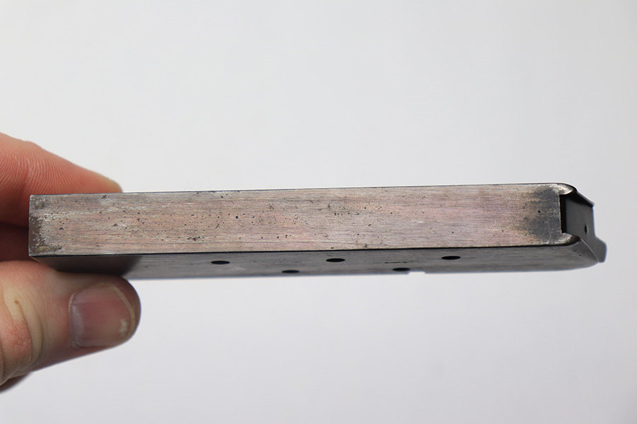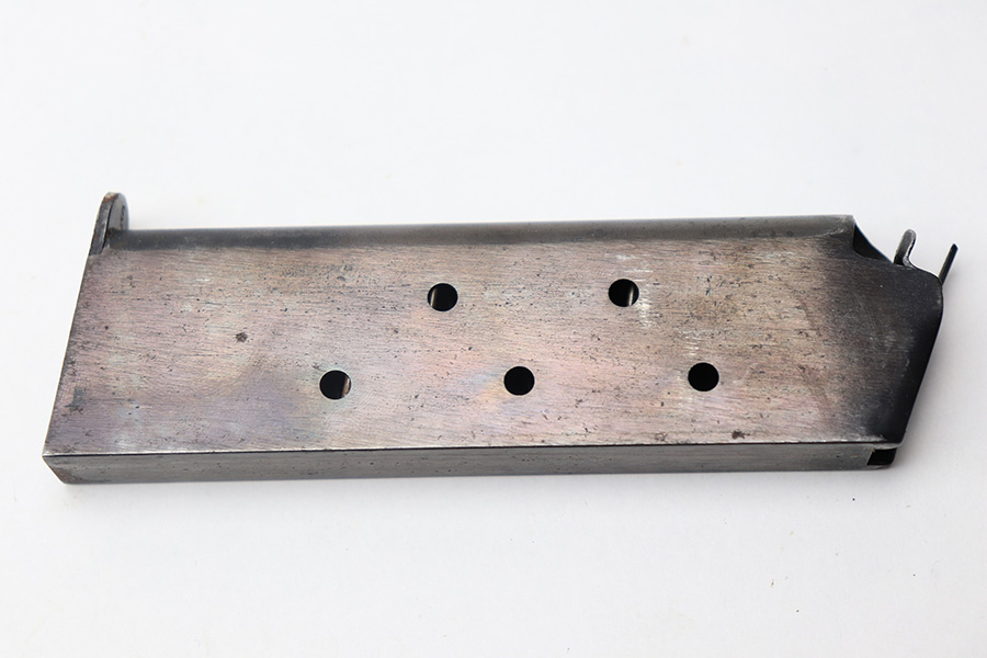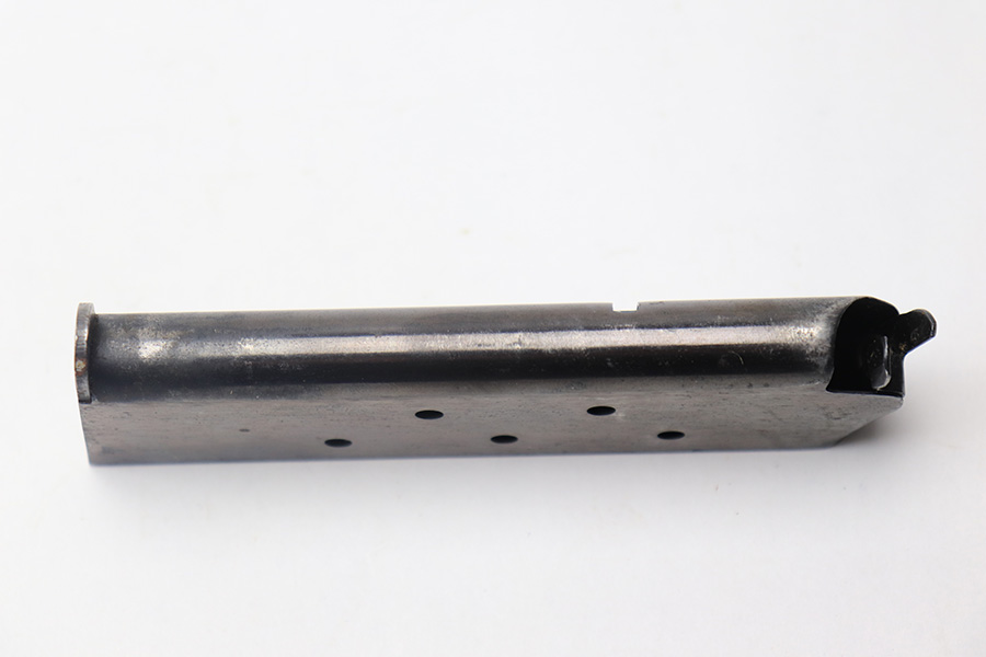 3/30/22 – This is a nice example of a Colt Scoville 1911A1 magazine. It has retained a good portion of its original finish, showing scratchy rub wear throughout. The lip of the magazine base plate is stamped with a “S” and the bottom shows “C-S”. The spring and follower are strong and functional.