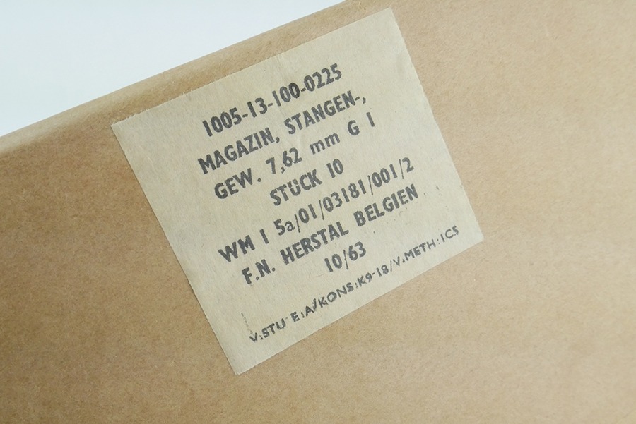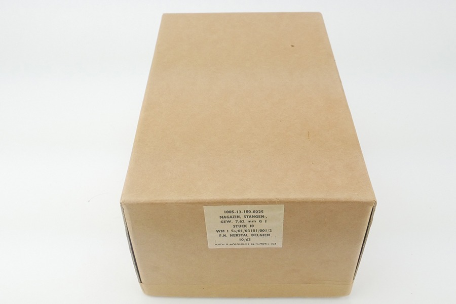 11/4/24 – This is a great example of a still sealed box of 10 FN FAL magazines. These magazines being part of a German contract for the Gewehr G1. These magazines are still in there original brown cardboard shipping box, still sealed. There is a paper label on the box that states,