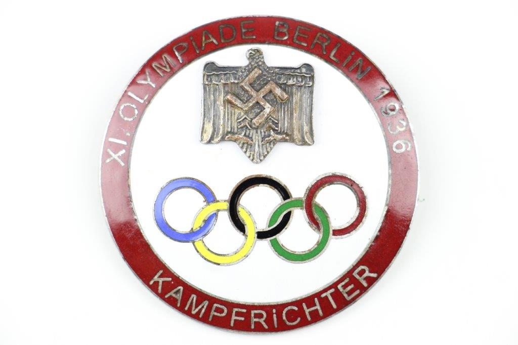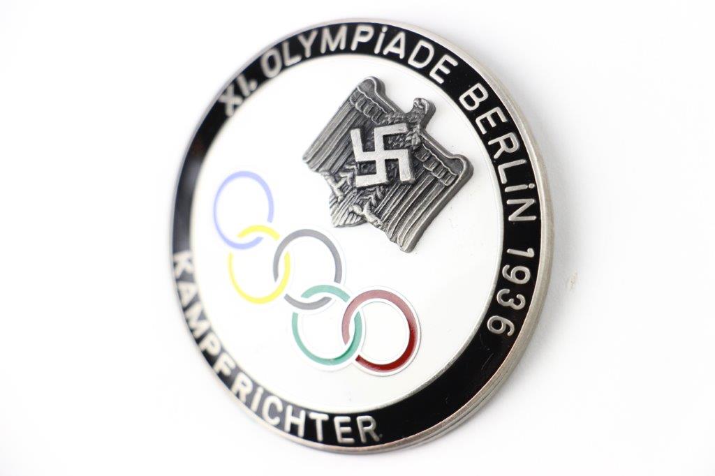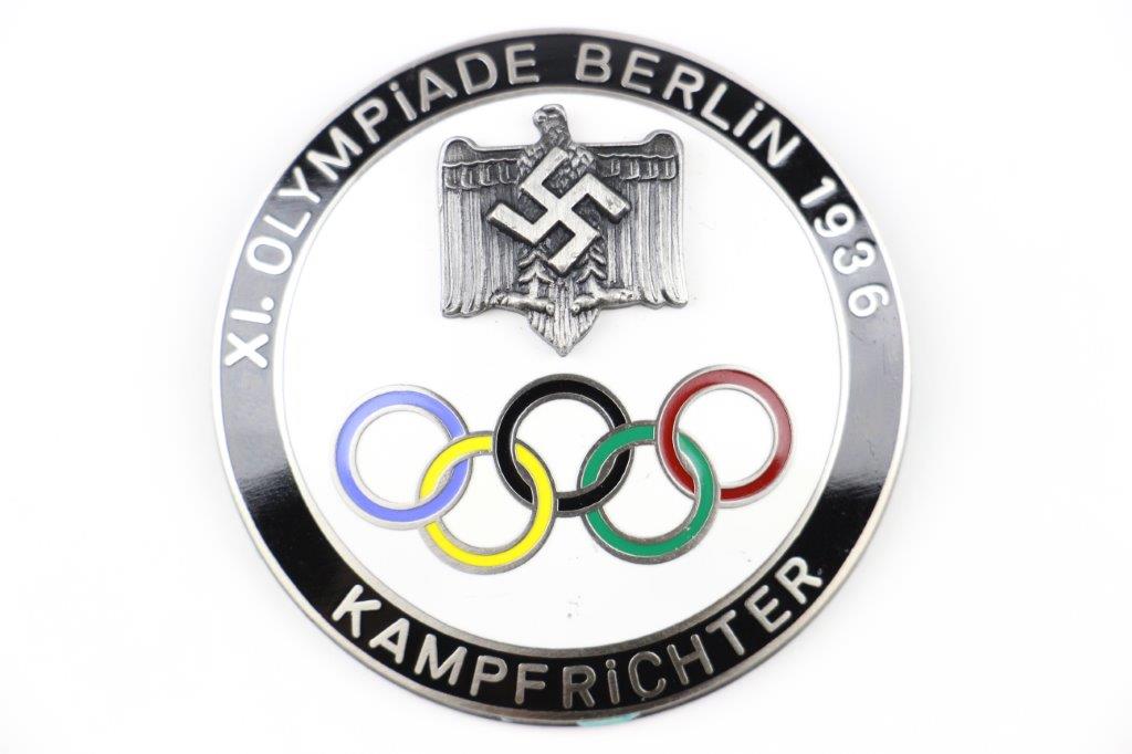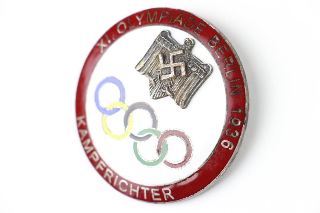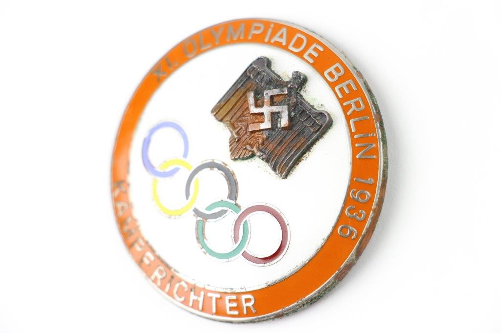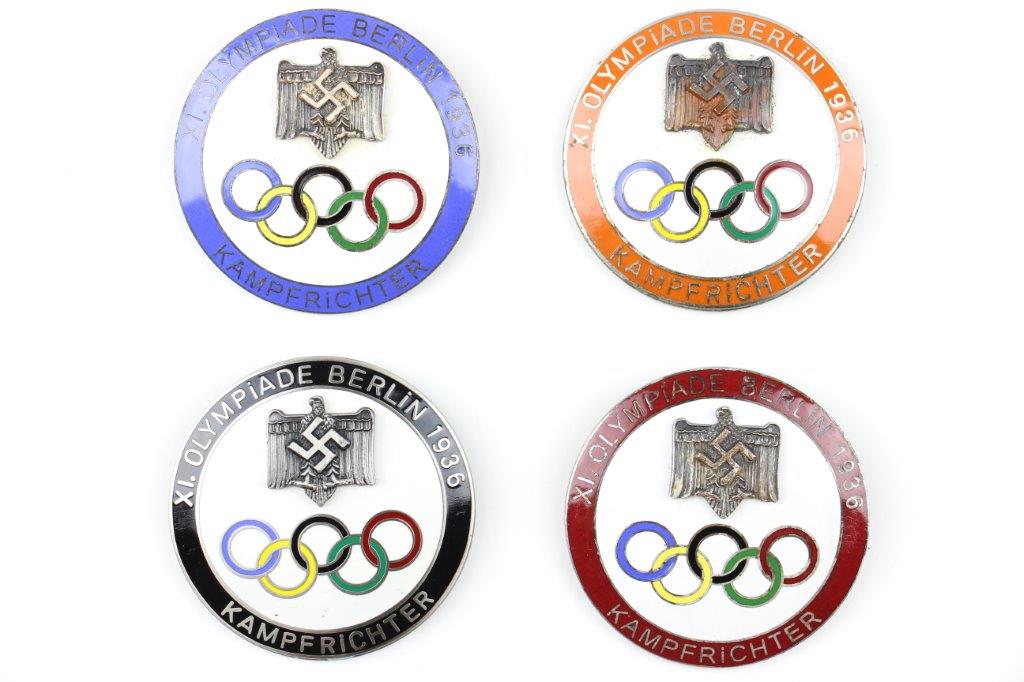 3/21/24 – This is a set of 4 WW2 German 1936 Olympic Games Referee Badges. The badges are each different colored, with each color representing a different event. All 4 are in very good to great condition. The red colored badge has had the emblem re-glued in place. The rest of the badges have secure emblems and original fastening pins intact and functional. Each badge is maker marked on the reverse by the same maker logo (this logo appears to show initials PJC). There’s some mild patina and surface wear on each badge, as shown in photos. The orange and blue badges have some mild spots of rust but this is minimal. Most of the original paint and markings are clear however, and the wear is not excessive.