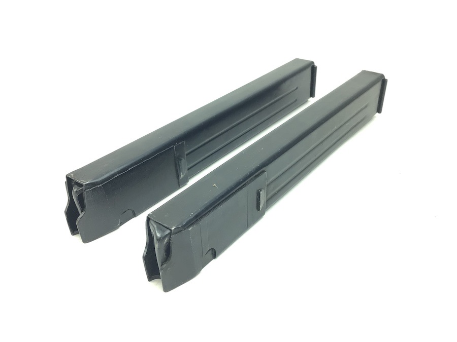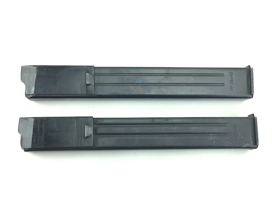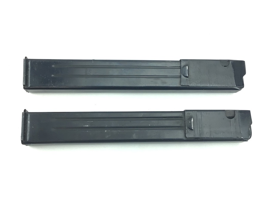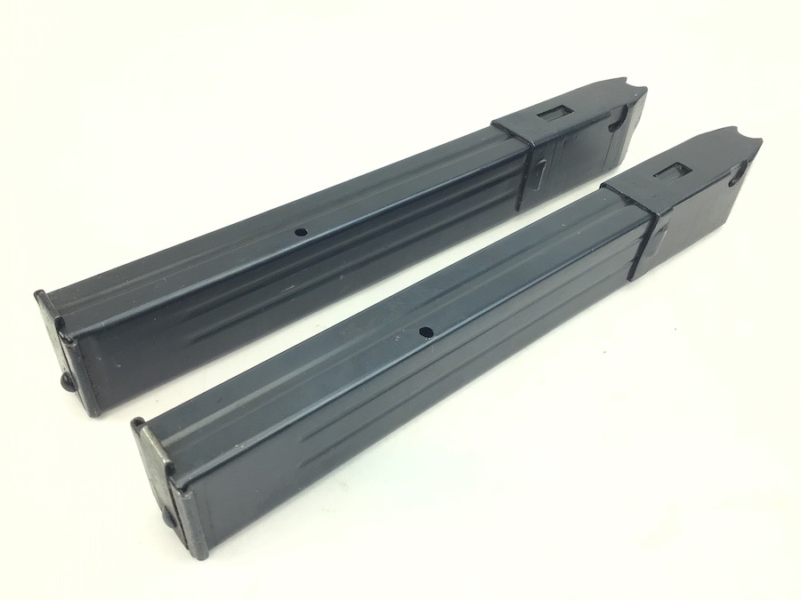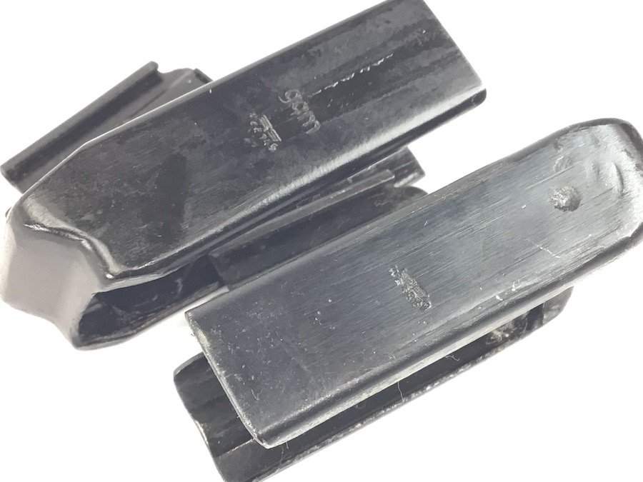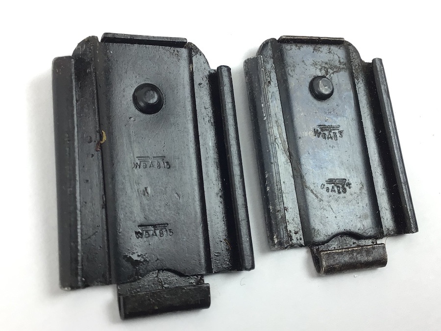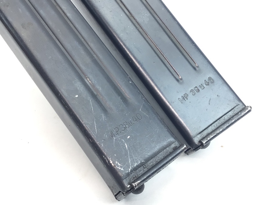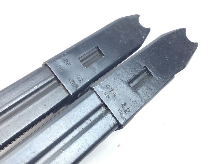 5/3/22 – Set of 2. These are original 1942 dated Mp 38 or 40 magazine. The magazines are waffen proofed, dated, and maker code stamped “98E” and “bte”. Overall in great shape with some normal spots of wear, with no corrosion or pitting. Strong, fully functional spring. Most of the original bluing in tact. Internal small parts are waffen stamped as well.