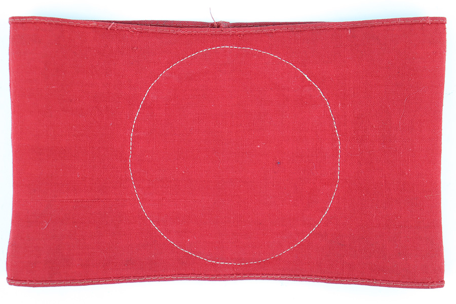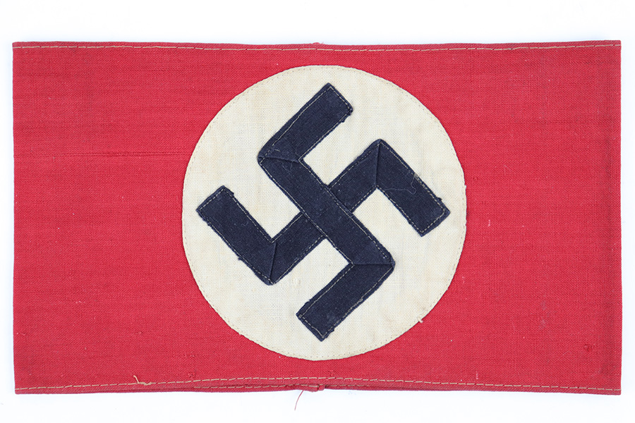 6/23/23 – This is an original WW2 production German Uniform Armband. The armband features a sewn-on central white circle with sewn-on two-piece swastika. The stitching and cloth all passes a black light inspection. Some mild surface aging and light stains but no major issues. Near-excellent overall condition.
