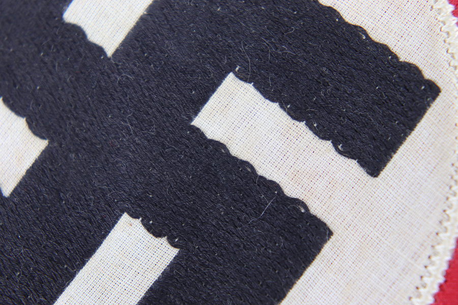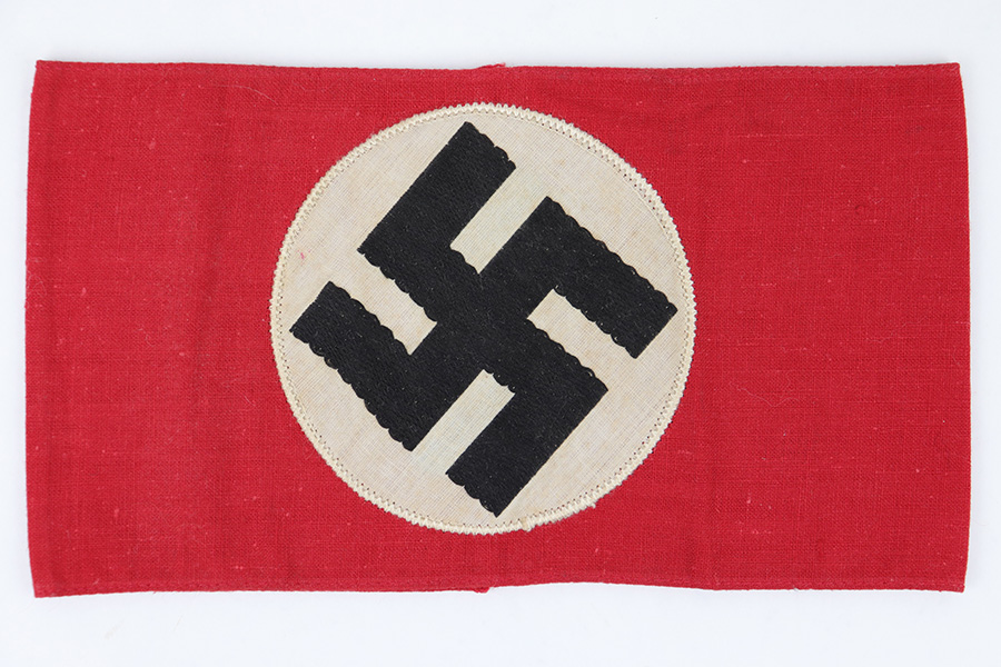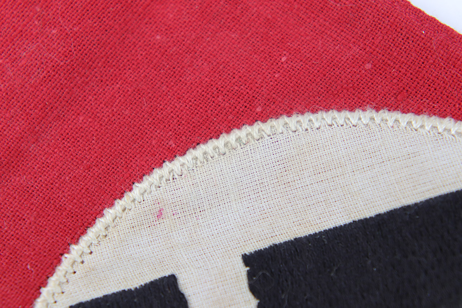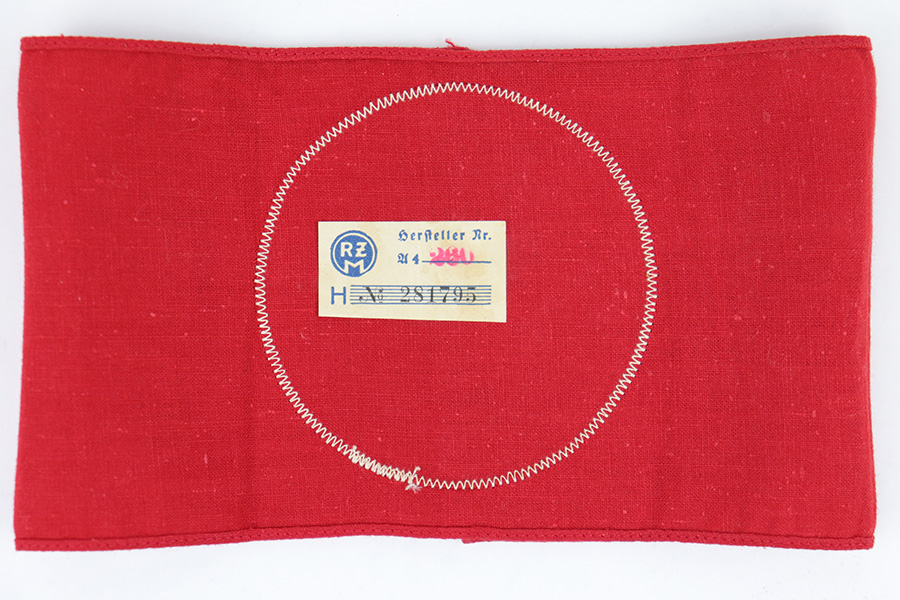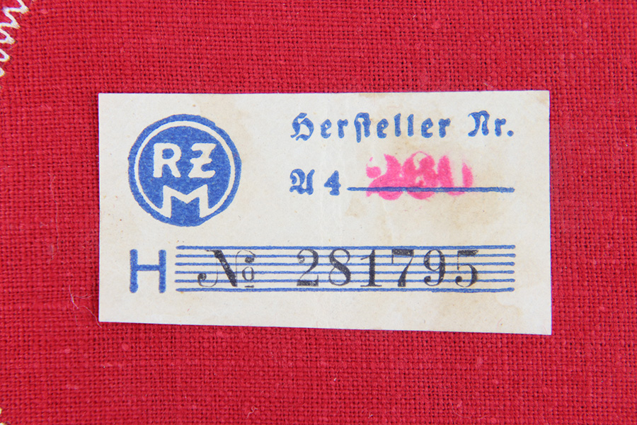 6/27/23 – This is an original, excellent condition Nazi Uniform Armband. The red linen is clean and excellent with minimal surface aging and wear. The armband features a sewn-on central white circle and a stitched black cloth swastika logo. The interior has an original RZM maker tag still attached as well. No stitching issues and passes a black light test.