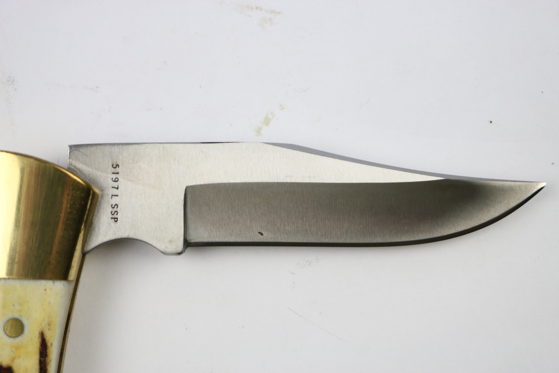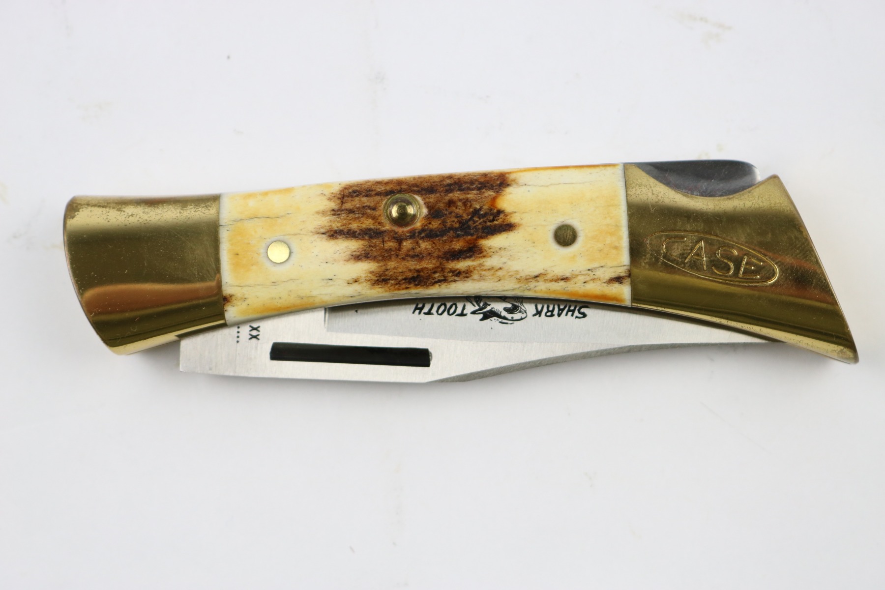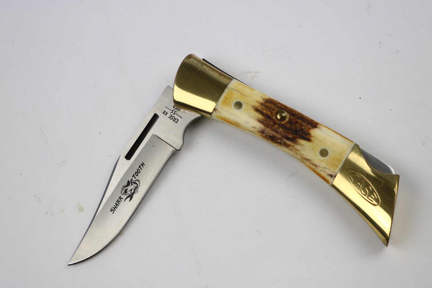 6/21/18 – This is an original Case XX SS USA 10 Dot (1980) Stag 5197L SSP Shark Tooth Lockback Knife. Excellent pocket knife in like-new condition. 3 inch blade never sharpened and looks unused. Engraved shark and Shark Tooth inscription on the blade. Stag handle with brass metal and a stainless steel lock. Beautiful collectible case knife. 4.75 inches when closed.