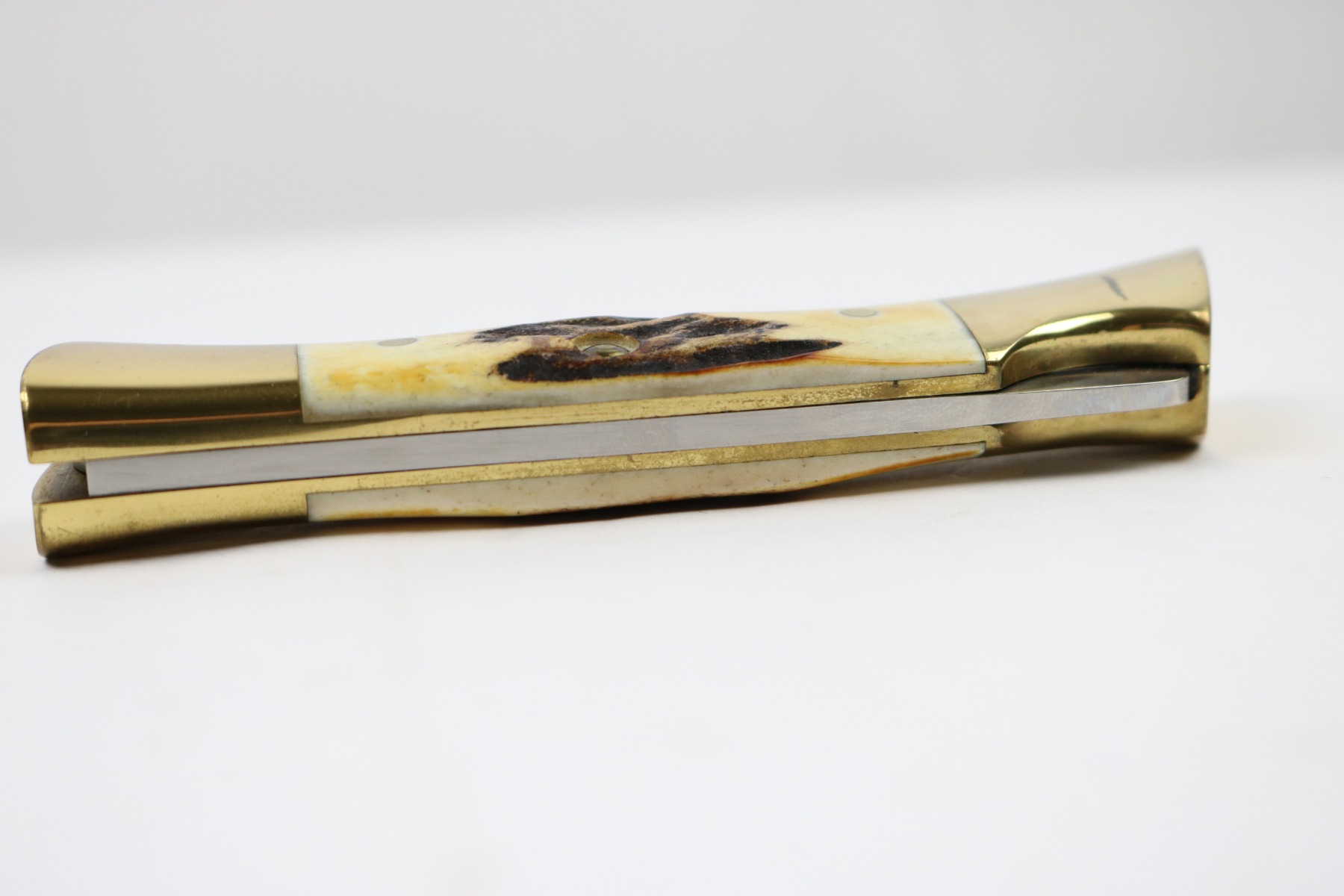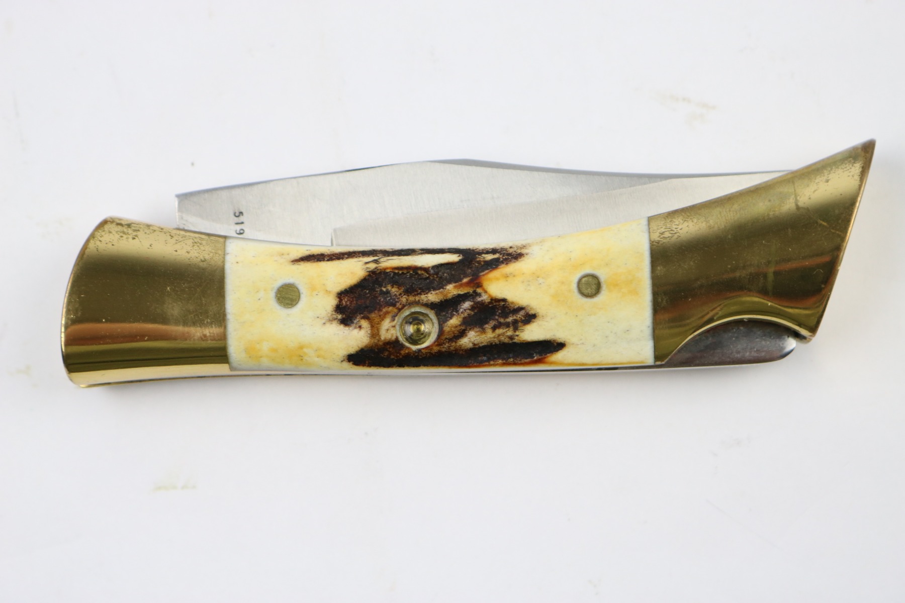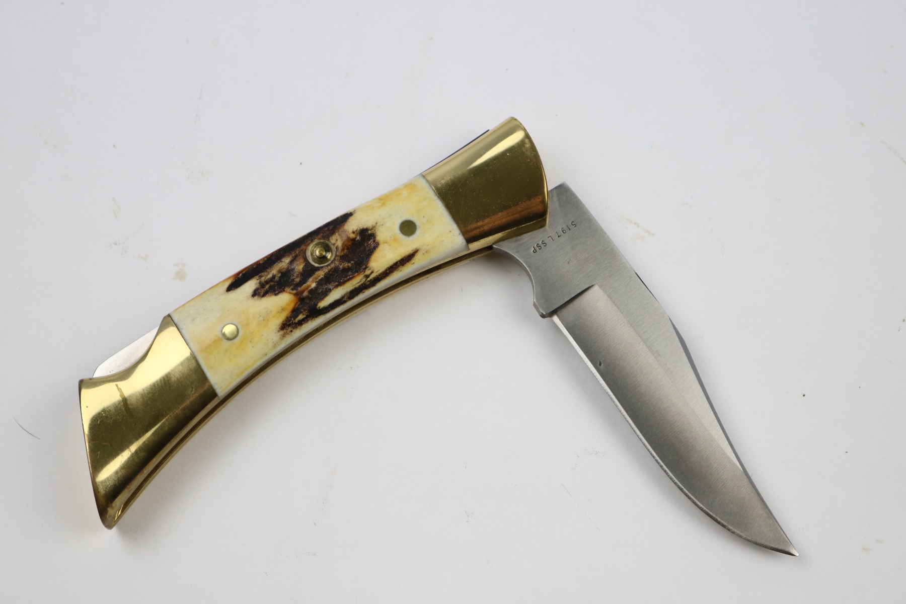 6/21/18 – This is an original Case XX SS USA 10 Dot (1980) Stag 5197L SSP Shark Tooth Lockback Knife. Excellent pocket knife in like-new condition. 3 inch blade never sharpened and looks unused. Engraved shark and Shark Tooth inscription on the blade. Stag handle with brass metal and a stainless steel lock. Beautiful collectible case knife. 4.75 inches when closed.