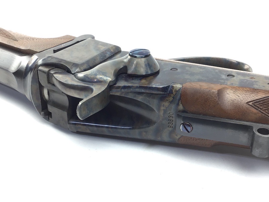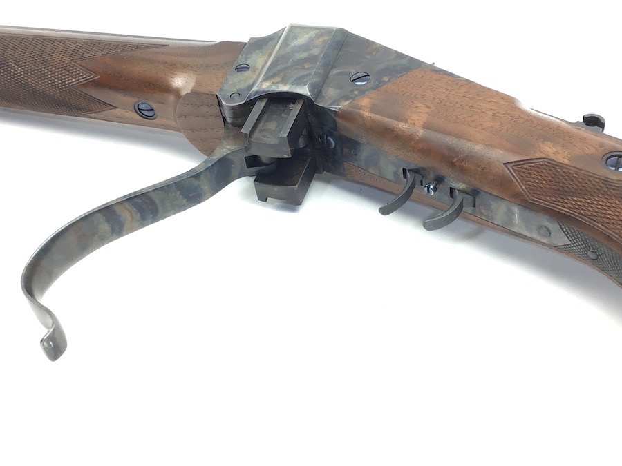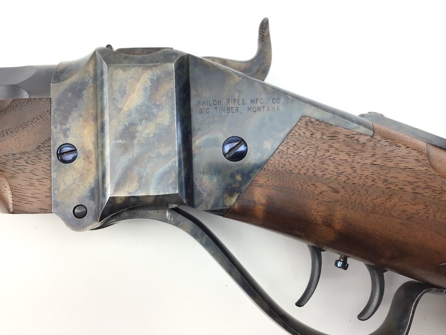 5/17/23 – Excellent, beautiful condition. This single shot, Long Range rifle is chambered in 40/90 caliber. Manufactured by the Shiloh Rifle Manufacturing Company; a family owned business that was established in 1976, and is the recognized leader in the quality production and craftsmanship of the Sharps Rifle. Featuring a 30″, heavy wall, octagonal barrel with a mirror bore. Fitted with a spirt level front sight for accurate shooting. The bluing is in like new condition. The action, hammer and trigger guard are all a beautiful color case. Double set triggers with adjustable pull weight. Extra fancy hardwood stock and fore guard in beautiful condition with no wear. Very minor scratch on the metal portion of the hand guard as shown in photos. Includes cleaning rod and hard-shell case. This is not an antique and would require an FFL.