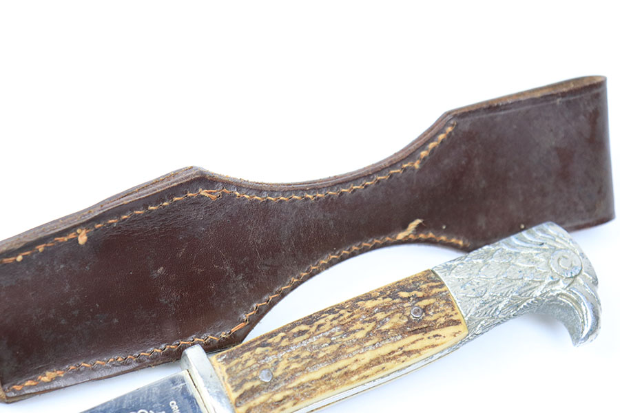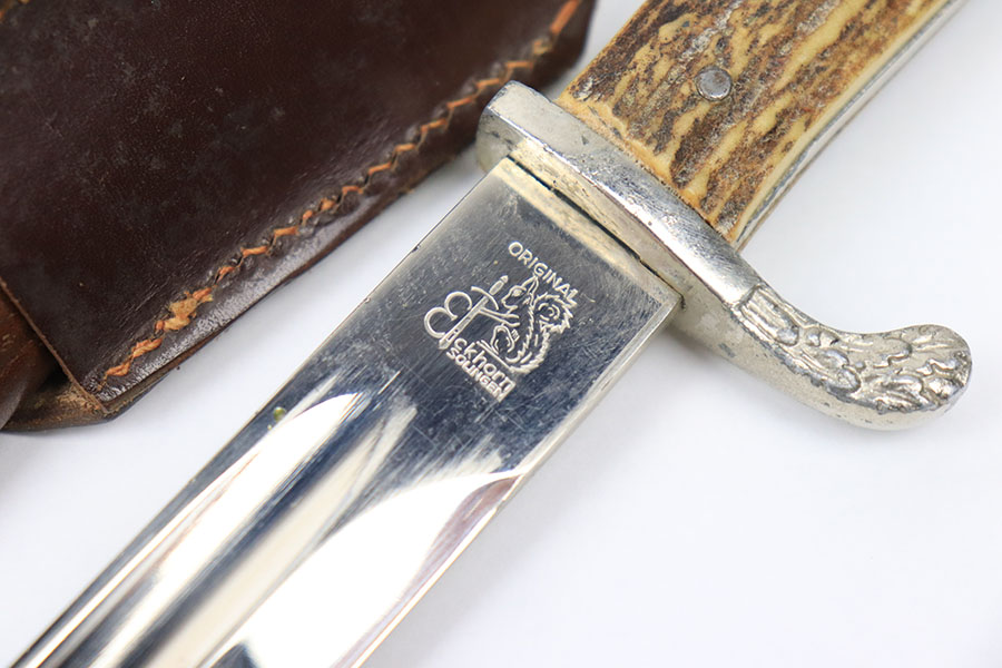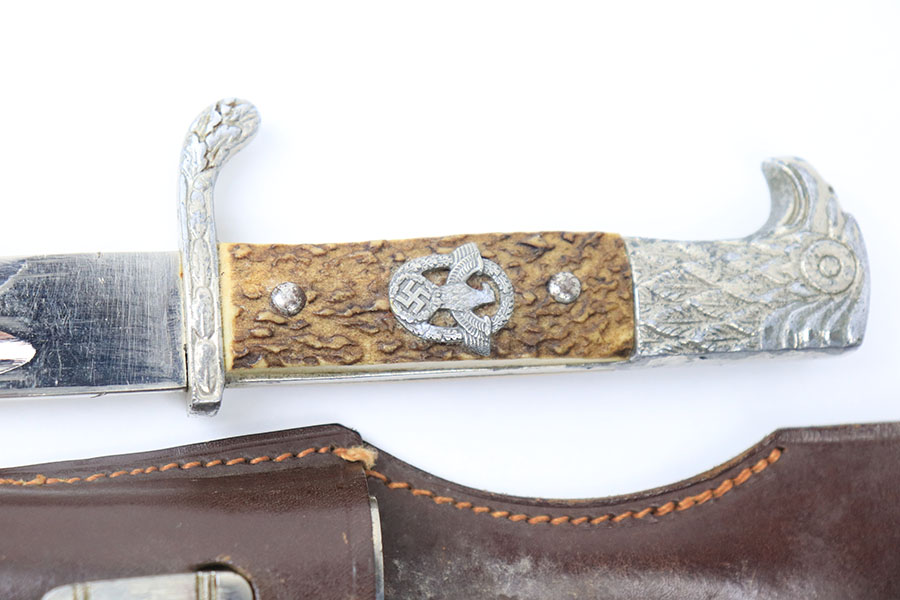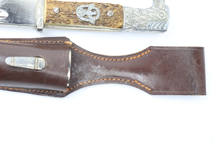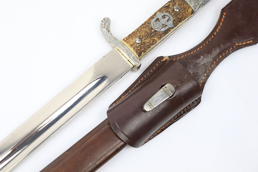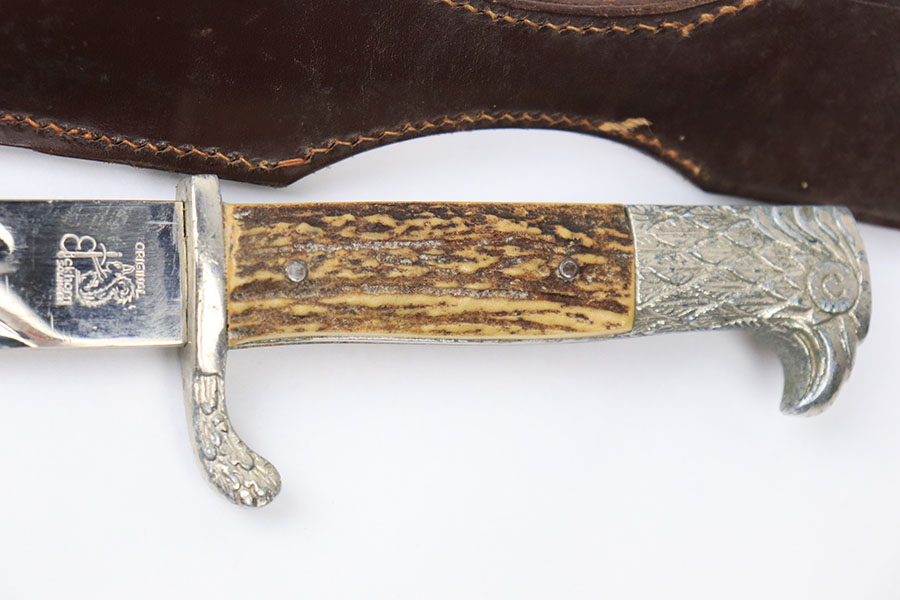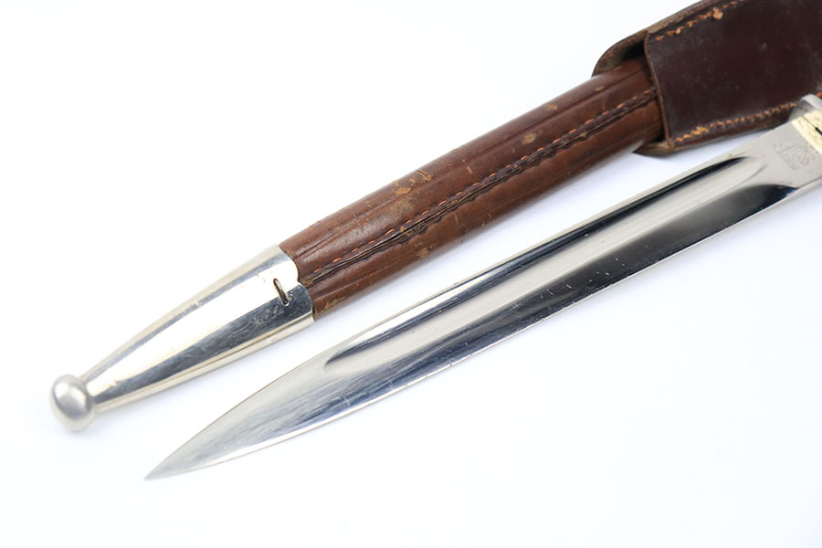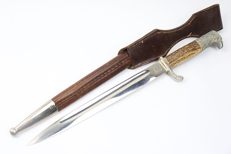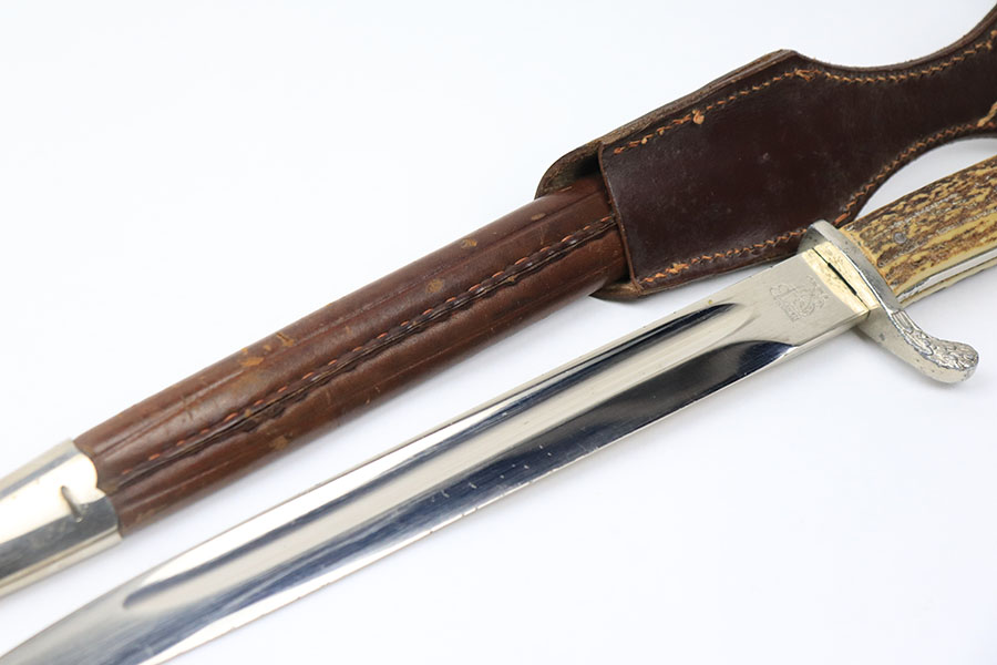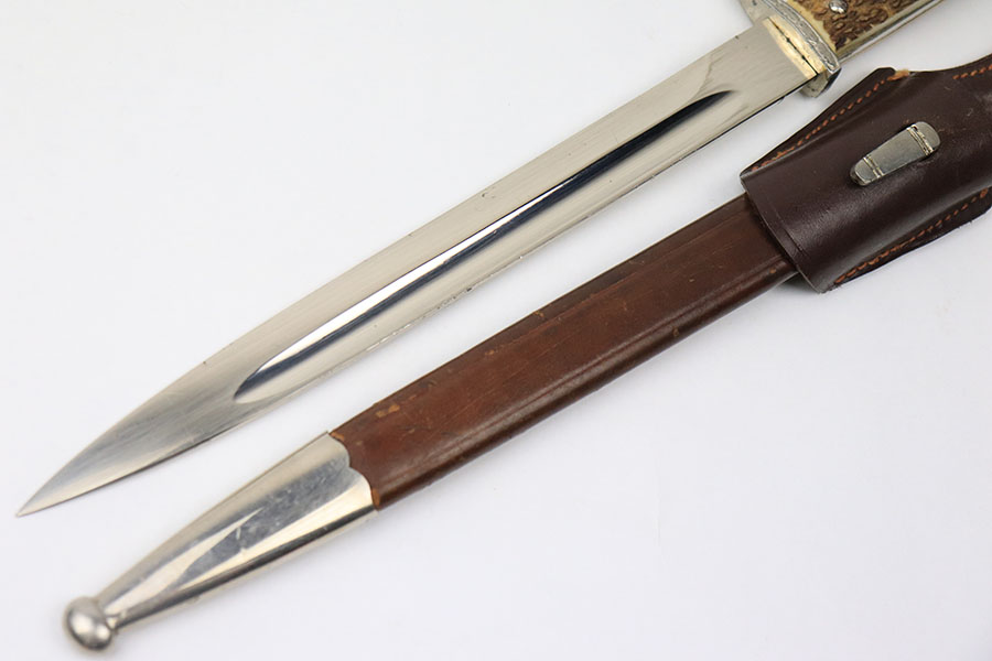 6/24/21 – This is an original Nazi Police dress bayonet from WW2. The blade is Eickhorn maker stamped and in excellent condition. Cut down to approx. 9.5 inches in length, as was commonly done from Weimar era bayonets. Excellent stag handle with police eagle logo pinned to one panel. the scabbard is in excellent condition as well with an unmarked leather frog.