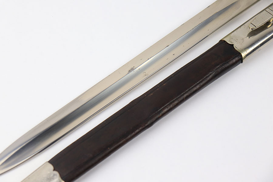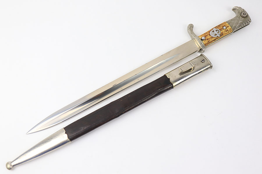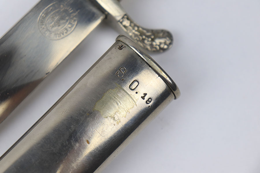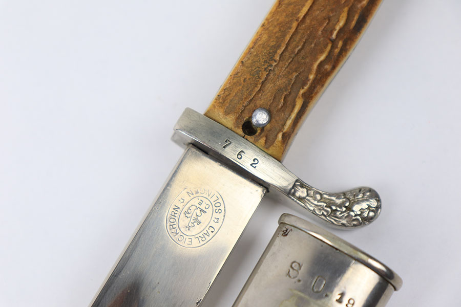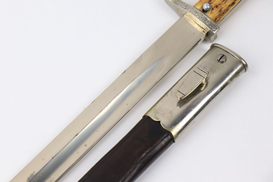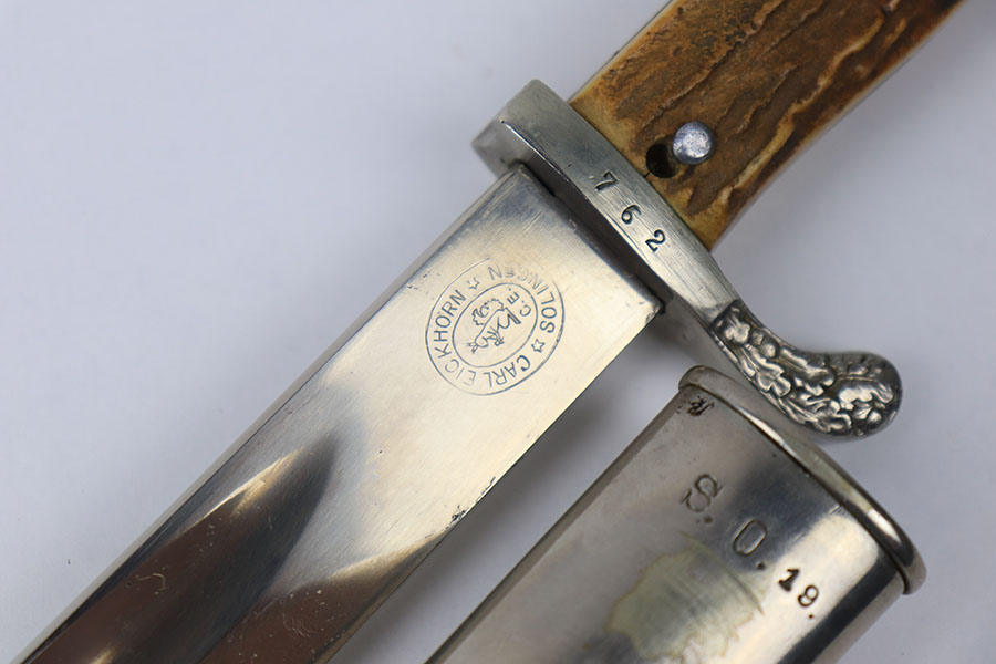 7/6/21 – This is a shortened Police K98 bayonet from WW2. The bayonet blade is about 13 inches long, as most of these were cut down from Imperial era police bayonets for re-use during WW2. The blade is Eickhorn maker marked and in great condition. There is some minor surface patting in a few very small areas. No issues with the stag handles and a unit stamped “762” on the hand guard. The scabbard is excellent as well with no issues.