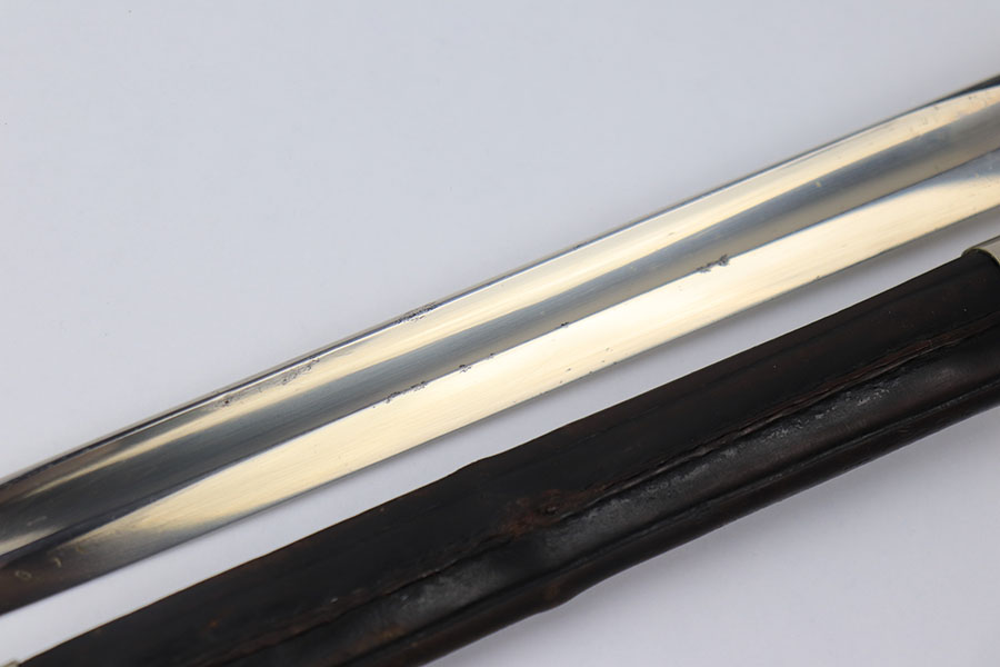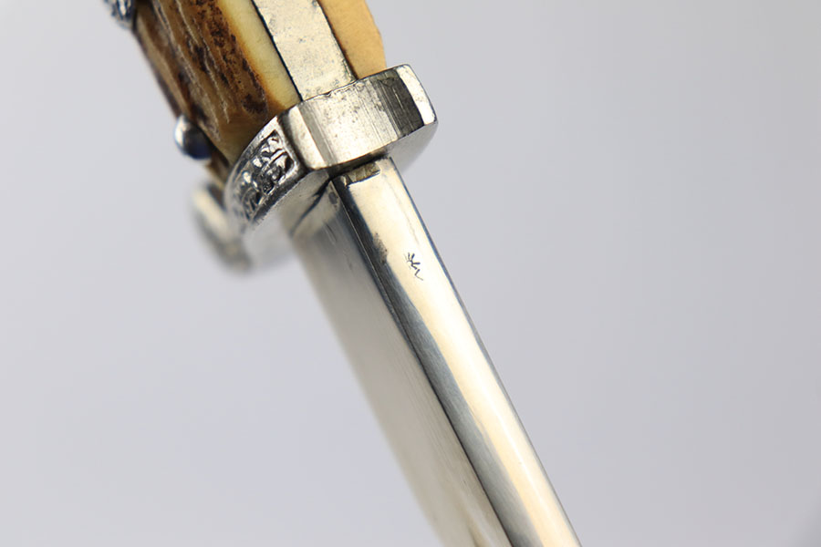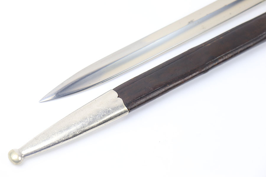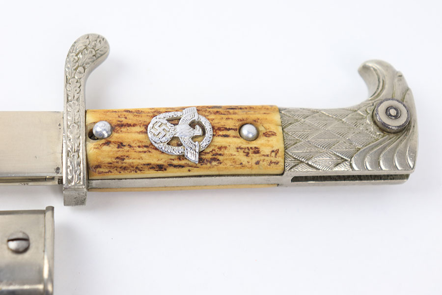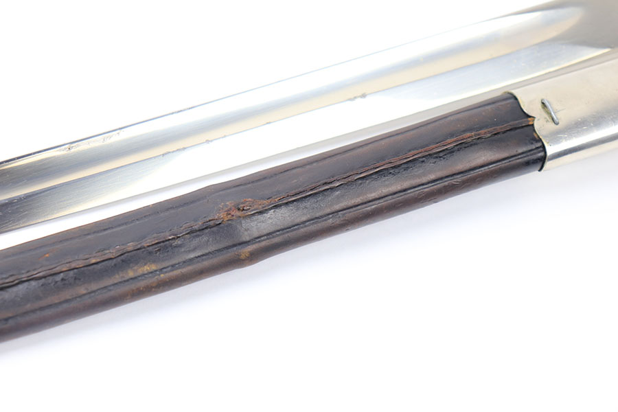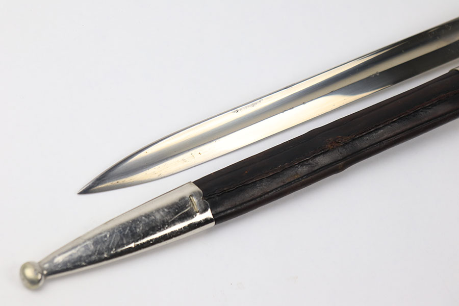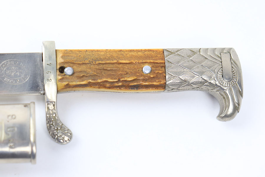 7/6/21 – This is a shortened Police K98 bayonet from WW2. The bayonet blade is about 13 inches long, as most of these were cut down from Imperial era police bayonets for re-use during WW2. The blade is Eickhorn maker marked and in great condition. There is some minor surface patting in a few very small areas. No issues with the stag handles and a unit stamped “762” on the hand guard. The scabbard is excellent as well with no issues.