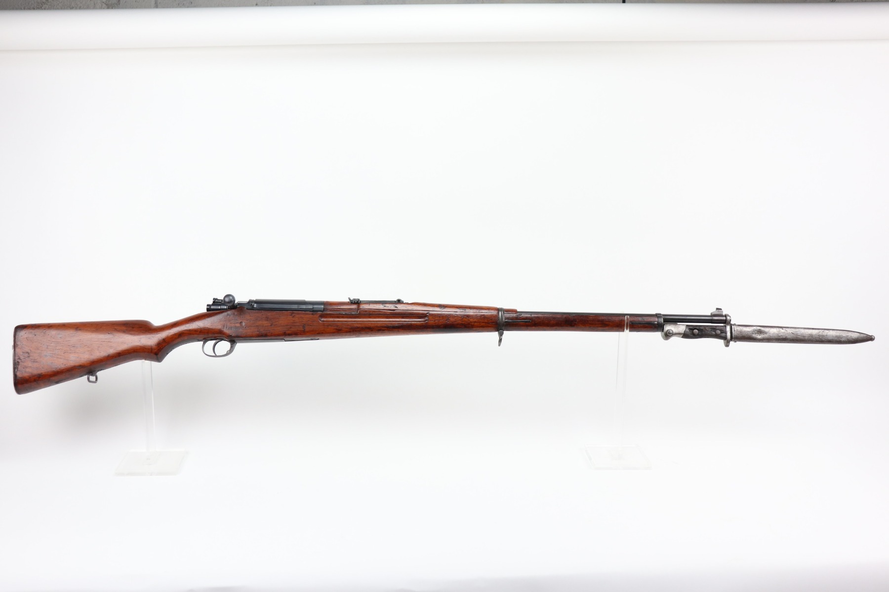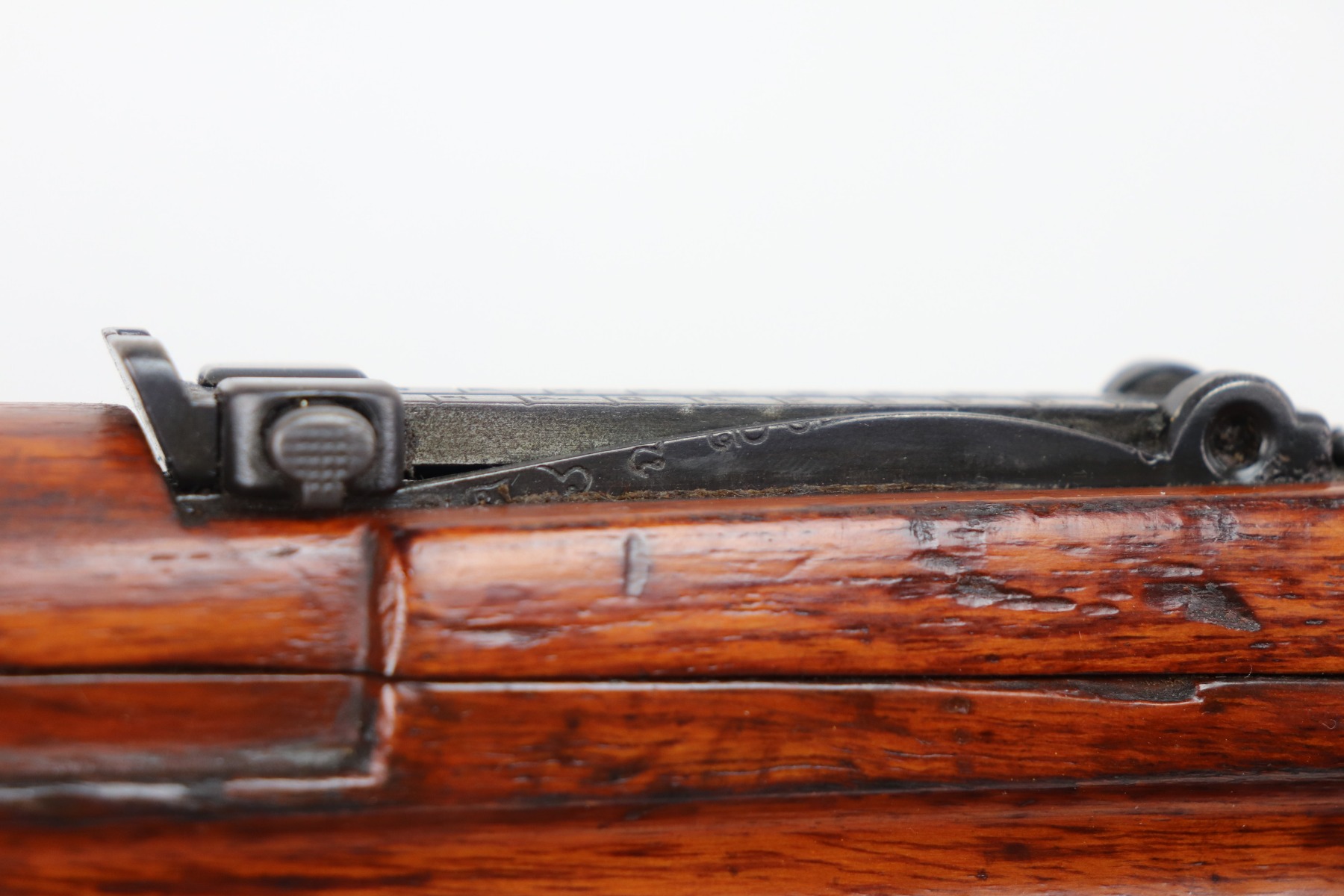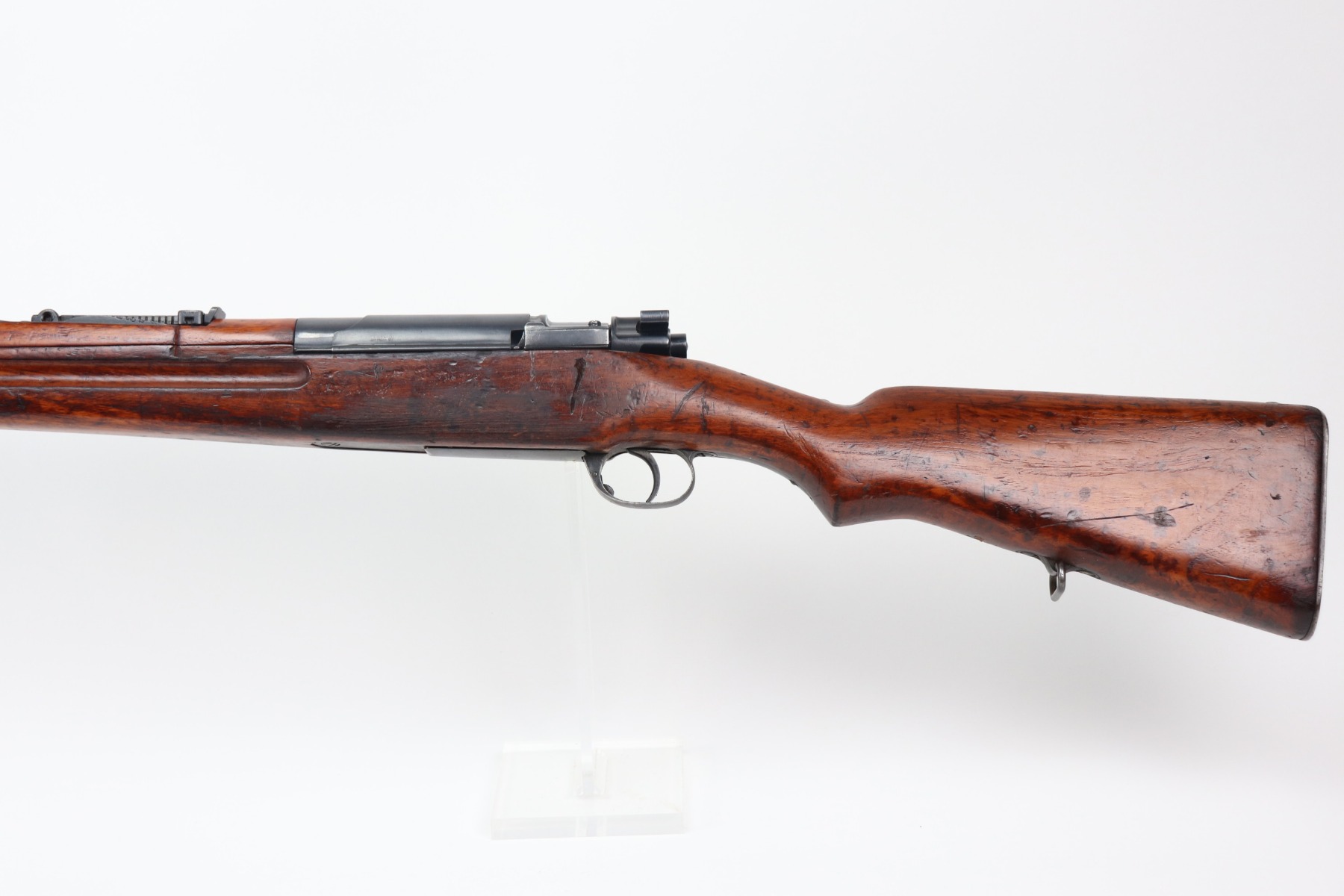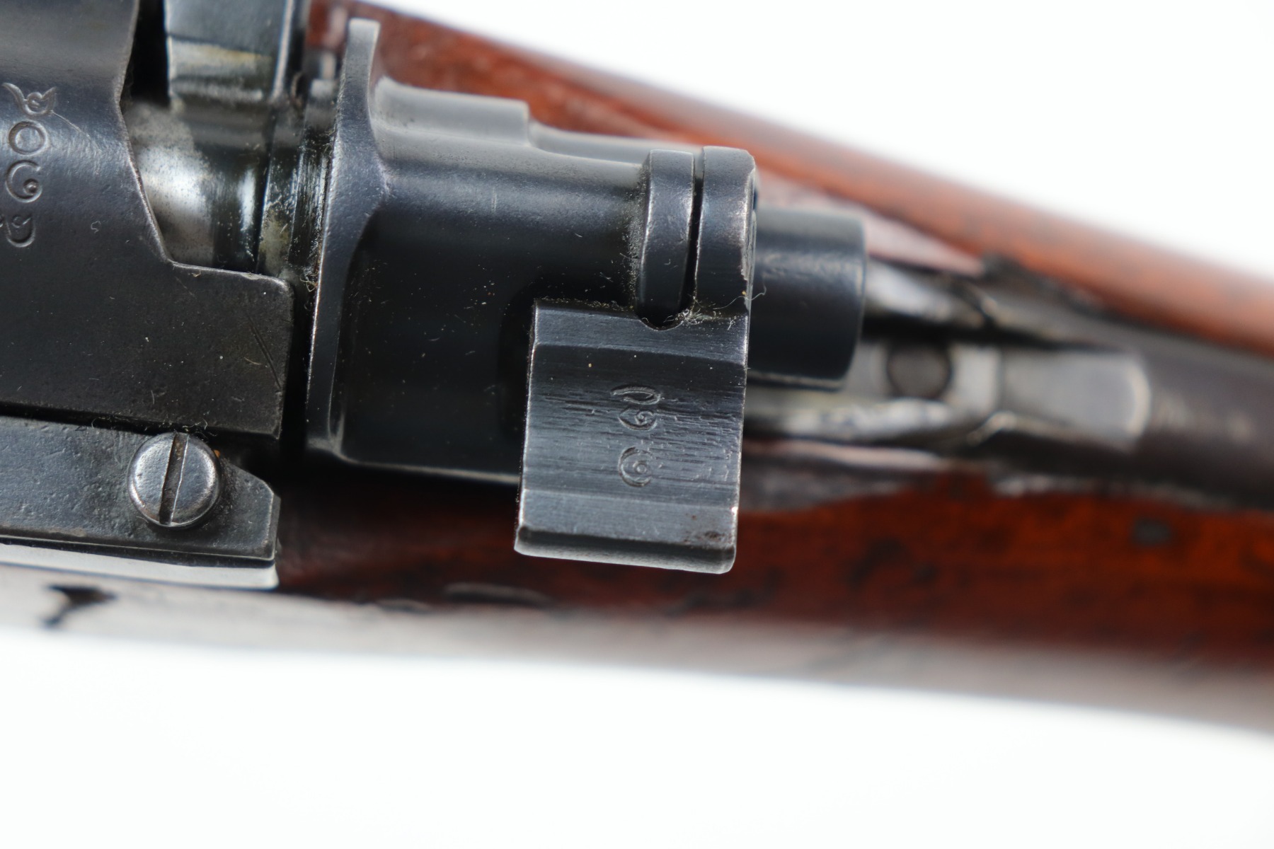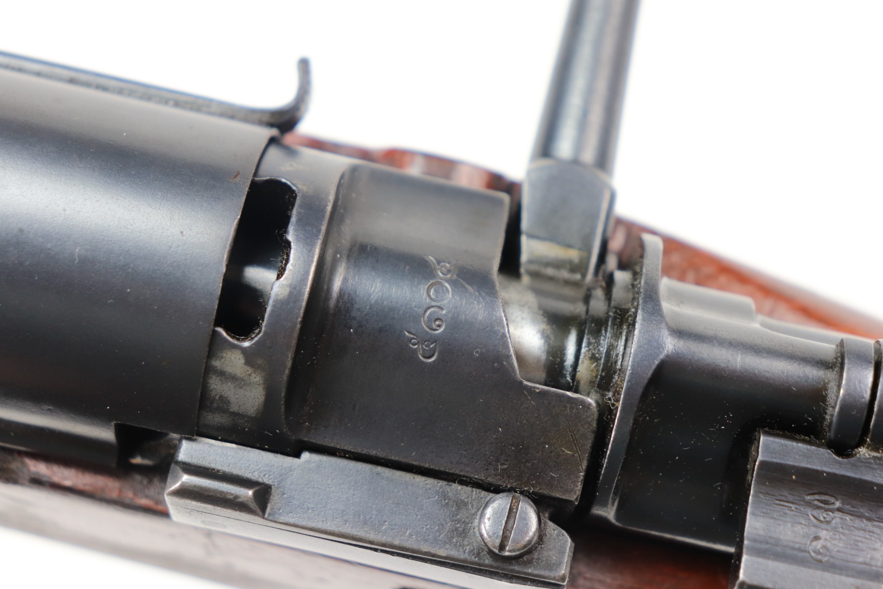2/22/21 – This is a Siamese Mauser Type 46/66 Rifle, chambered in 8x52mm. It was made for the Siamese military at the Tokyo Arsenal. It was originally a Type 46 rifle, chambered in 8x50mm that was later converted to a more convenient 8x52mm Spitzer cartridge. You can tell because the characters on the adjustable rear sight have been partially ground when the sight was modified. The gun comes with an original dust cover and matching bayonet. The metal parts are minty, retaining virtually all of their finish except for minor wear around the muzzle. The stock has minor dings, dents, and scratches throughout and a more significant gouge on the left side. The bore is excellent – shiny with strong rifling.