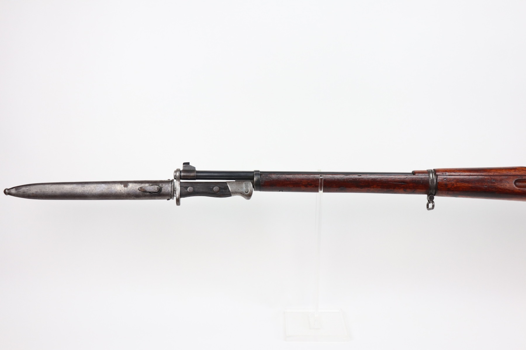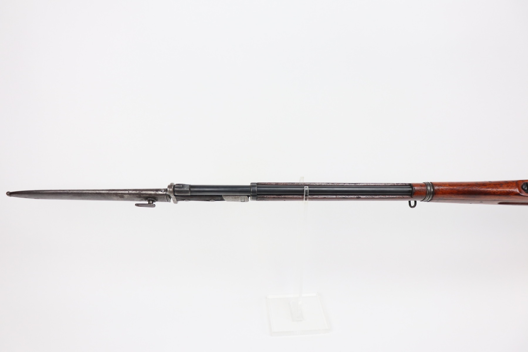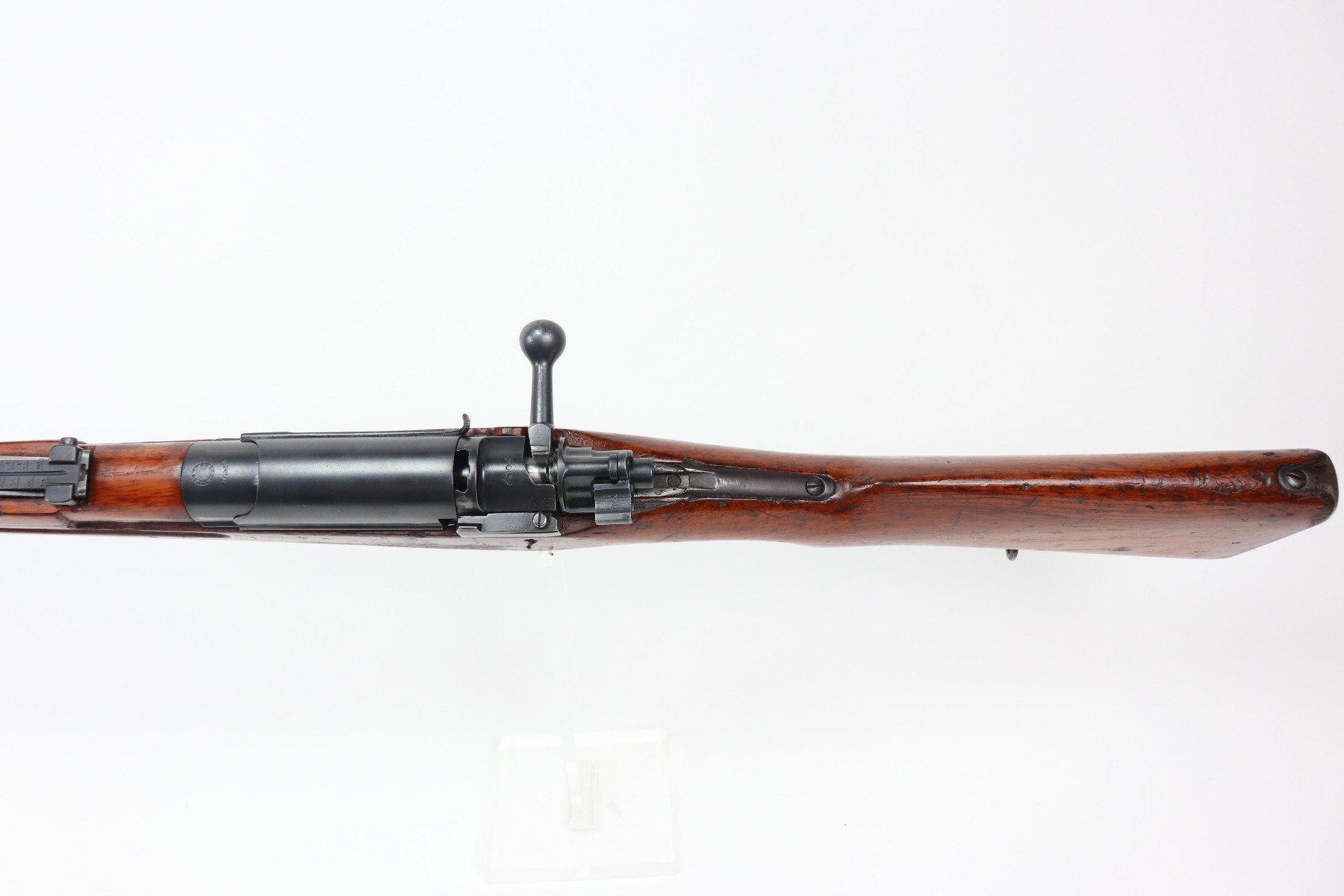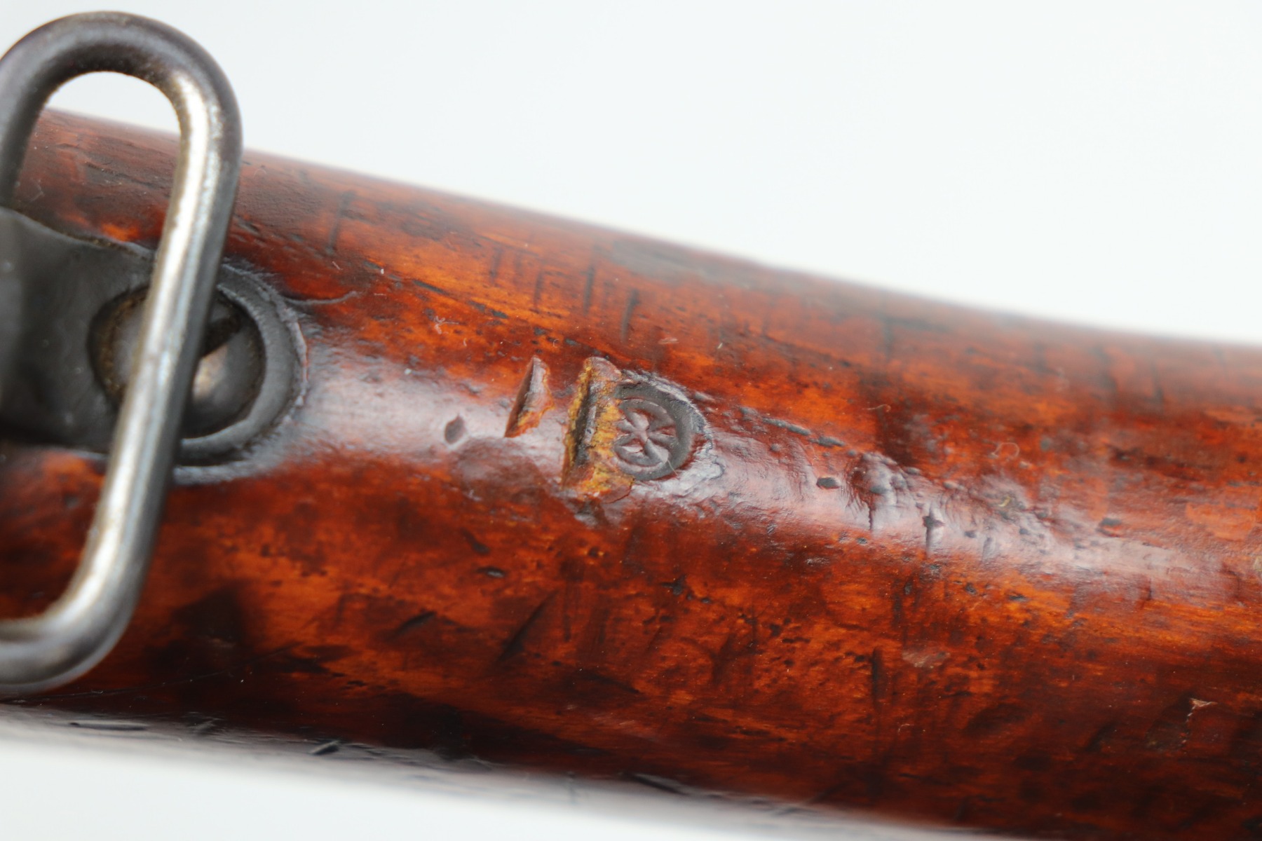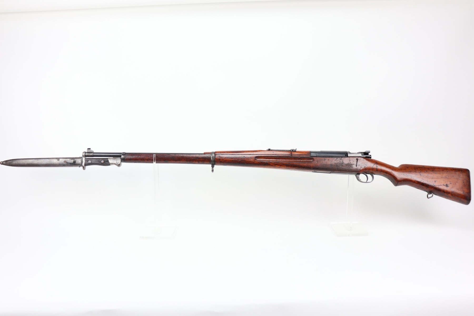 2/22/21 – This is a Siamese Mauser Type 46/66 Rifle, chambered in 8x52mm. It was made for the Siamese military at the Tokyo Arsenal. It was originally a Type 46 rifle, chambered in 8x50mm that was later converted to a more convenient 8x52mm Spitzer cartridge. You can tell because the characters on the adjustable rear sight have been partially ground when the sight was modified. The gun comes with an original dust cover and matching bayonet. The metal parts are minty, retaining virtually all of their finish except for minor wear around the muzzle. The stock has minor dings, dents, and scratches throughout and a more significant gouge on the left side. The bore is excellent – shiny with strong rifling.