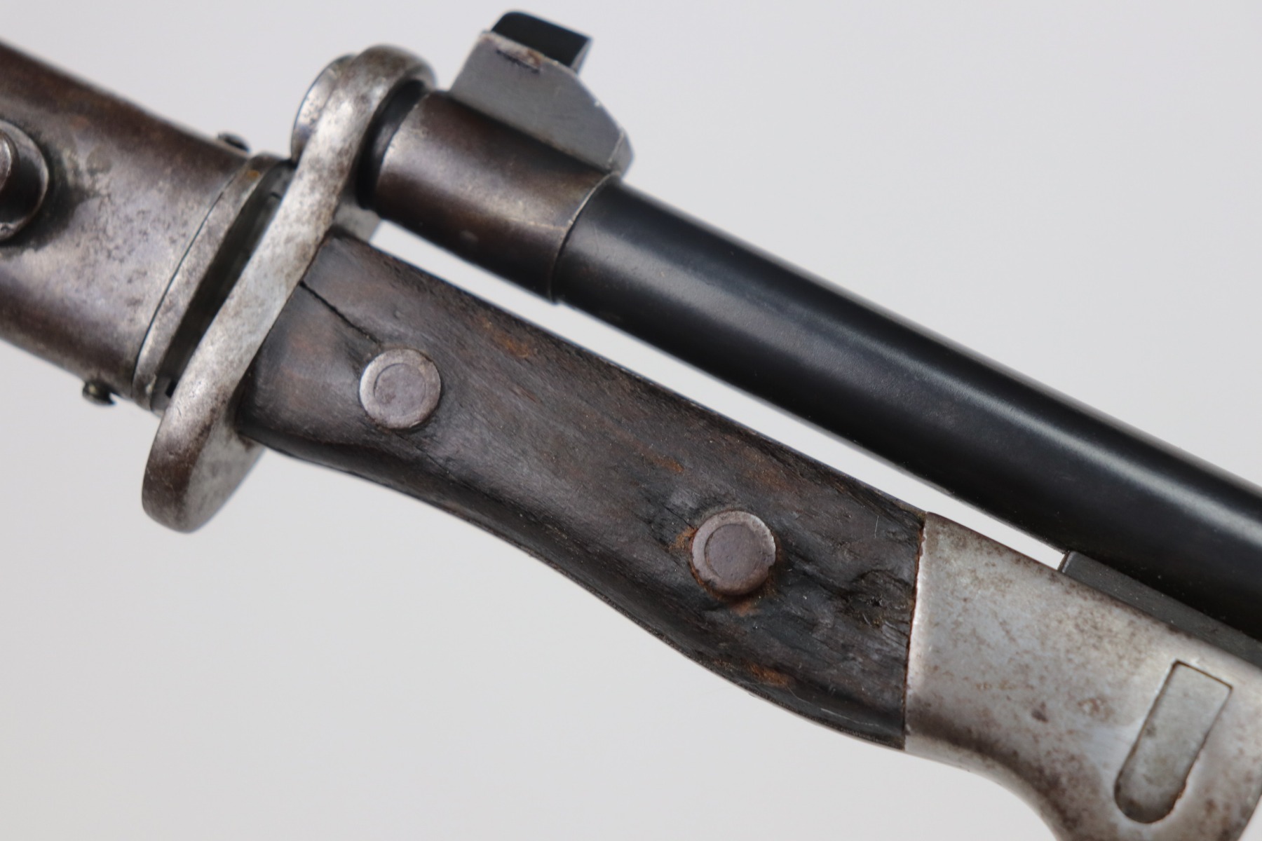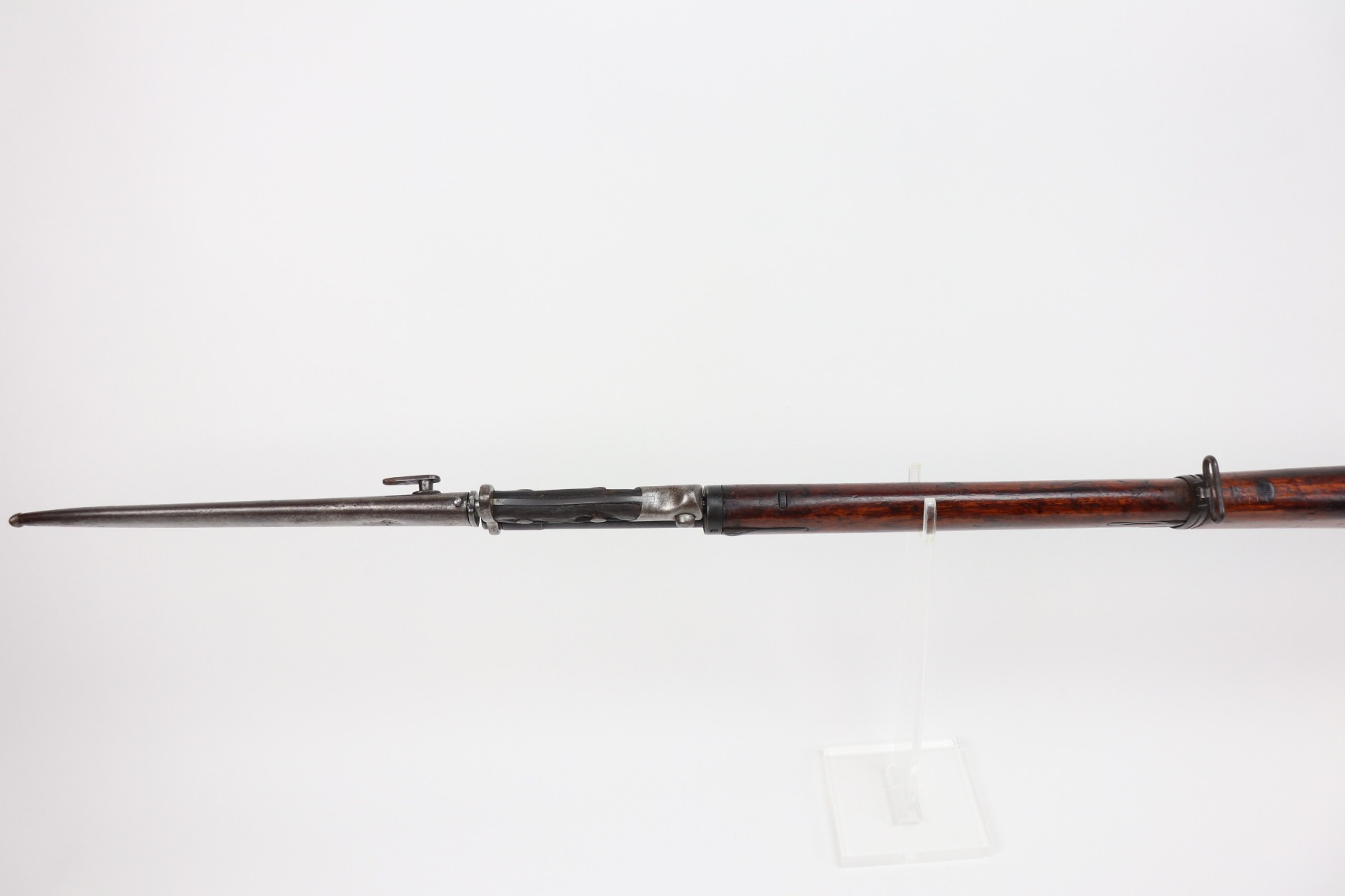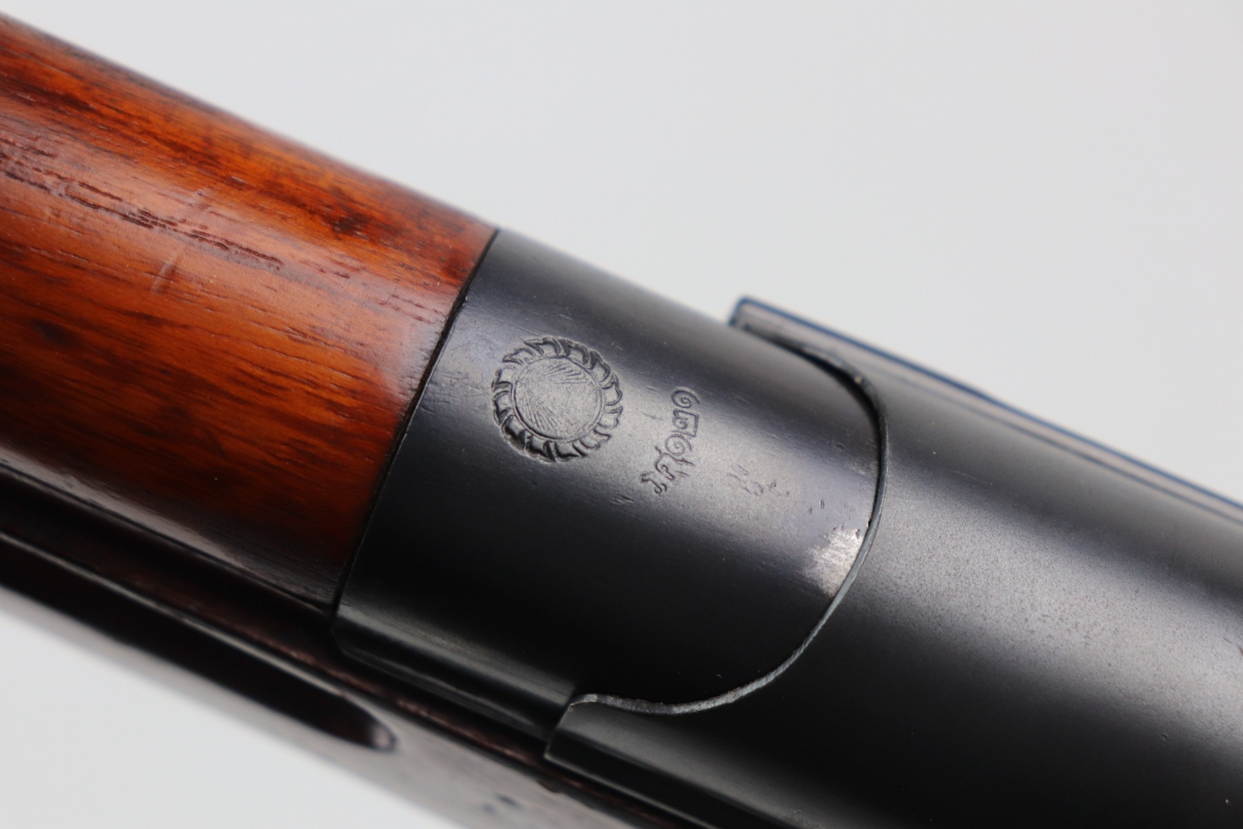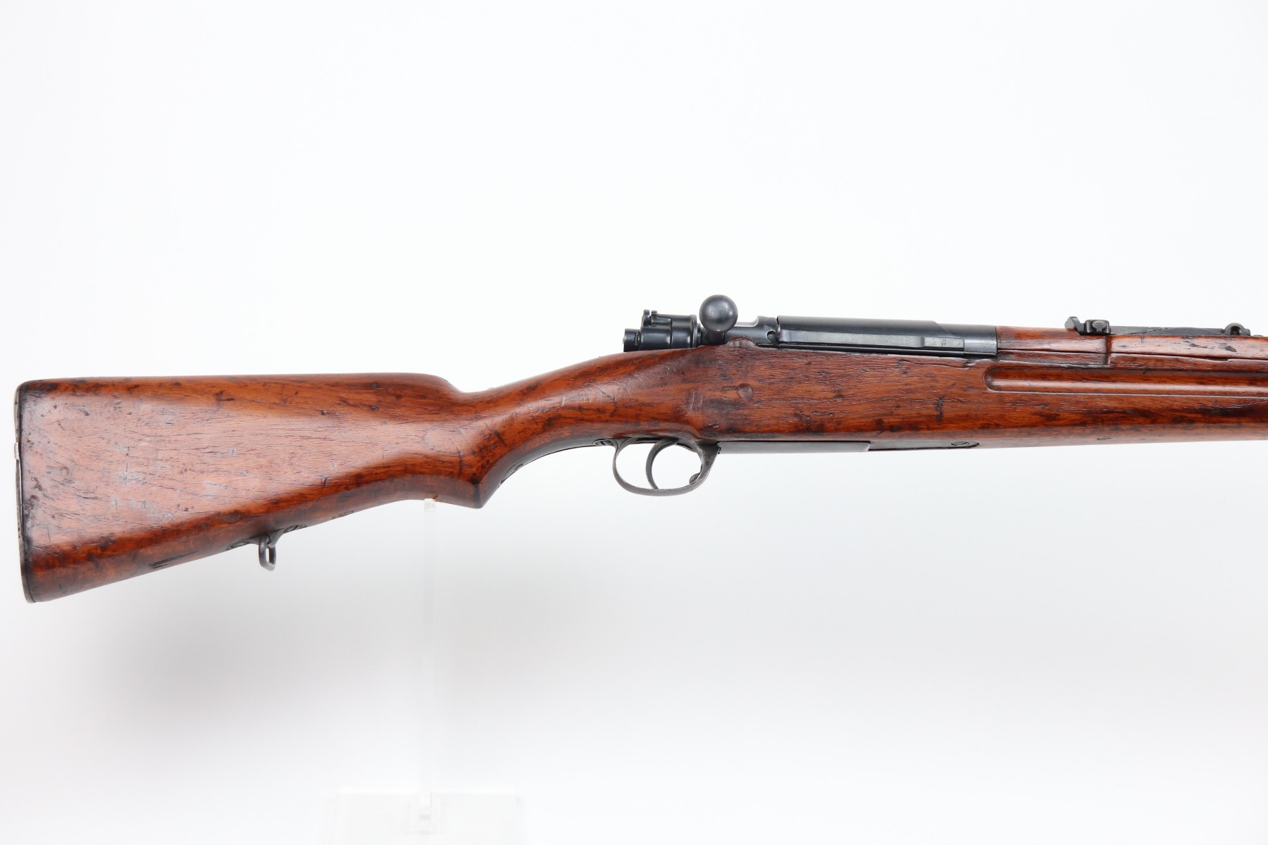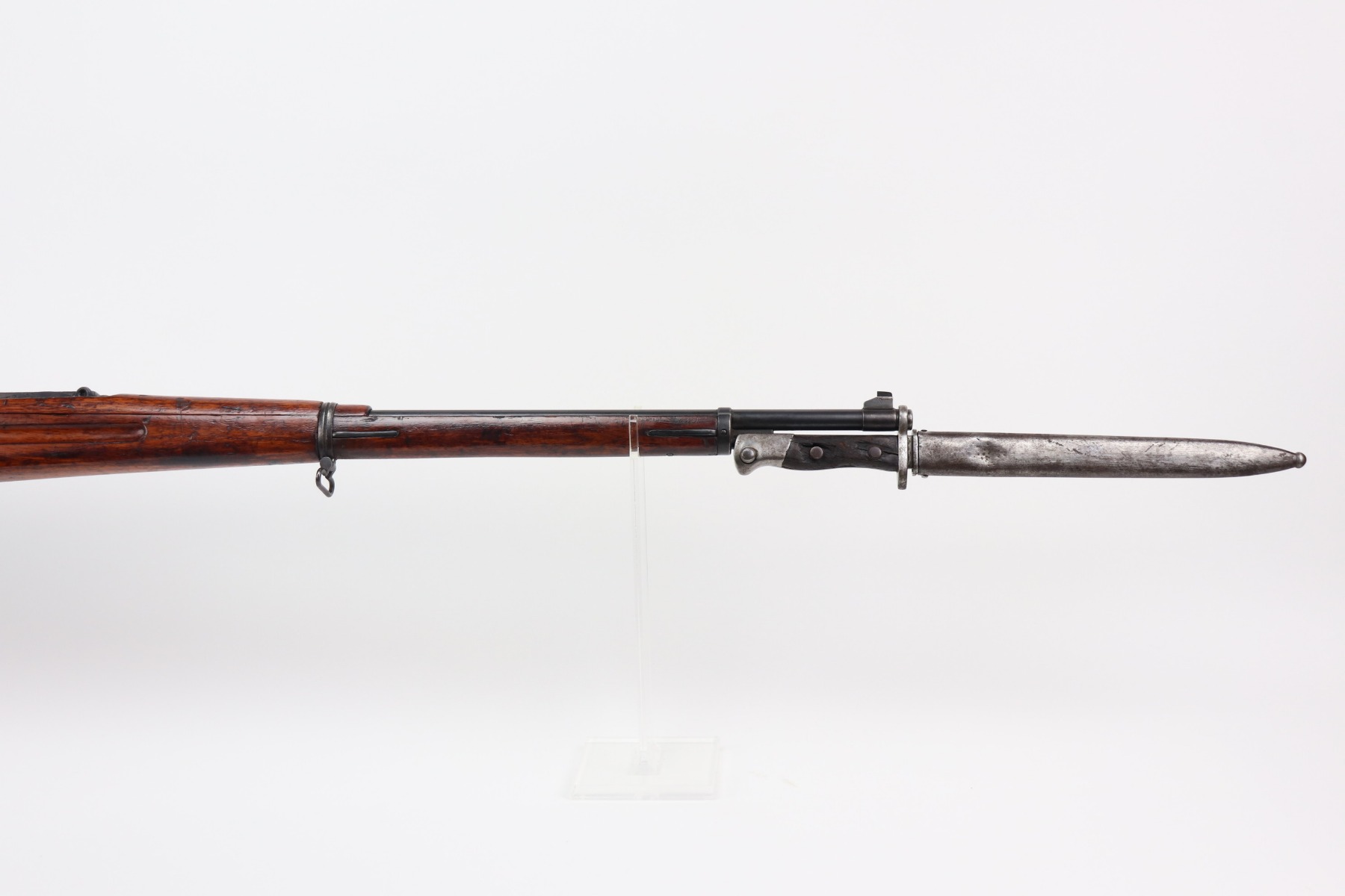 2/22/21 – This is a Siamese Mauser Type 46/66 Rifle, chambered in 8x52mm. It was made for the Siamese military at the Tokyo Arsenal. It was originally a Type 46 rifle, chambered in 8x50mm that was later converted to a more convenient 8x52mm Spitzer cartridge. You can tell because the characters on the adjustable rear sight have been partially ground when the sight was modified. The gun comes with an original dust cover and matching bayonet. The metal parts are minty, retaining virtually all of their finish except for minor wear around the muzzle. The stock has minor dings, dents, and scratches throughout and a more significant gouge on the left side. The bore is excellent – shiny with strong rifling.