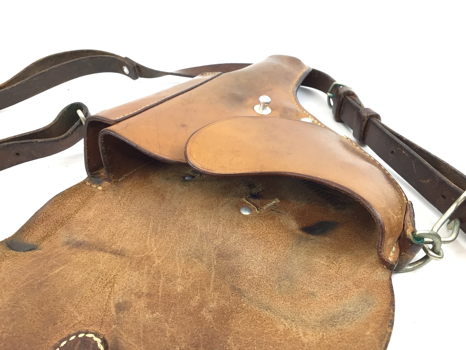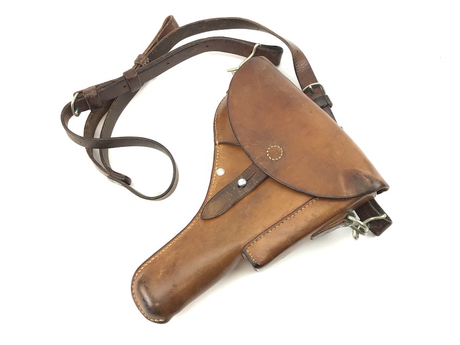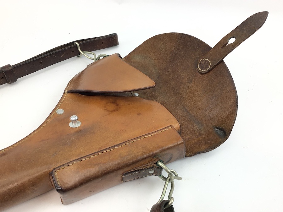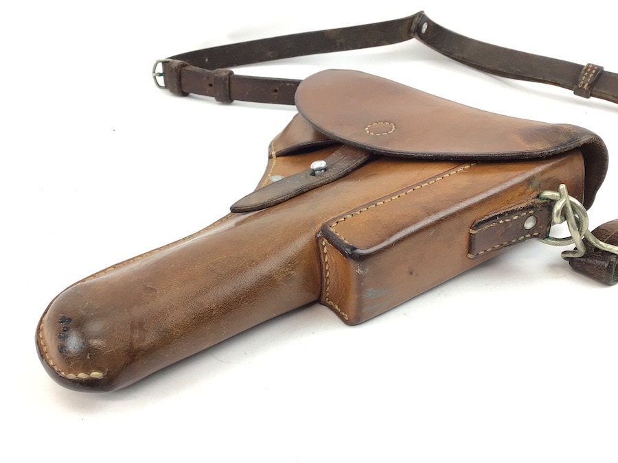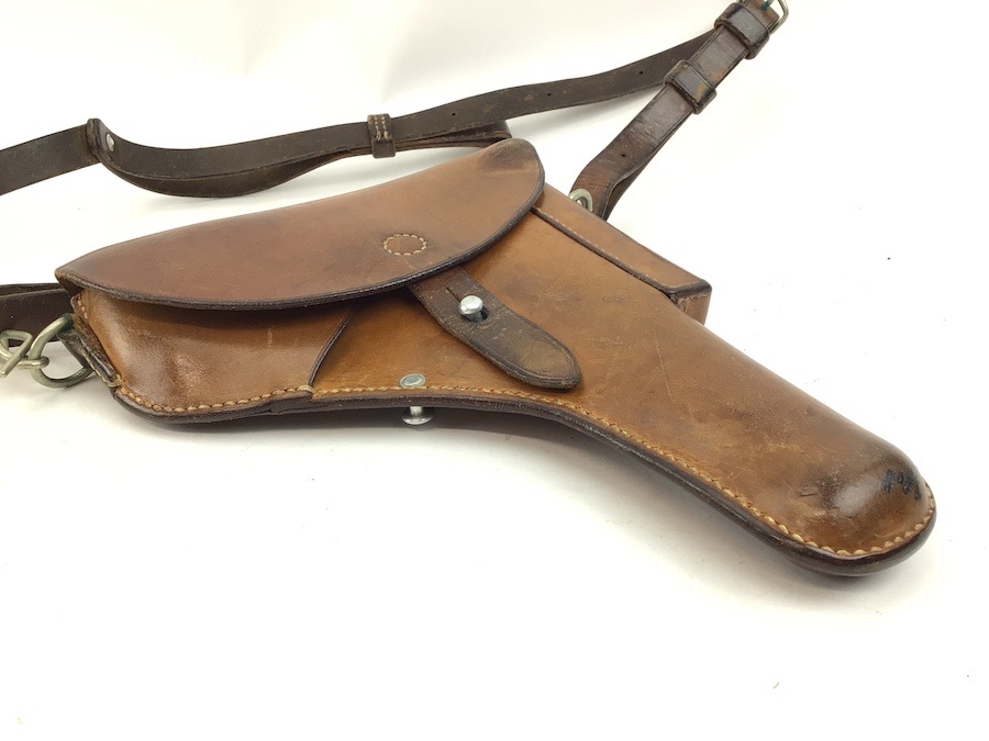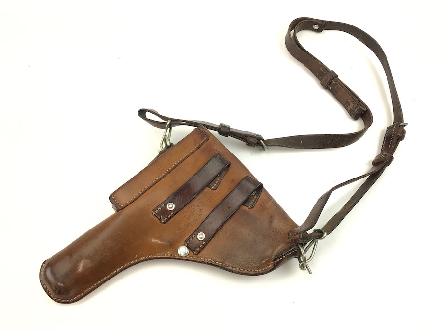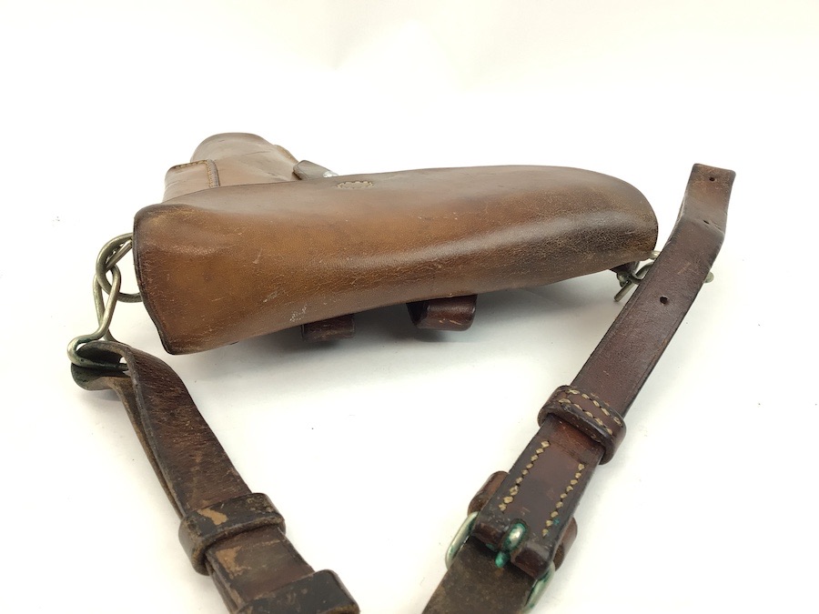 5/31/22 – Original and great condition. This Sig P210 holster has nice leather with intact original stitching. Maker stamped and dated on the back. Features a very nice shoulder strap that is stamped S7 with a Swedish cross. Everything is secure and functional.