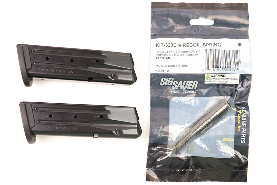 10/6/22 – This is a set of spare parts for a Sig P320 compact pistol. It includes two flat bottom magazines and a recoil spring. The magazines are both in excellent like new condition. The followers and springs are strong and functional. The recoil spring is for a still sealed in its original packaging from Sig Sauer.