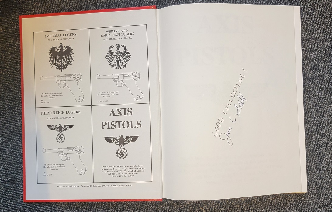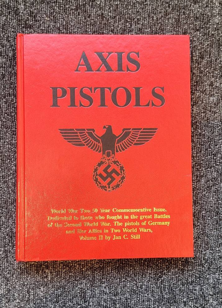 9/22/23 – This is a signed copy of Jan Still’s “Axis Pistols” book. The book is a WW2 50th Anniversary Edition, and is signed by the author on the interior cover page. All pages are excellent and clean. The original fold-out pages on the back are intact and clean as well. There is some mild cosmetic wear on the exterior cover, but overall great condition. A must-have resource for WW2 collectors!