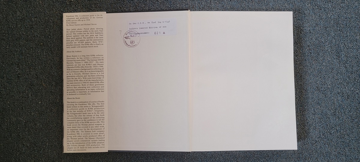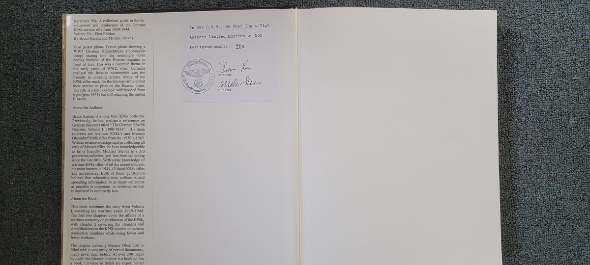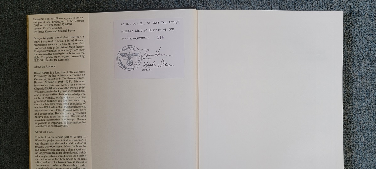 4/3/23 – This is a signed and numbered 3 Volume set of resource books by Bruce Karem and Michael Steves. “Karabiner 98k” is the ultimate collector resource on collecting the German K98 service rifle. The book covers K98 rifle production from development from the Gew 98 through the end of WW2 production in 1944. The volumes are packed full of information and high quality color photographs. This 3 volume set is numbered 21 out of the first 500 volumes printed. Each volume is signed by both authors, and is in excellent condition with cover sleeves and all pages intact. A must have for K98 collectors!