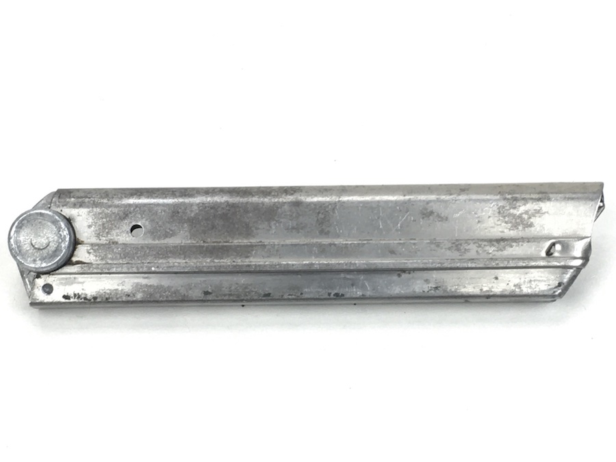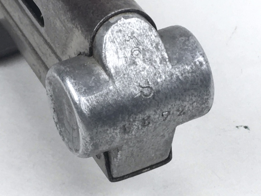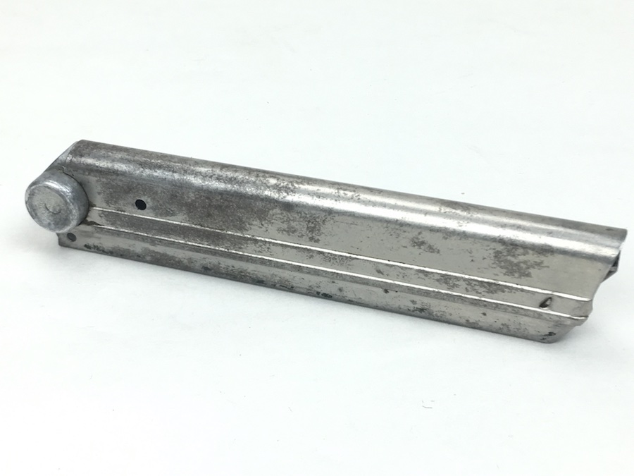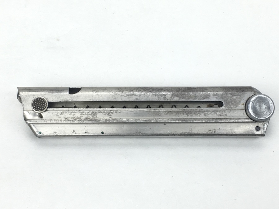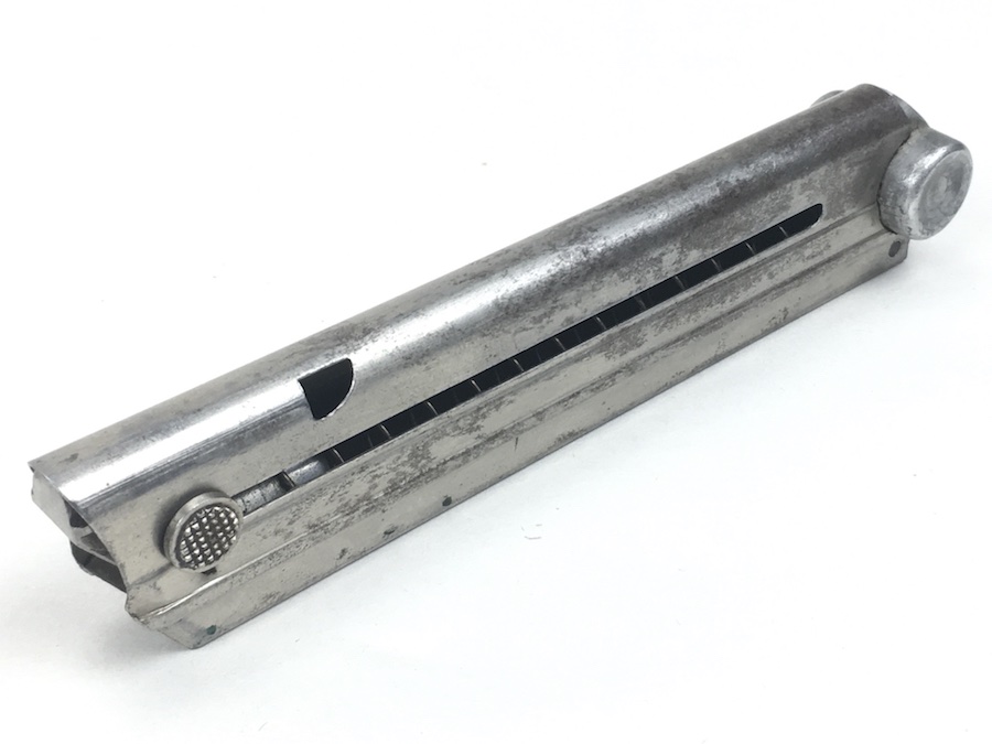 3/28/19 – This is an original WW2 era early Simson Luger magazine. The base of the magazine is stamped with a droop winged eagle/6 proof, which is a rare Simson manufacturing proof stamp. The base is also serial numbered 5572 along with the Simson “S”. Stamps are 100% original. There dark oxidation on the base but no major issues. There are no other markings. The frame of the magazine is early aluminum finish with no bluing and minor patina as shown in photos. The spring is strong and fully functional. Guaranteed original!