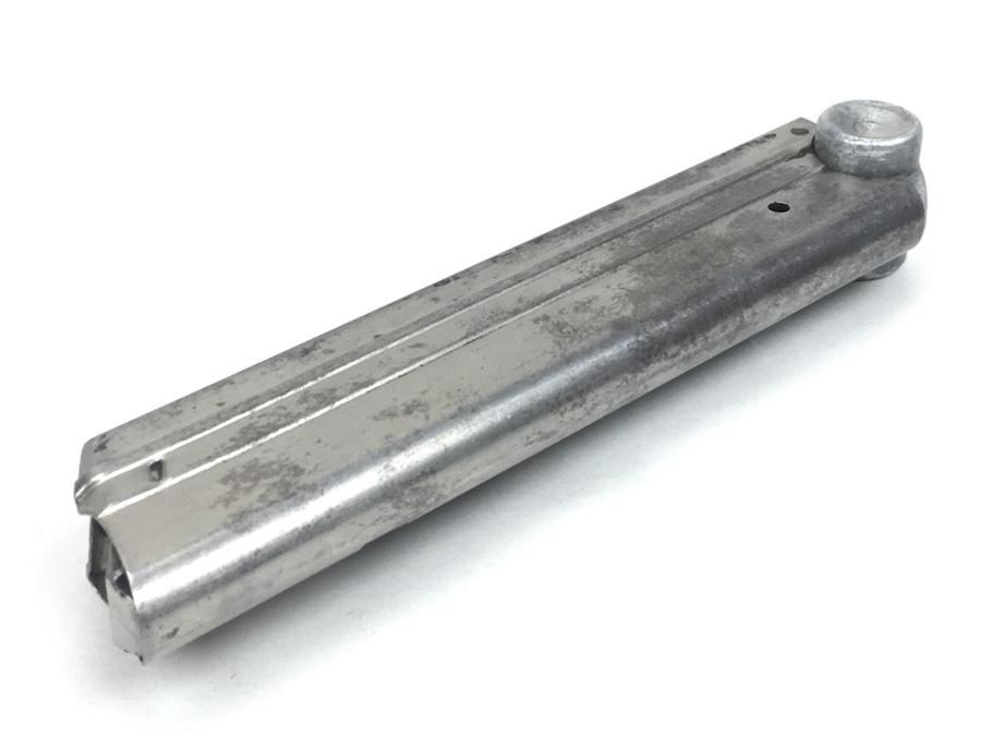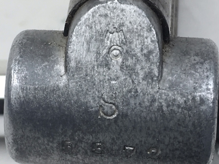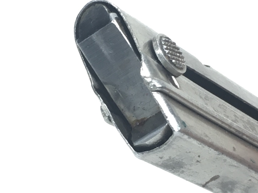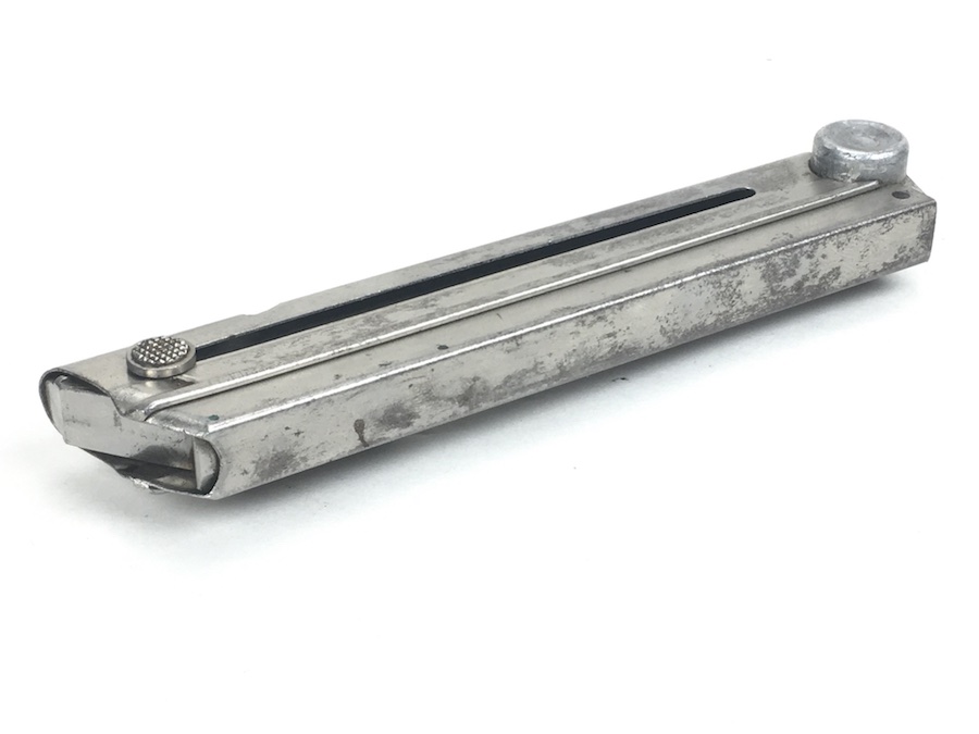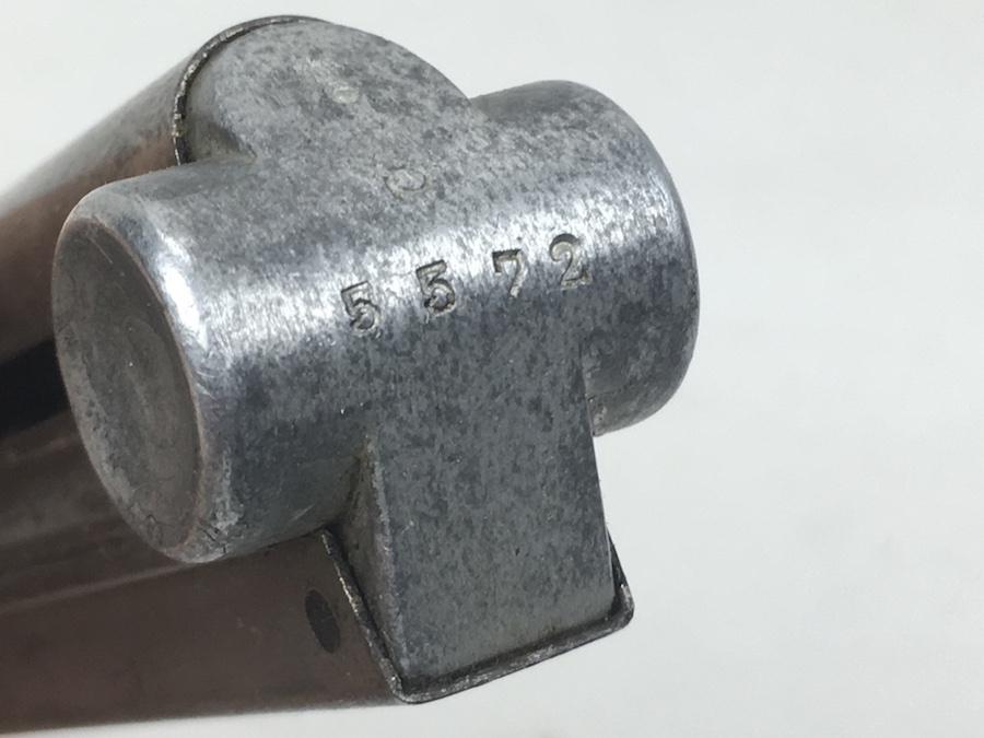 3/28/19 – This is an original WW2 era early Simson Luger magazine. The base of the magazine is stamped with a droop winged eagle/6 proof, which is a rare Simson manufacturing proof stamp. The base is also serial numbered 5572 along with the Simson “S”. Stamps are 100% original. There dark oxidation on the base but no major issues. There are no other markings. The frame of the magazine is early aluminum finish with no bluing and minor patina as shown in photos. The spring is strong and fully functional. Guaranteed original!