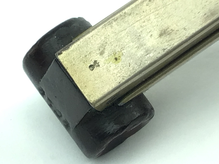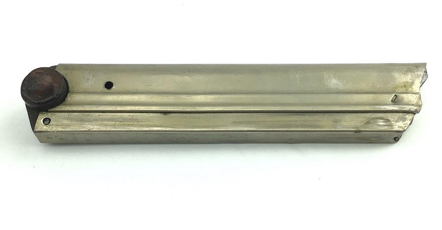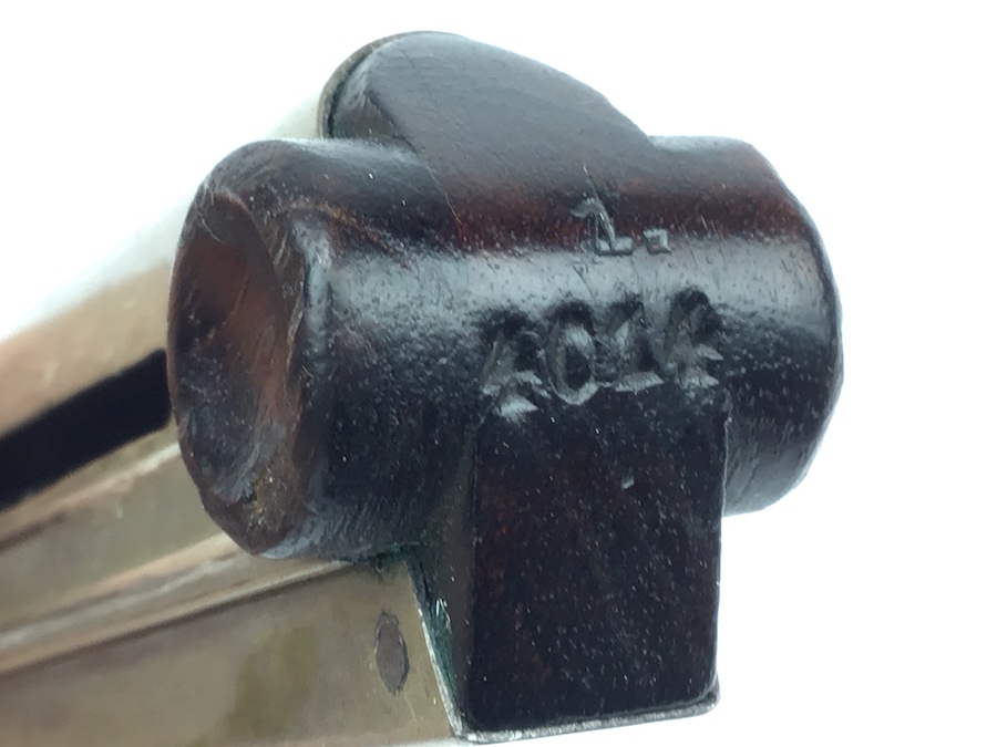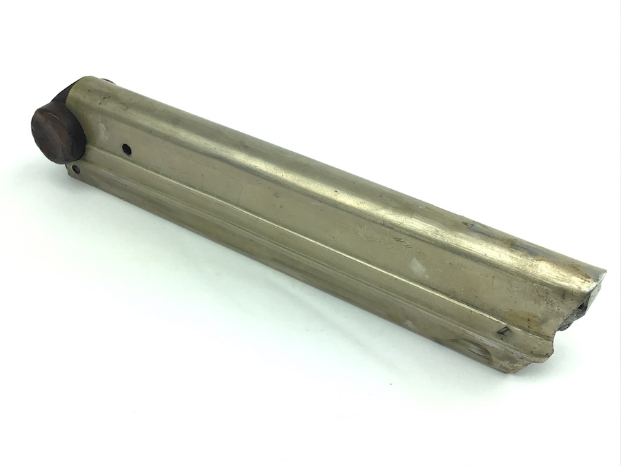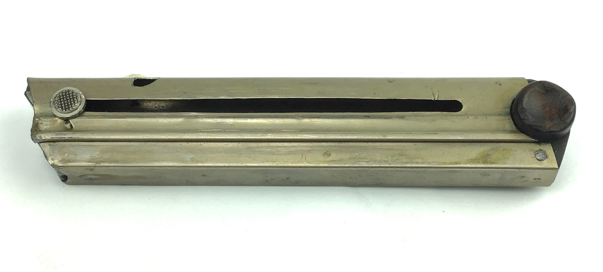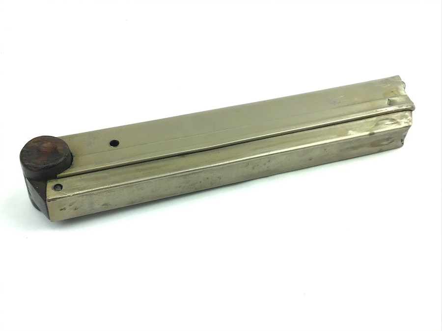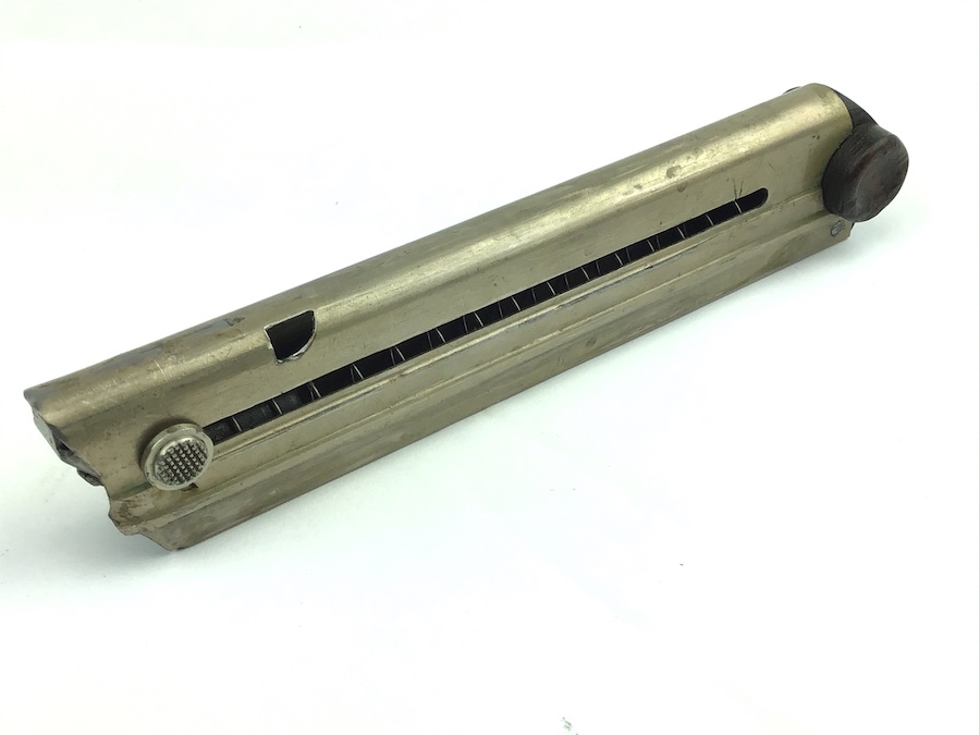 10/26/20 – This is an original WW1 era Simson Luger magazine. The spine of the magazine is stamped with a droop winged eagle/6 proof, which is a rare Simson manufacturing proof stamp. The base is serial numbered 4014 along with the numeral “1”. Stamps are 100% original. There are no other markings. The frame of the magazine is early aluminum finish with no bluing and minor patina as shown in photos. A few minor “dings” in the spine , but still fully functional.