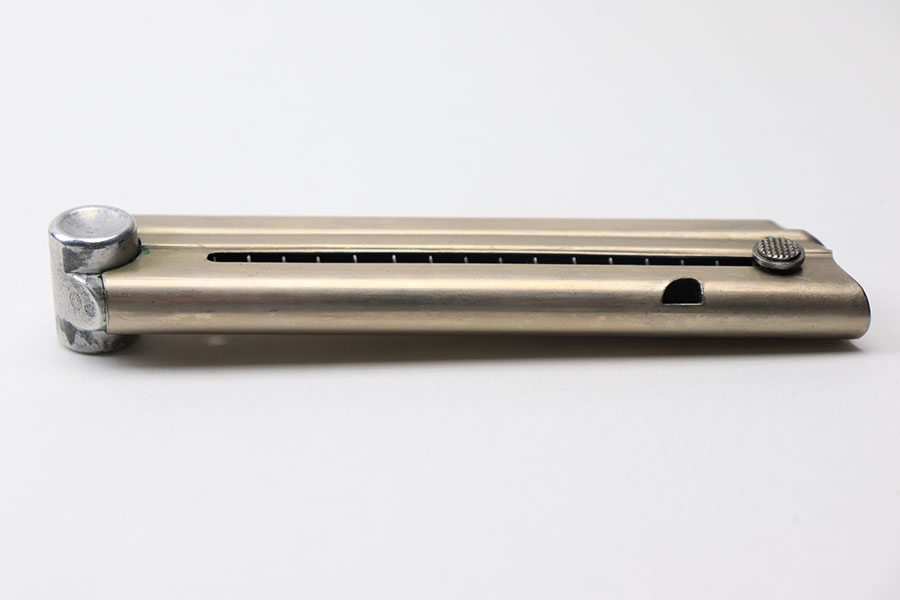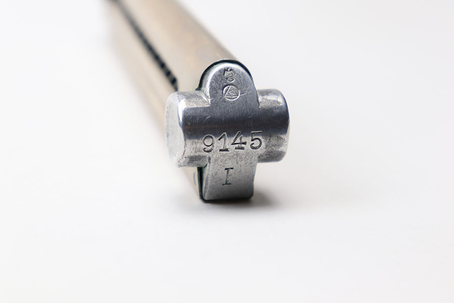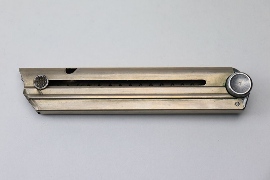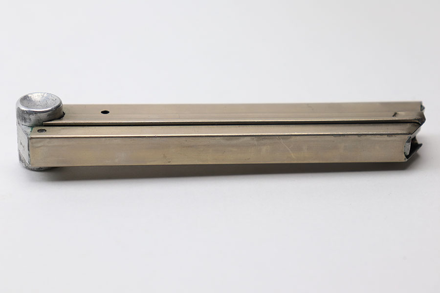 5/13/21 – This is a rare, somewhat unique Simson luger magazine. Excellent overall condition with a beautiful tube and a clean base. The base is serial numbered and proofed with a Simson eagle/6 and rare “triangle S” proof stamp underneath. The spring is strong and fully functional.
