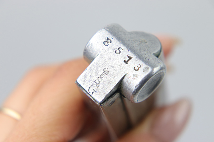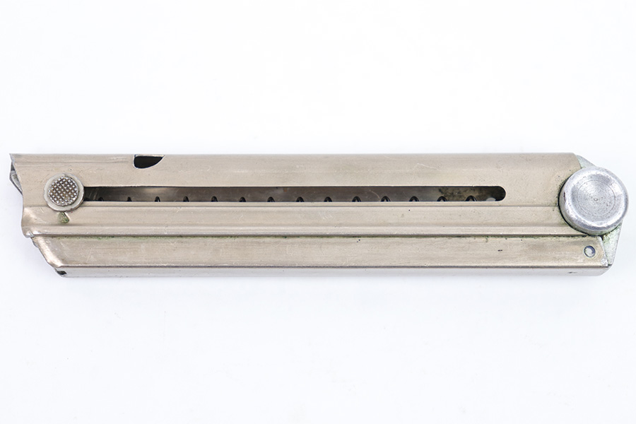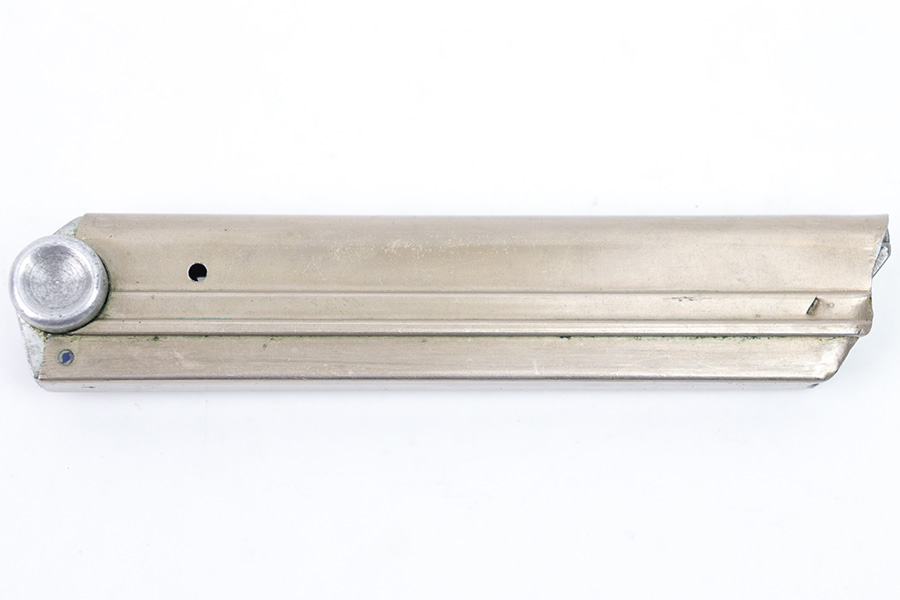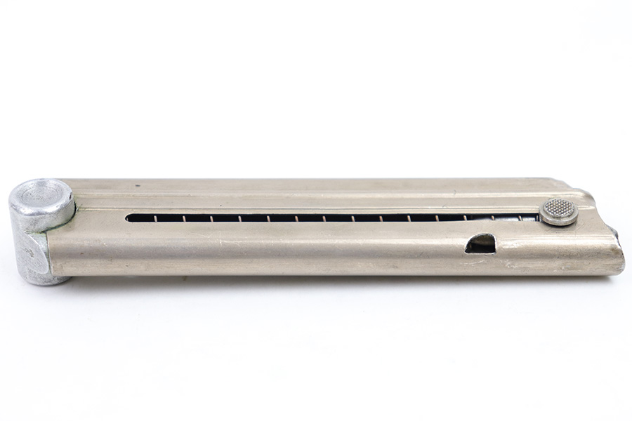 1/30/23 – This is an excellent condition, all original Simson Luger magazine from early / pre WW2. The magazine has an early style nickel tube and aluminum base. The base is stamped with a serial number, two eagle/6 Simson proof stamps, and a “G” stamp. We’re not sure the significance of the “G” marking, but it’s likely this could be for a 1935 production pistol. The tube is stamped on the spine with another Simson proof stamp. Beautiful condition with a fully functional spring.