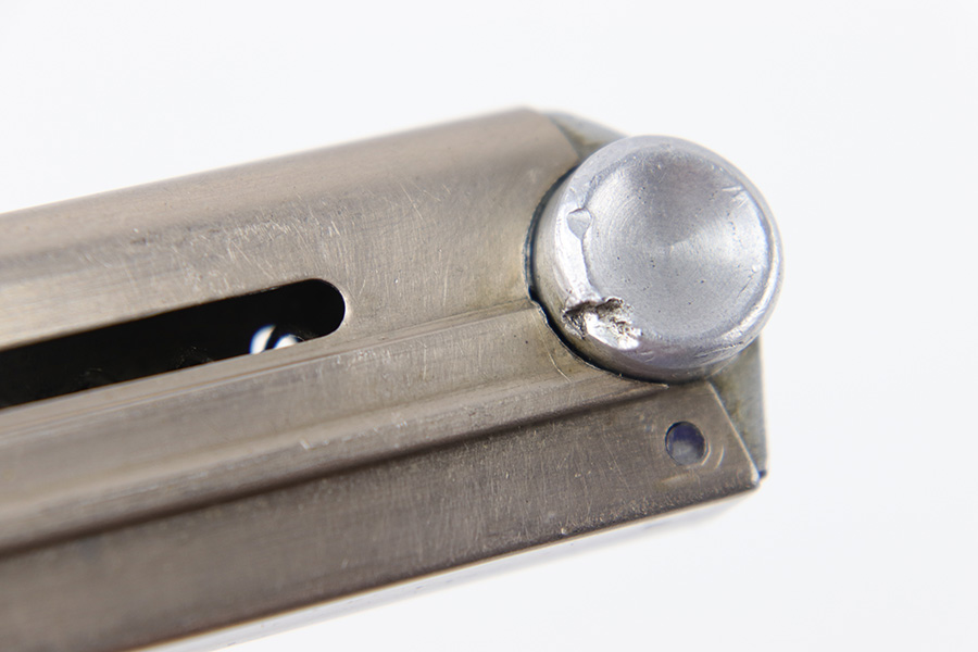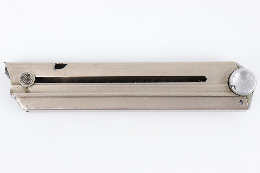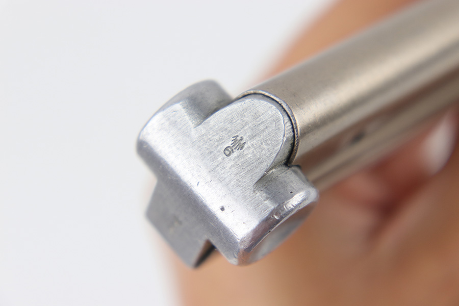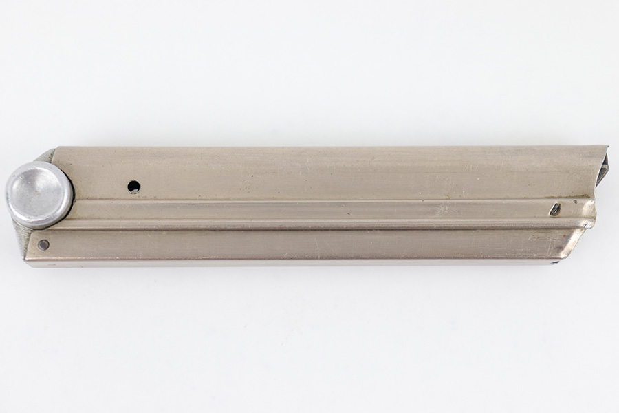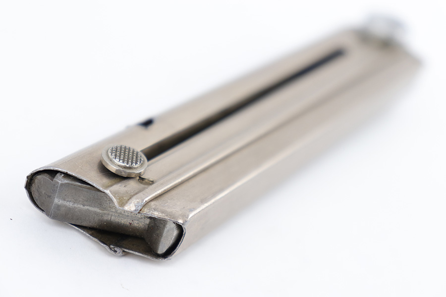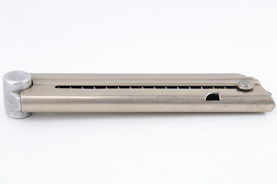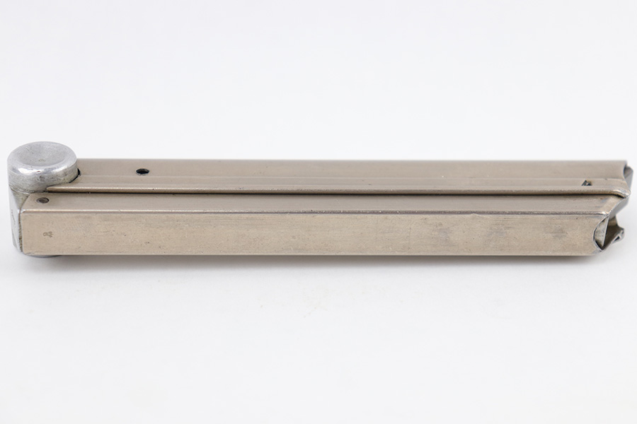 5/23/23 – This is a rare variation of a Luger magazine manufactured by Simson. The magazine features an early nickel tube and an aluminum base. The base is proof stamped with two eagle 6 Simson factory proofs, along with an “S” stamp on the lower part of the base. Notably, there is no serial number, nor any evidence of one ever being present, making this a desirable match for most examples. The magazine’s spine also bears a Simson proof stamp. There’s minimal surface wear, and the spring remains fully functional.